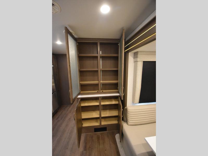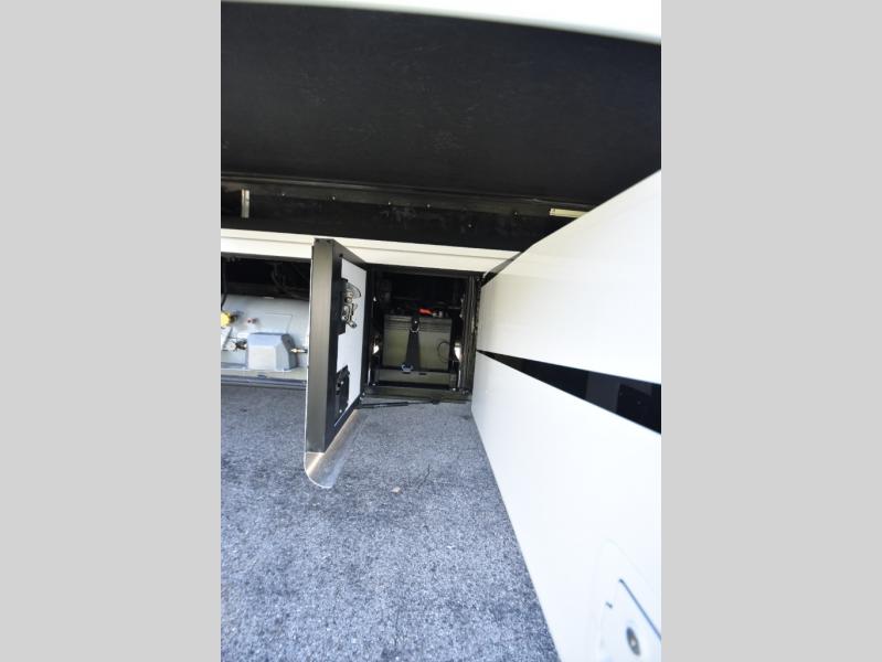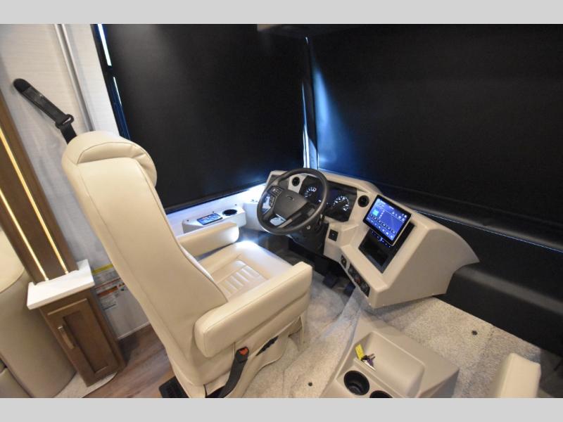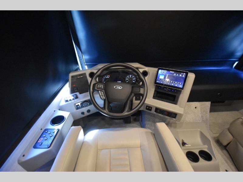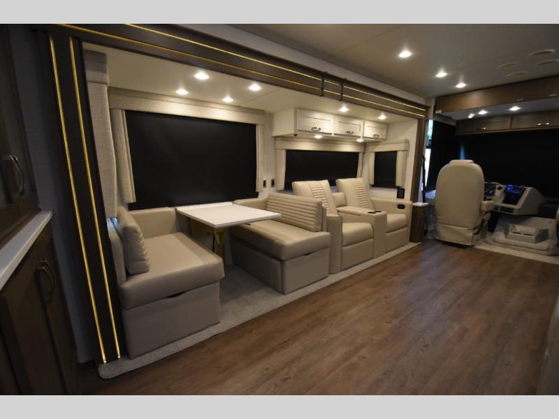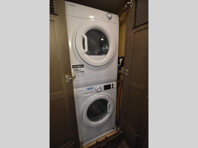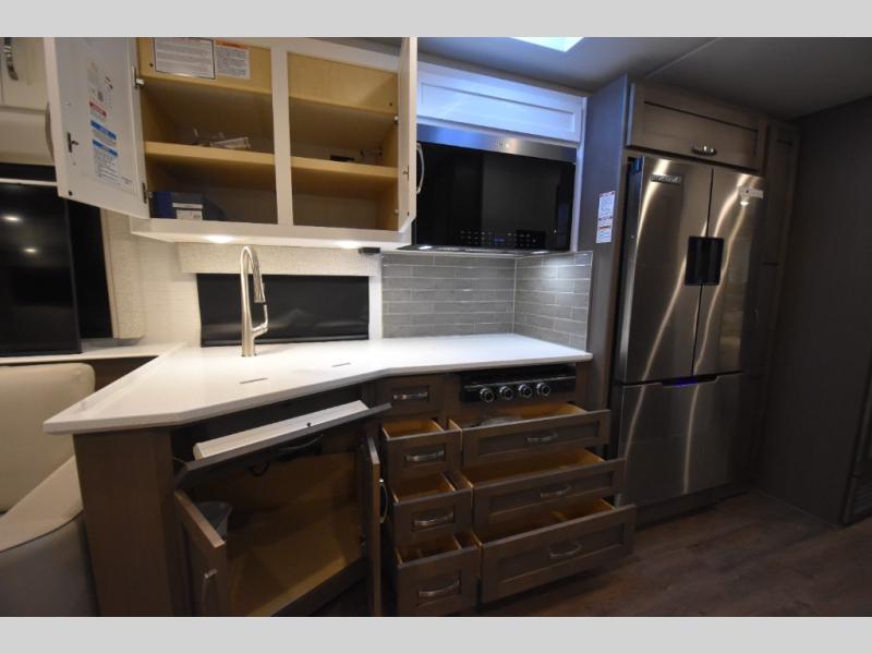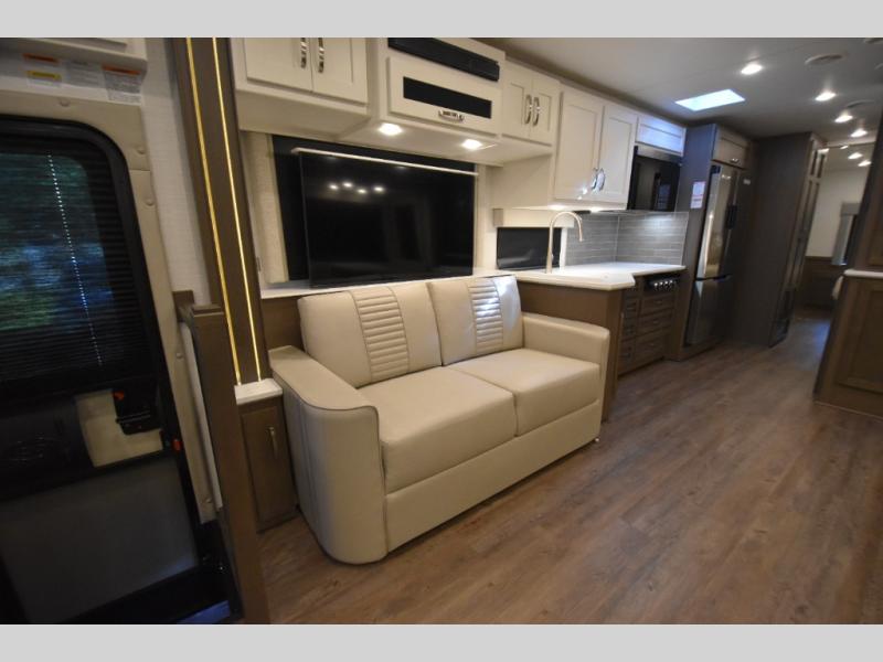 Four slide outs make this motorhome both spacious and comfortable for all your excursions! The USB charger at the passenger area will be a big plus if you need to telecommute on the way to the campground, and your guests can stay comfortable on the two comfort lounge sofas or the booth dinette. This model includes a wardrobe right across from the full bath that can be optioned out for an optional Splendide stacked washer and dryer, and the rear private bedroom will feel just like home with its king bed and shirt wardrobe. There is even a bedroom LED TV, along with the living room LED TV on power lift!