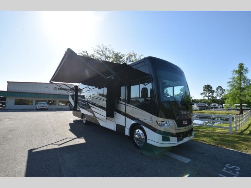 Each Bay Star Class A gas motorhome by Newmar delivers a smooth ride thanks to the standard electronic stability control, along with the 7.3-liter V8 engine with 350 HP and 468 lb./ft. of torque. The exterior is sure to turn heads with its full-paint Masterpiece Finish, and you'll have three interior decor choices and three wood choices to truly make the coach your own. Each model includes newly styled Williamsburg furniture, luxurious vinyl plank flooring, polished solid surface countertops in the kitchen, plus many more comforts. Head outside to find lit basement storage, a 5.5kW Onan generator with remote switch, and smart level hydraulic leveling jacks with a Bluetooth compatible touch pad for set up easy as 1-2-3! You can further customize your coach with the many options that are offered!
