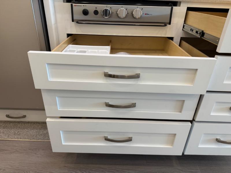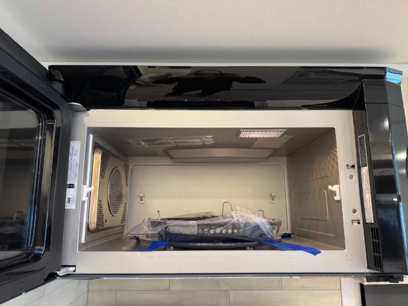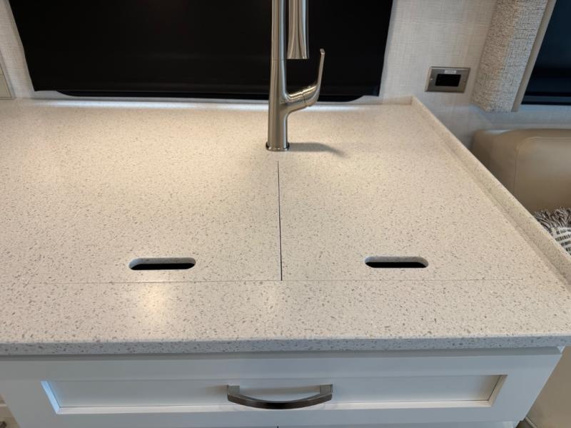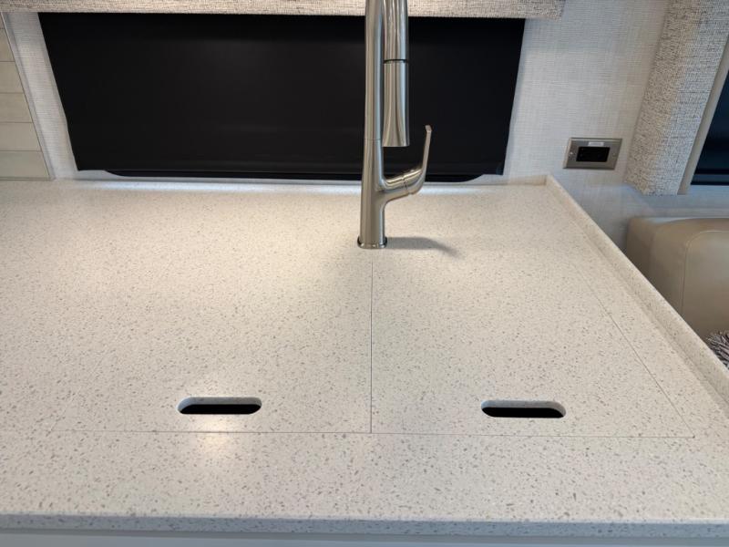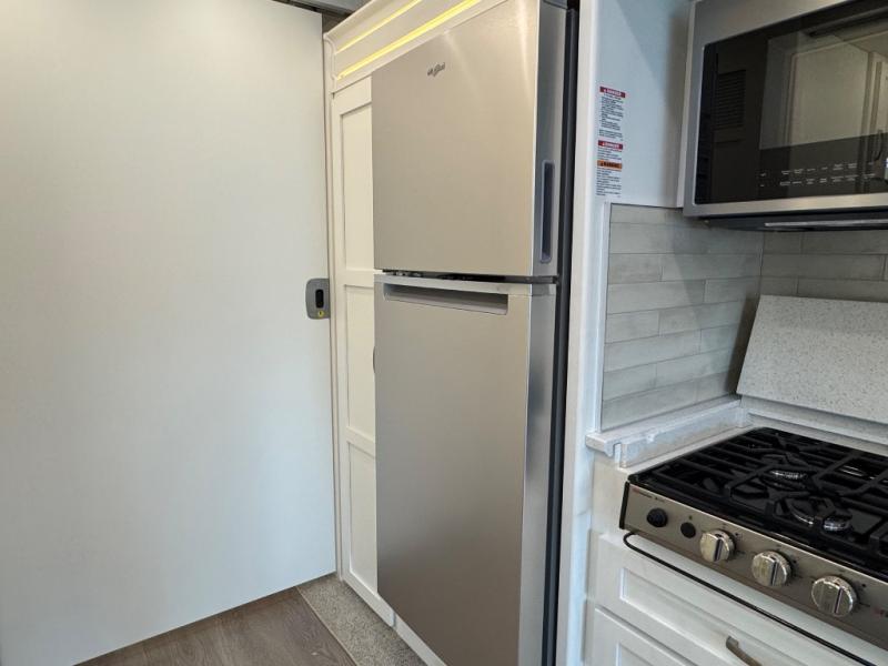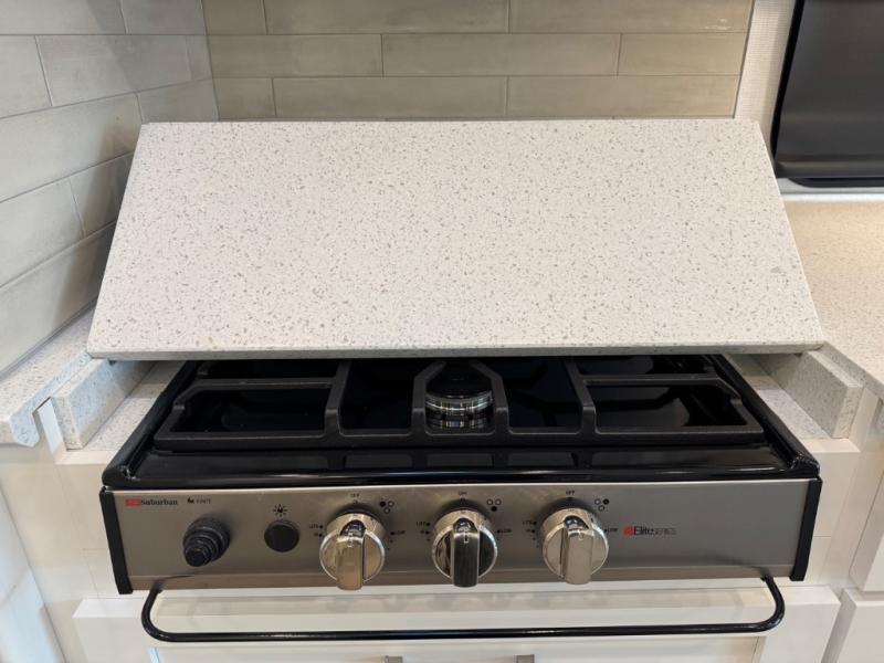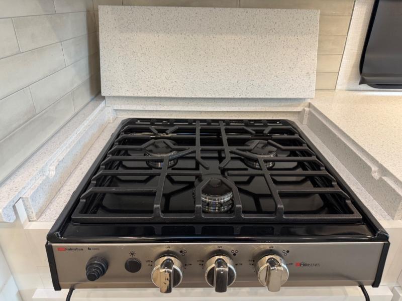 Gourmet Kitchen: The well-equipped kitchen includes solid-surface countertops, a residential refrigerator, a convection microwave, and a three-burner cooktop—perfect for preparing meals on the go.