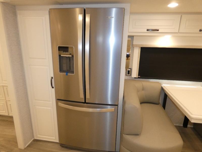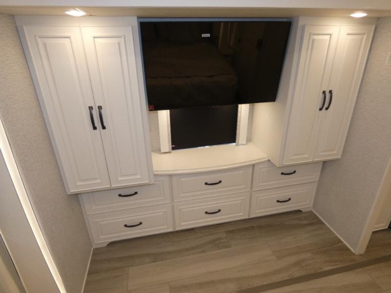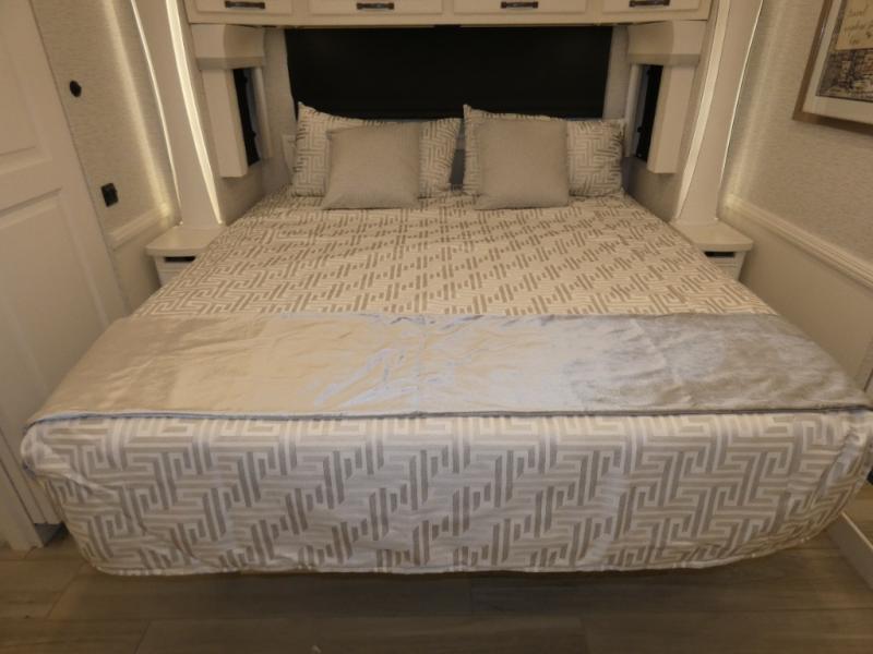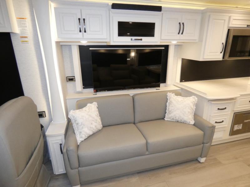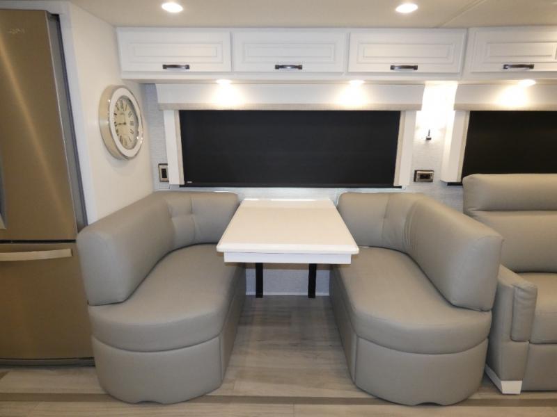 Luxury is waiting for you in this spacious Dutch Star Class A diesel motorhome. The full-wall slide plus two additional slides will open up the whole unit for a more at-home feel. Relax on the theater seats or read a book on the jackknife sofa. The booth dinette will be the perfect place to catch up on some work while you're away from home. Easily prepare breakfast, lunch, and dinner on the all-electric induction cooktop, or use the convenient stainless steel convection microwave with an air fryer feature. This model features a master suite with a pillowtop king bed, dual wardrobes and a dresser, plus an LED TV. You will love the rear bath cathedral ceiling that will add additional height, plus there is plenty of storage space and two bath sinks so that you and your spouse can freshen up at once!