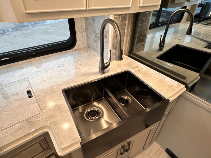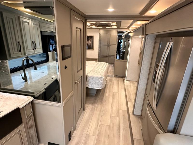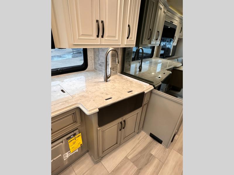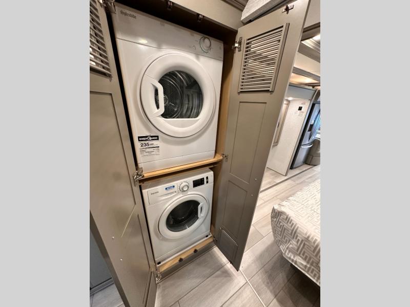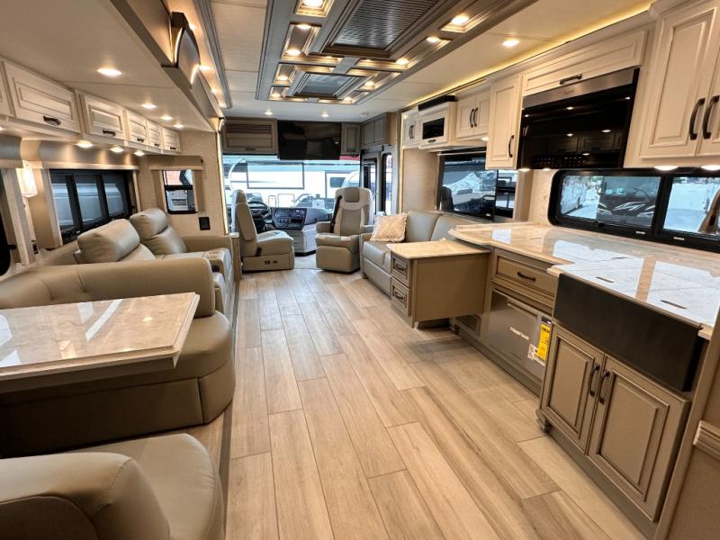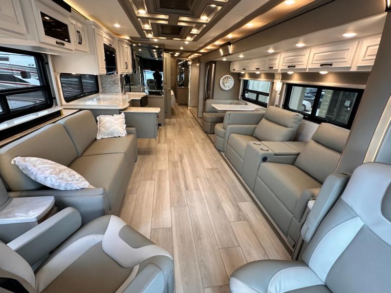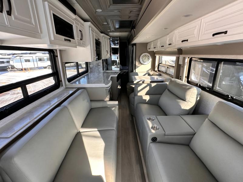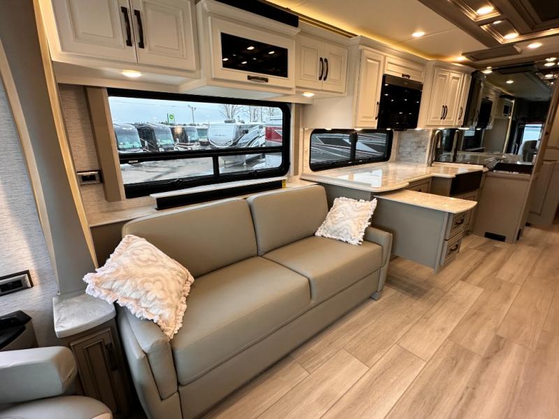 Luxury is waiting for you in this spacious Dutch Star Class A diesel motorhome that can comfortably sleep six each night. The full-wall slide plus two additional slides will open up the whole unit for a more at-home feel. Relax on the hide-a-bed sofa or read a book on the jackknife sofa. The hide-a-leaf dinette will be the perfect place to catch up on some work while you're away from home. Easily prepare breakfast, lunch, and dinner on the all-electric induction cooktop, or use the convenient stainless steel convection microwave with an air fryer feature. This model features a master suite with a pillowtop king bed, dual wardrobes and a dresser, plus an LED TV. You will love the rear bath cathedral ceiling that will add additional height, plus there is plenty of storage space and two bath sinks so that you and your spouse can freshen up at once! Specifications shown are with the standard Freightliner tag axle chassis. See dealer for details if optional Spartan K2 tag axle chassis is selected.