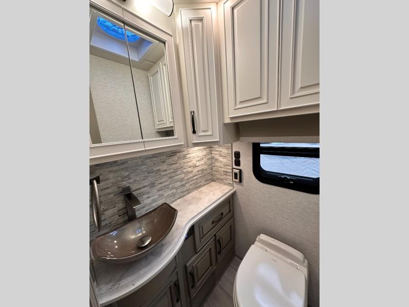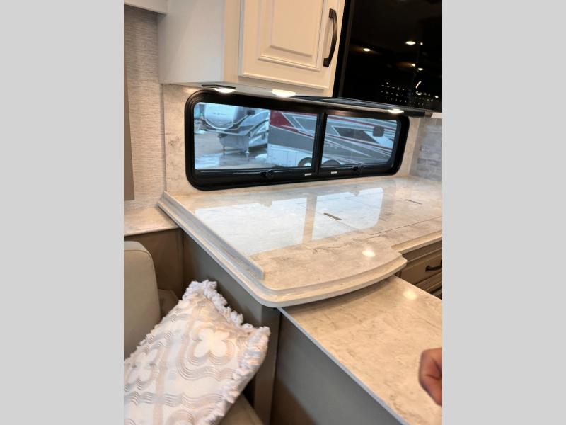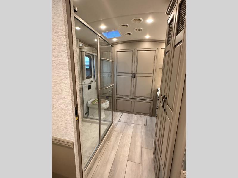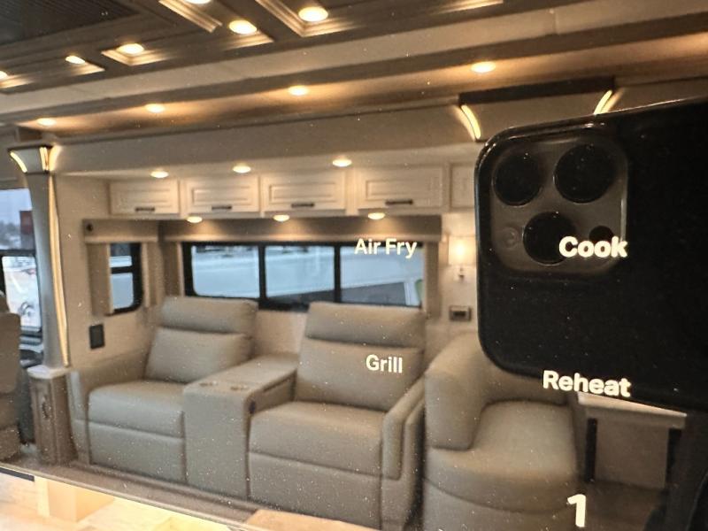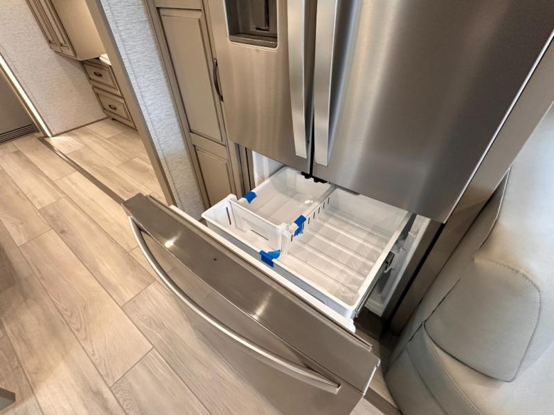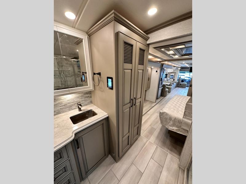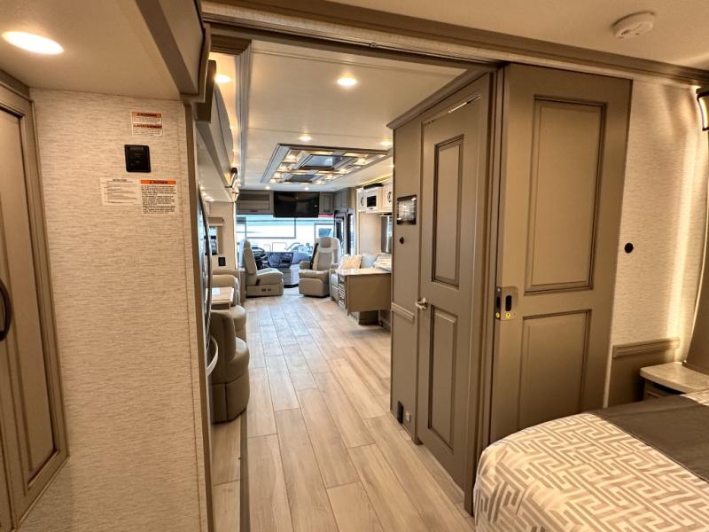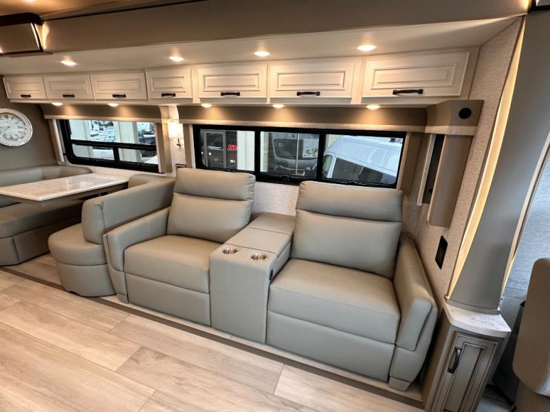 Luxury is waiting for you in this spacious Dutch Star Class A diesel motorhome that can comfortably sleep six each night. The full-wall slide plus two additional slides will open up the whole unit for a more at-home feel. Relax on the hide-a-bed sofa or read a book on the jackknife sofa. The hide-a-leaf dinette will be the perfect place to catch up on some work while you're away from home. Easily prepare breakfast, lunch, and dinner on the all-electric induction cooktop, or use the convenient stainless steel convection microwave with an air fryer feature. This model features a master suite with a pillowtop king bed, dual wardrobes and a dresser, plus an LED TV. You will love the rear bath cathedral ceiling that will add additional height, plus there is plenty of storage space and two bath sinks so that you and your spouse can freshen up at once! Specifications shown are with the standard Freightliner tag axle chassis. See dealer for details if optional Spartan K2 tag axle chassis is selected.