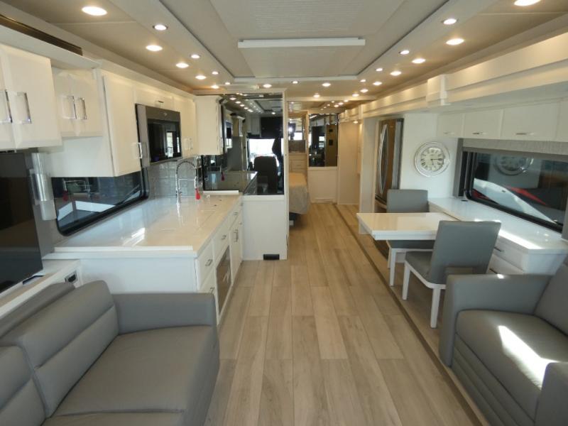 Don't pass up your opportunity to travel in pure luxury with this motorhome! The master suite has a king bed slide for a good night's rest across from a dresser with a Samsung LED TV and shirt wardrobes on either side. Attached to the bedroom is your very own full rear bathroom which has a 40" x 32" shower with a seat next to a linen closet and wardrobe, as well as a Splendide two-piece washer and dryer next to the vanity sink. The chef will have everything they need to prepare delicious home cooked meals including a cabinet pull-out, a stainless steel 30" convection microwave with air fryer feature and a Whirlpool 19.7 cu. ft. refrigerator to keep the perishables fresh, plus the half bathroom is by the kitchen for quick bathroom breaks while cooking. Enjoy your meals at the hide-a-leaf dinette and relax on either the 84" hide-a-bed sofa or the 62" jackknife sofa while watching your favorite movies on the Samsung LED TV on power lift!
