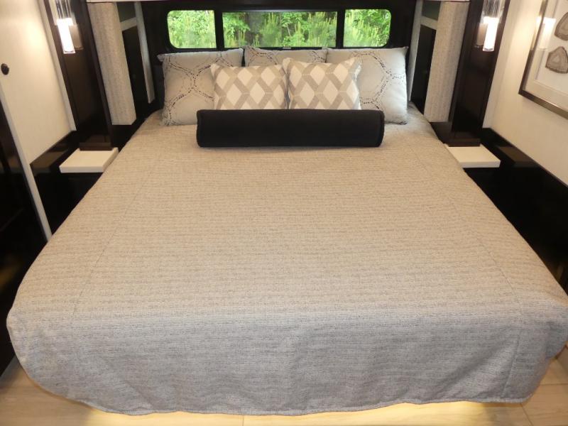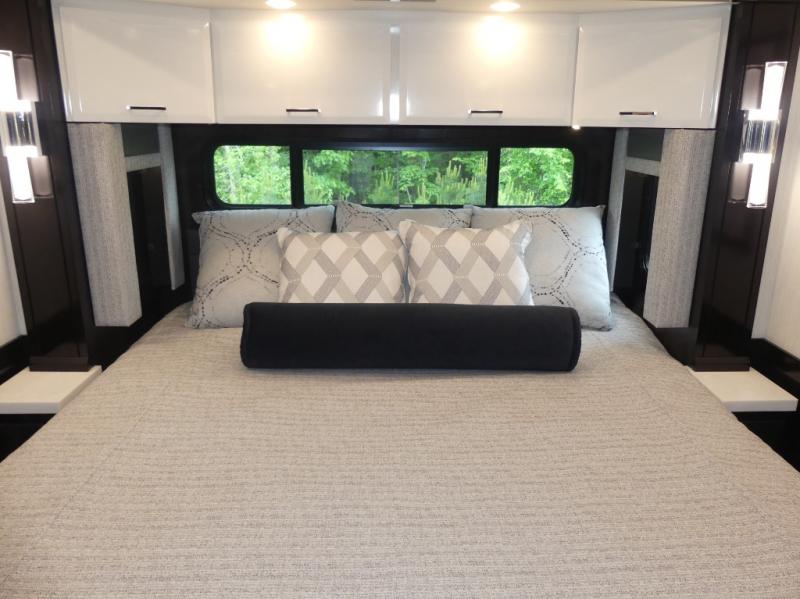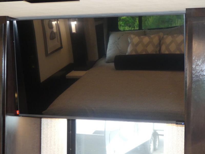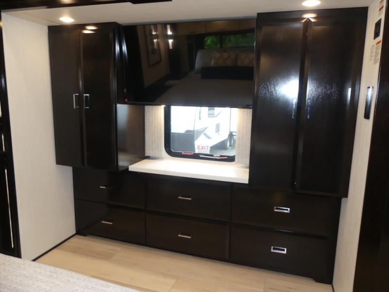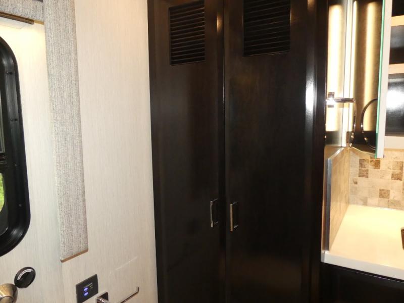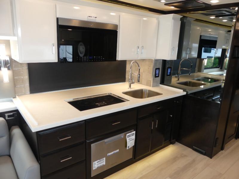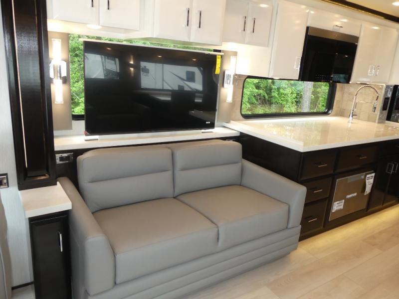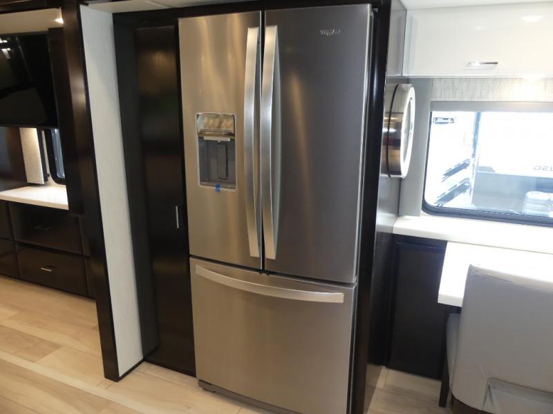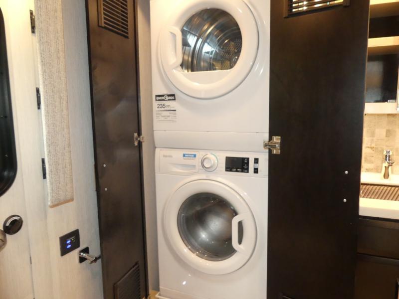 Don't pass up your opportunity to travel in pure luxury with this motorhome! The master suite has a king bed slide for a good night's rest across from a dresser with a Samsung LED TV and shirt wardrobes on either side. Attached to the bedroom is your very own full rear bathroom which has a 40" x 32" shower with a seat next to a linen closet and wardrobe, as well as a Splendide two-piece washer and dryer next to the vanity sink. The chef will have everything they need to prepare delicious home cooked meals including a cabinet pull-out, a stainless steel 30" convection microwave with air fryer feature and a Whirlpool 19.7 cu. ft. refrigerator to keep the perishables fresh, plus the half bathroom is by the kitchen for quick bathroom breaks while cooking. Enjoy your meals at the hide-a-leaf dinette and relax on either the theater seats or the 62" jackknife sofa while watching your favorite movies on the Samsung LED TV on power lift!
