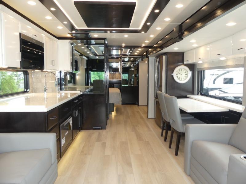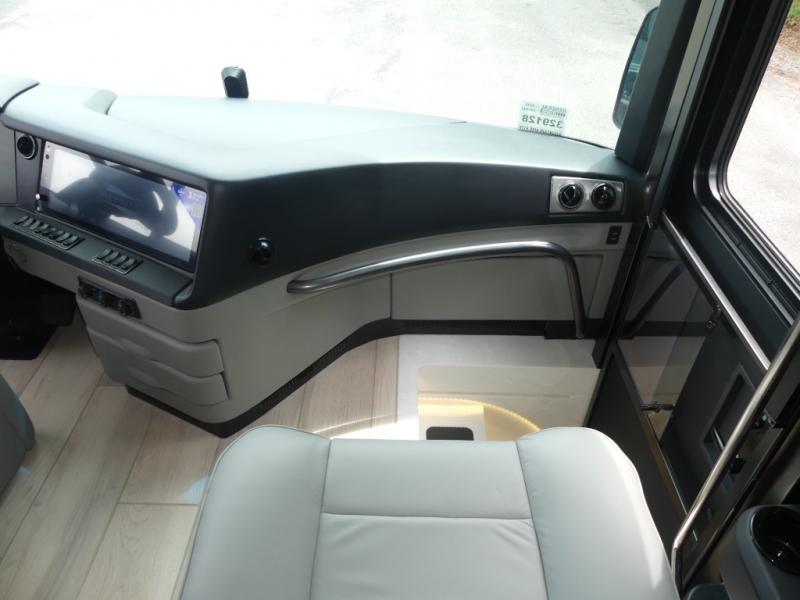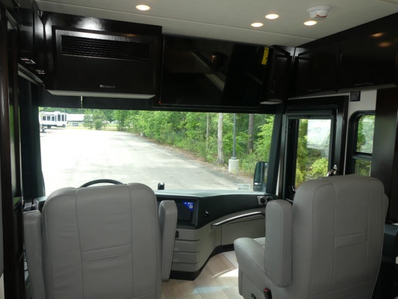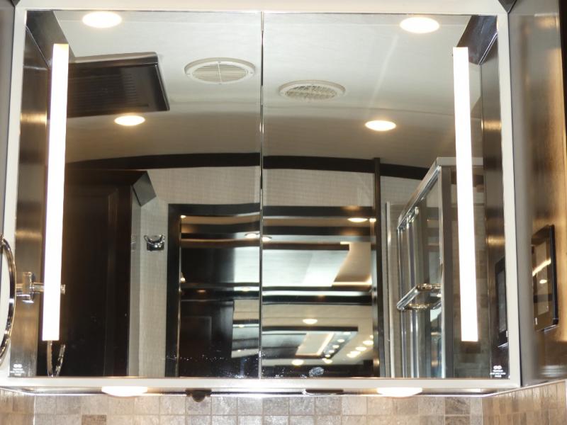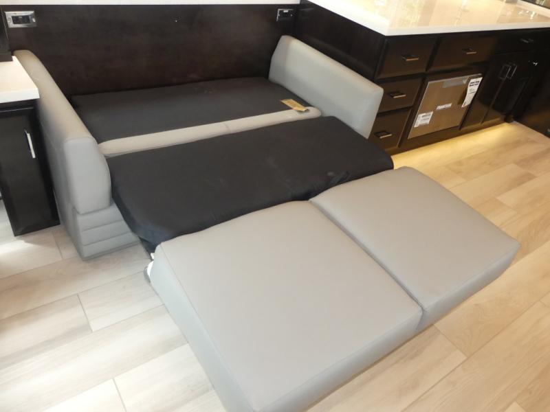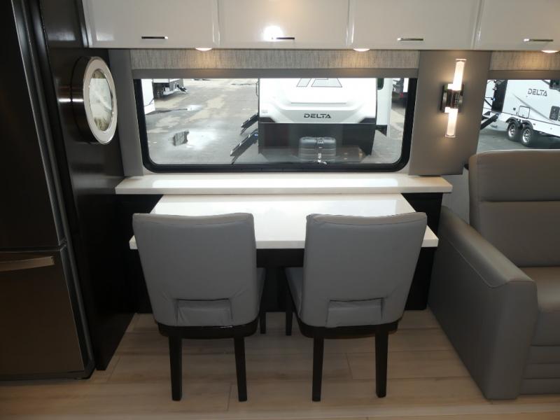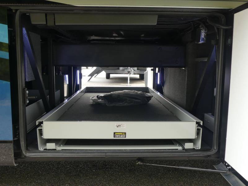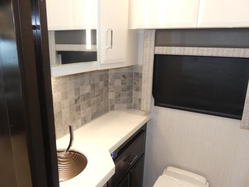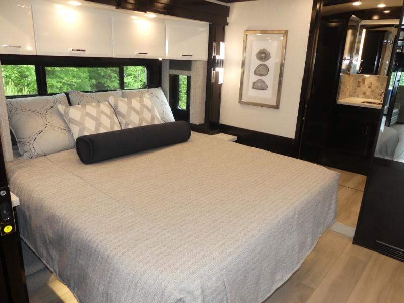 Don't pass up your opportunity to travel in pure luxury with this motorhome! The master suite has a king bed slide for a good night's rest across from a dresser with a Samsung LED TV and shirt wardrobes on either side. Attached to the bedroom is your very own full rear bathroom which has a 40" x 32" shower with a seat next to a linen closet and wardrobe, as well as a Splendide two-piece washer and dryer next to the vanity sink. The chef will have everything they need to prepare delicious home cooked meals including a cabinet pull-out, a stainless steel 30" convection microwave with air fryer feature and a Whirlpool 19.7 cu. ft. refrigerator to keep the perishables fresh, plus the half bathroom is by the kitchen for quick bathroom breaks while cooking. Enjoy your meals at the hide-a-leaf dinette and relax on either the theater seats or the 62" jackknife sofa while watching your favorite movies on the Samsung LED TV on power lift!