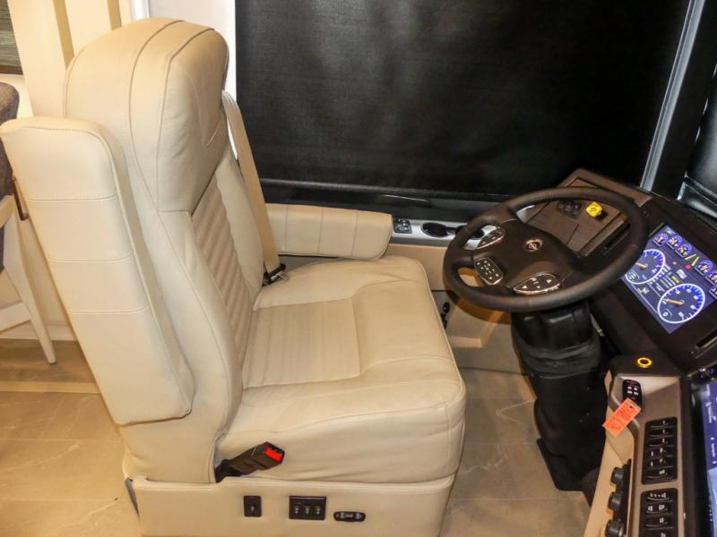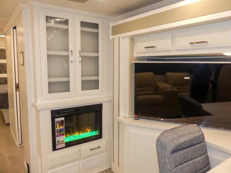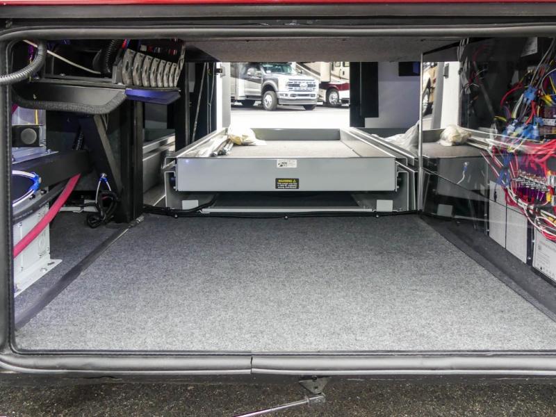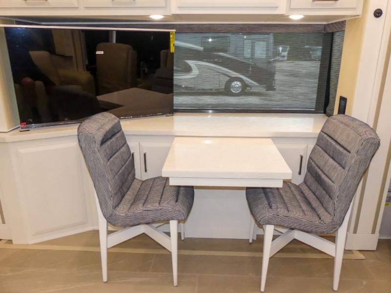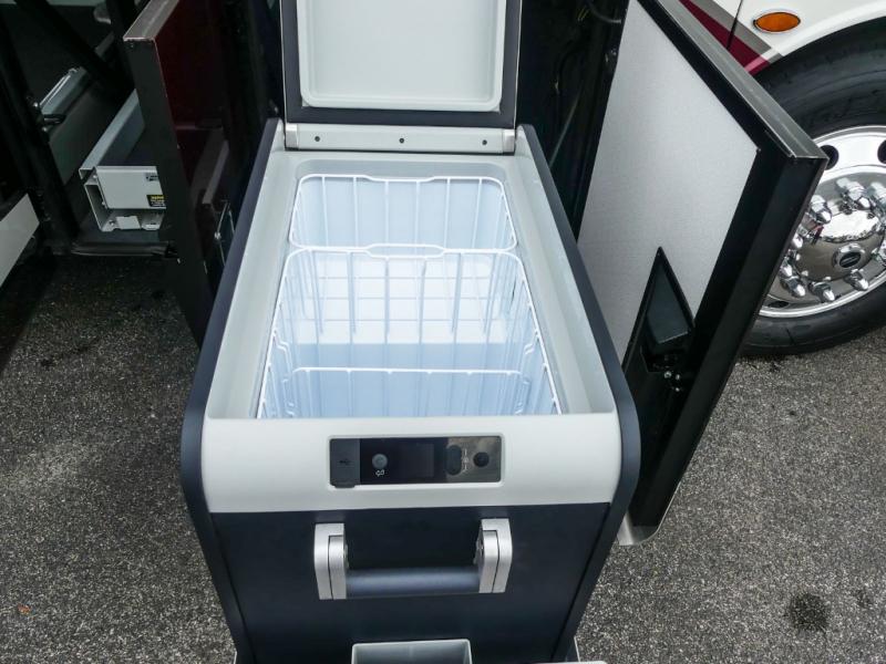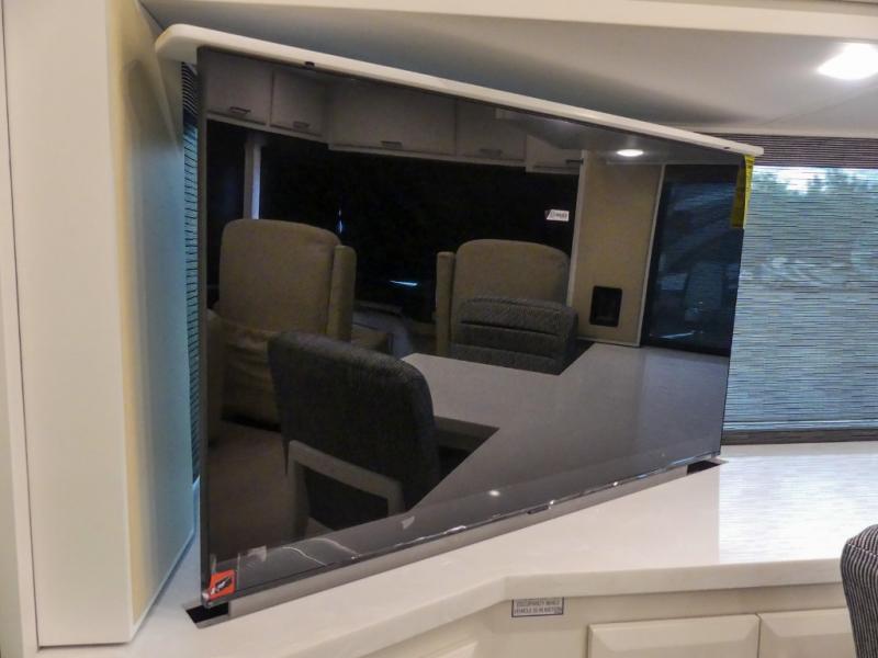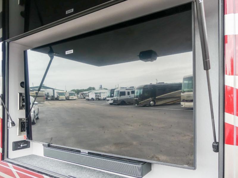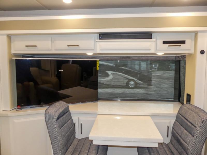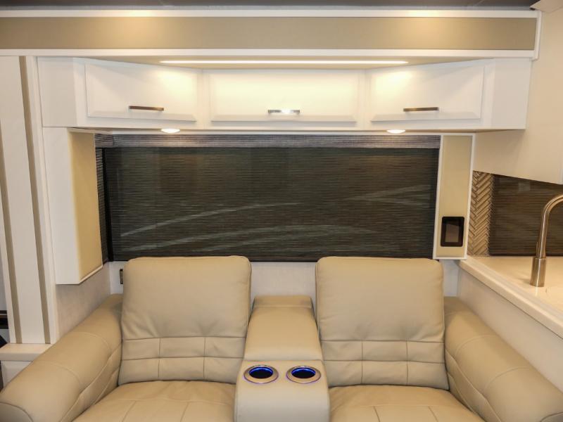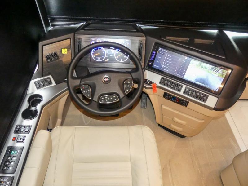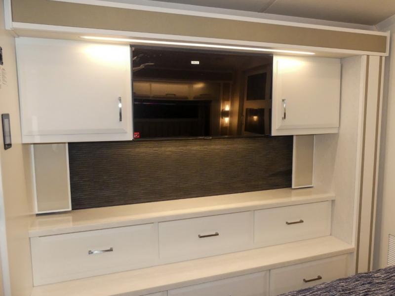 There is much to love about this motorhome! The full-wall slide gives you plenty of room to walk from the front to the back and the two additional slide outs giving you even more space. The main living area offers a theater sofa, and a buffet dinette for dining with a 50" TV on power lift by it. You will also be able to utilize the driver/passenger seats which include six-way power lumbar, recline, and footrest when drinking your glass of wine or cup of coffee. The kitchen offers everything you will need to make any meal, plus the stainless steel appliances are stylish. The rear private bedroom has a king bed slide for a good night's rest, a dresser with adjustable shelves on either side, and a rear wardrobe with sliding mirror doors, shoe storage and even a safe!