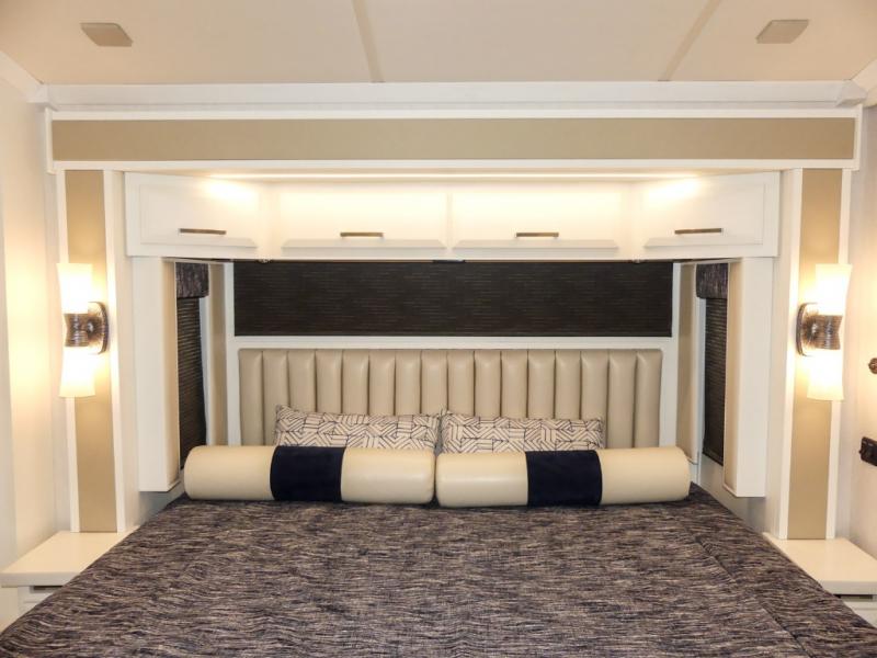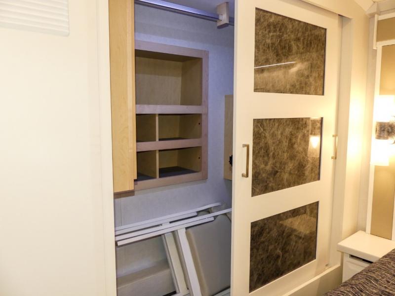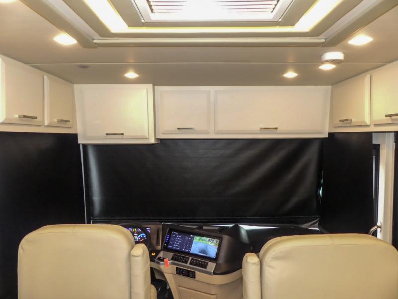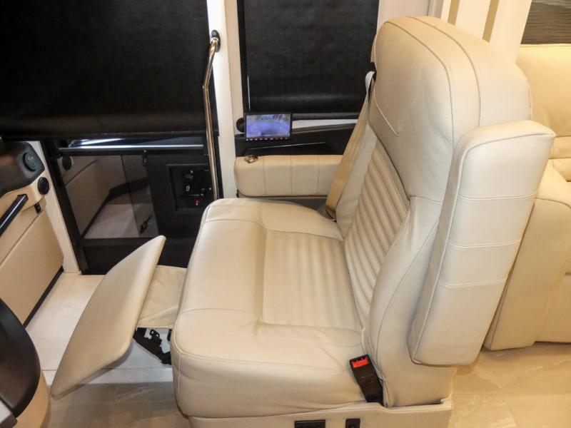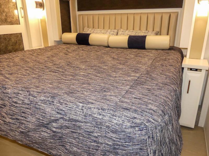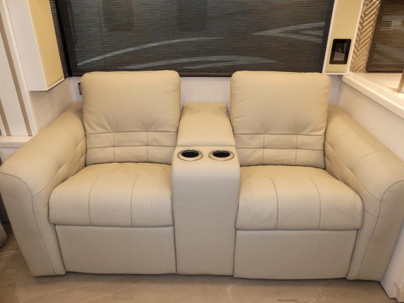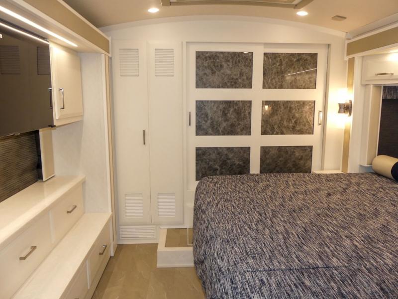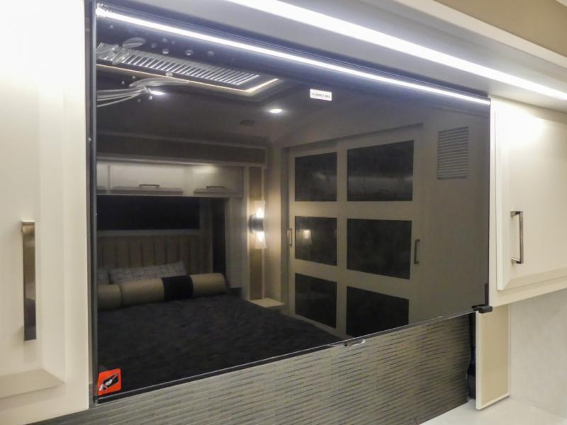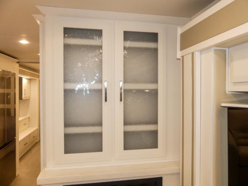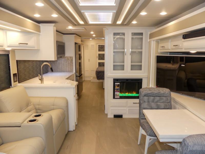 There is much to love about this motorhome! The full-wall slide gives you plenty of room to walk from the front to the back and the two additional slide outs giving you even more space. The main living area offers a theater sofa, and a buffet dinette for dining with a 50" TV on power lift by it. You will also be able to utilize the driver/passenger seats which include six-way power lumbar, recline, and footrest when drinking your glass of wine or cup of coffee. The kitchen offers everything you will need to make any meal, plus the stainless steel appliances are stylish. The rear private bedroom has a king bed slide for a good night's rest, a dresser with adjustable shelves on either side, and a rear wardrobe with sliding mirror doors, shoe storage and even a safe!