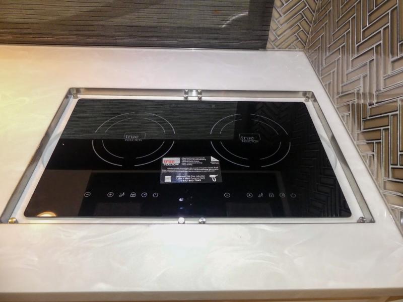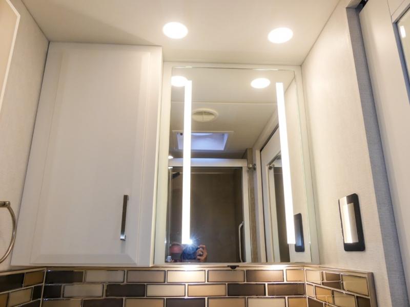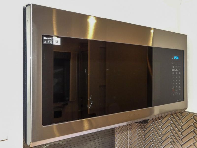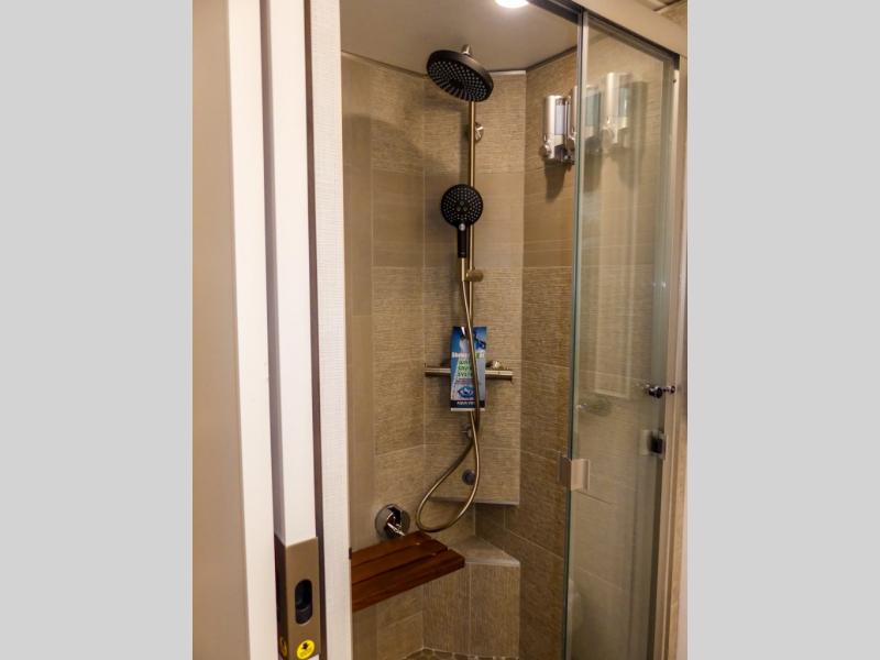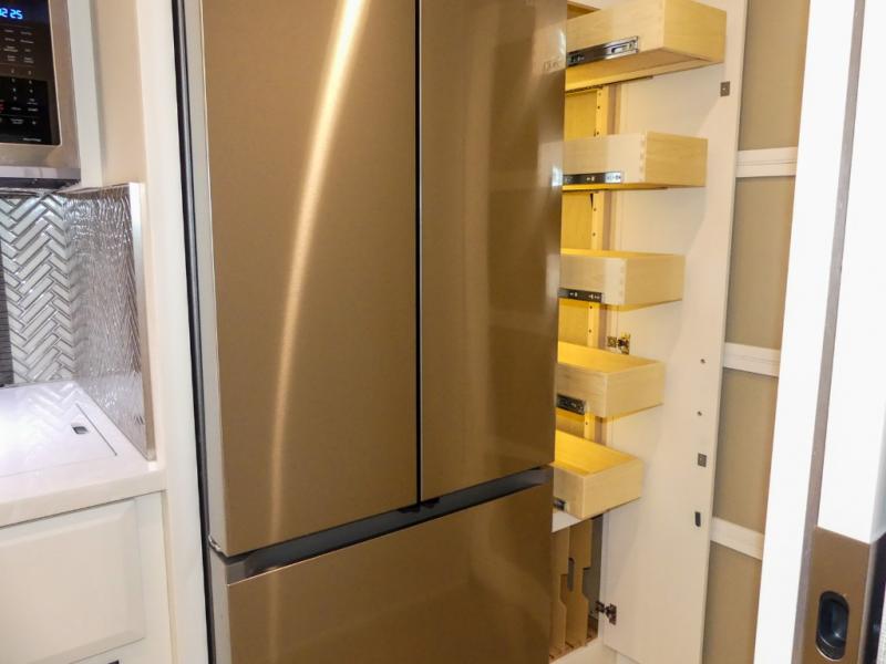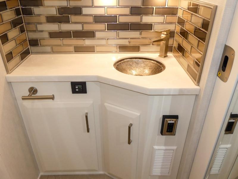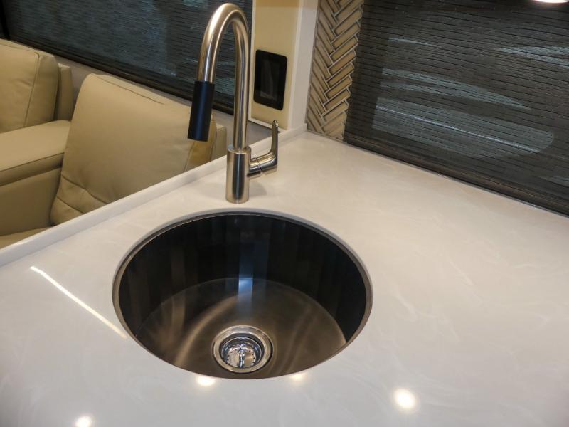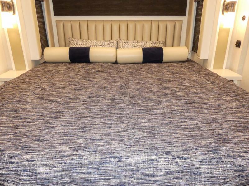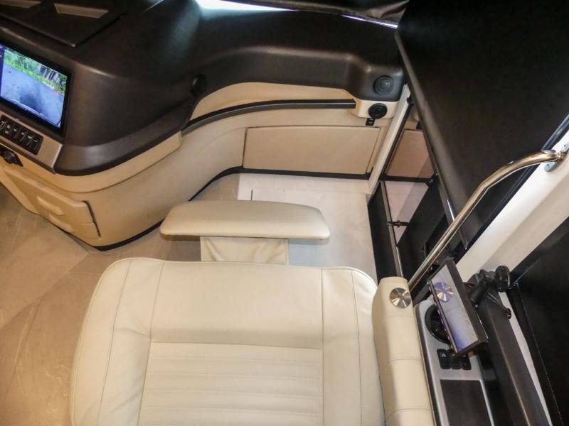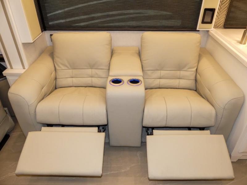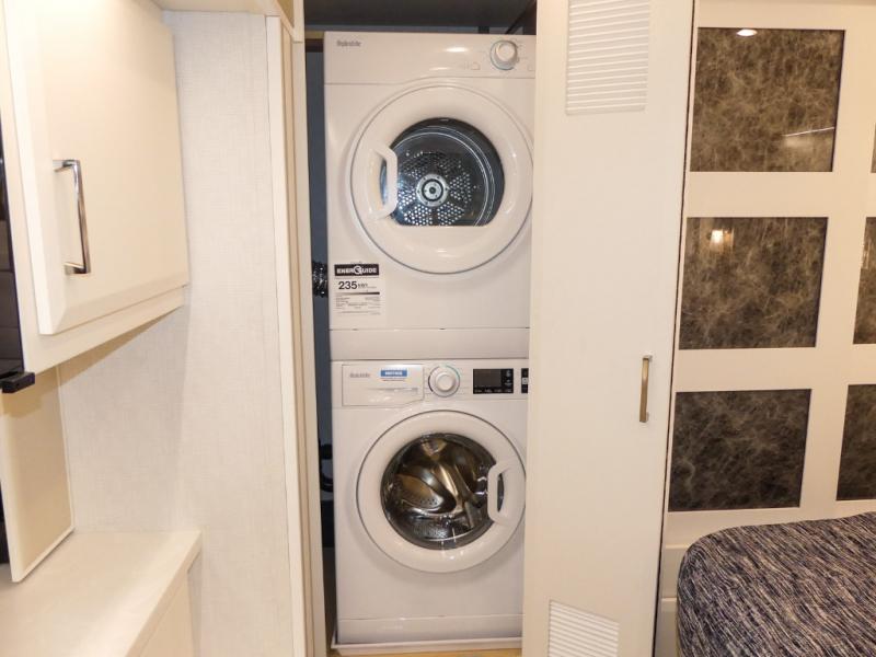There is much to love about this motorhome! The full-wall slide gives you plenty of room to walk from the front to the back and the two additional slide outs giving you even more space. The main living area offers a theater sofa, and a buffet dinette for dining with a 50" TV on power lift by it. You will also be able to utilize the driver/passenger seats which include six-way power lumbar, recline, and footrest when drinking your glass of wine or cup of coffee. The kitchen offers everything you will need to make any meal, plus the stainless steel appliances are stylish. The rear private bedroom has a king bed slide for a good night's rest, a dresser with adjustable shelves on either side, and a rear wardrobe with sliding mirror doors, shoe storage and even a safe!