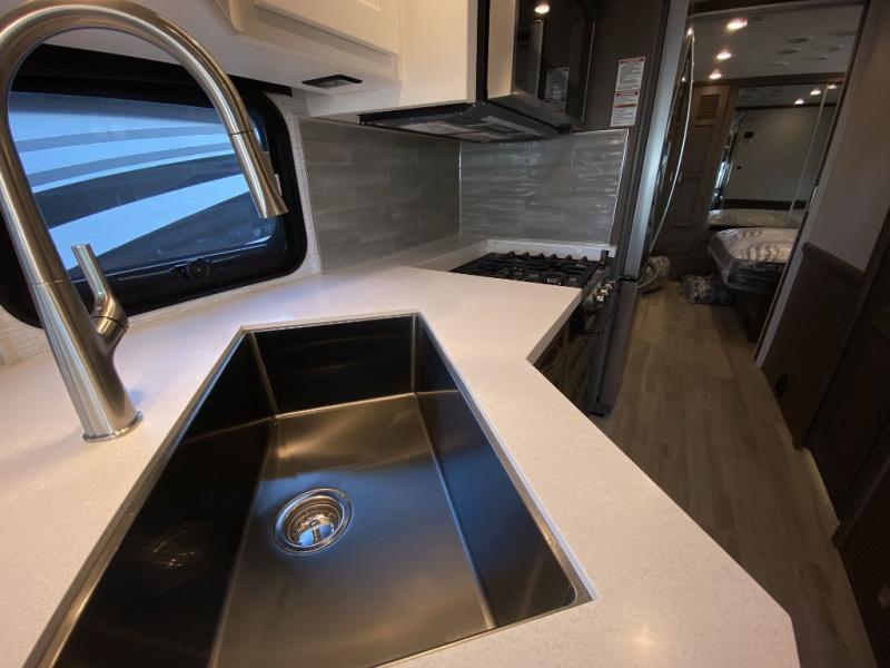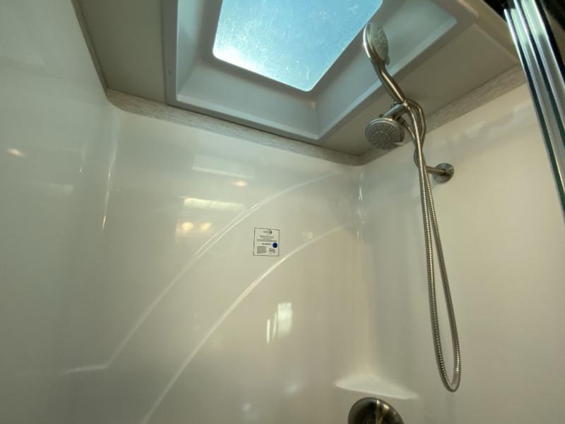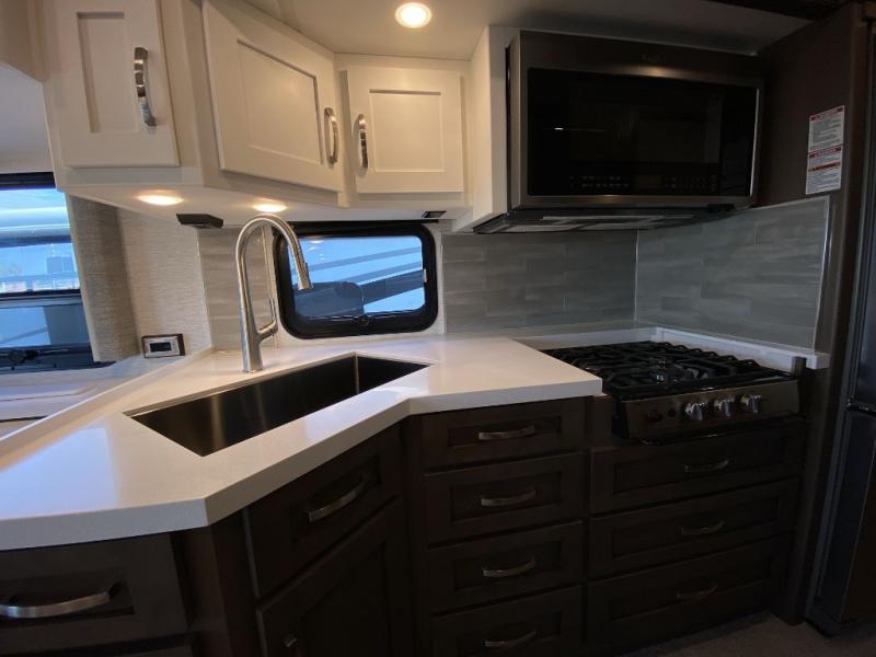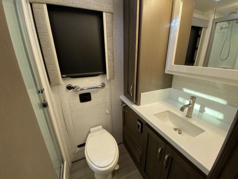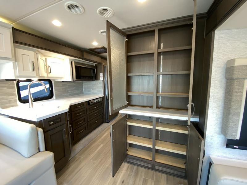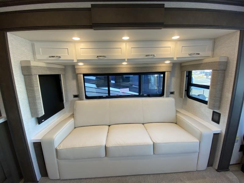 Pack your bags for an extended vacation in this four slide out coach! Once you've parked for the day, you can make lunch in the full kitchen that includes a 30" stainless steel convection microwave with a three burner cooktop and an air fryer feature. There is a 10 cu. ft. Norcold refrigerator and pantry to store your food, plus a booth dinette where you can dine together. A Jackknife sofa provides more seating space, or you may just find yourselves outdoors under the Carefree Travel'r awning. The mid-coach full bath will be easily accessible for everyone to use, and the rear private bedroom provides you with your own space at night. Here, you'll enjoy a bed slide out with overhead storage, a dresser with a Samsung LED TV, plus a wardrobe with sliding mirror doors.