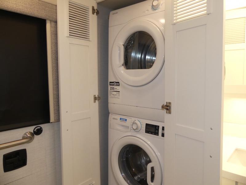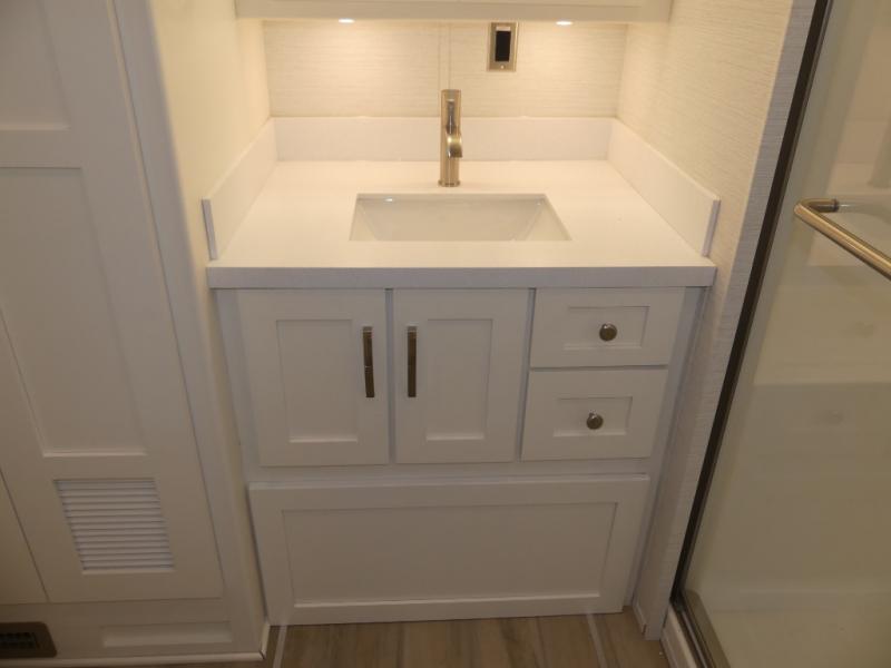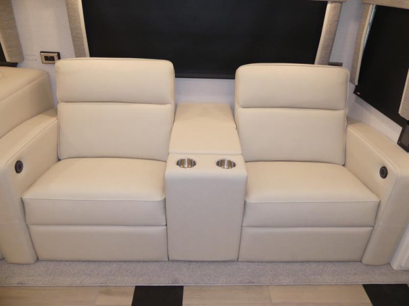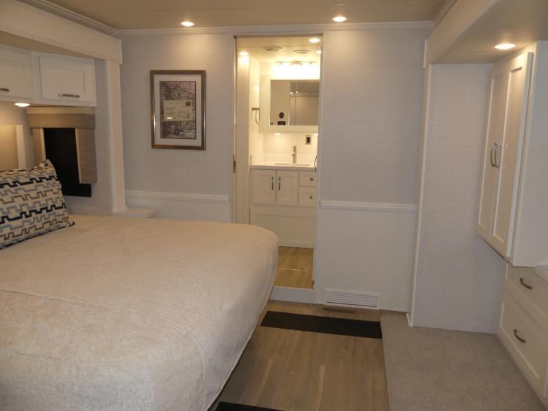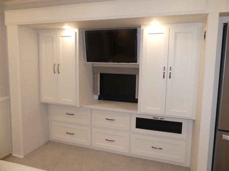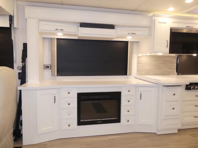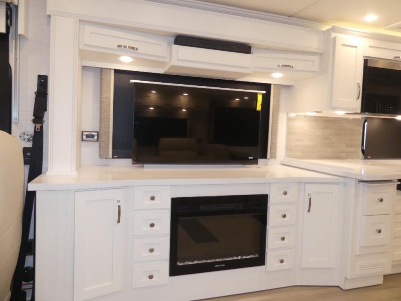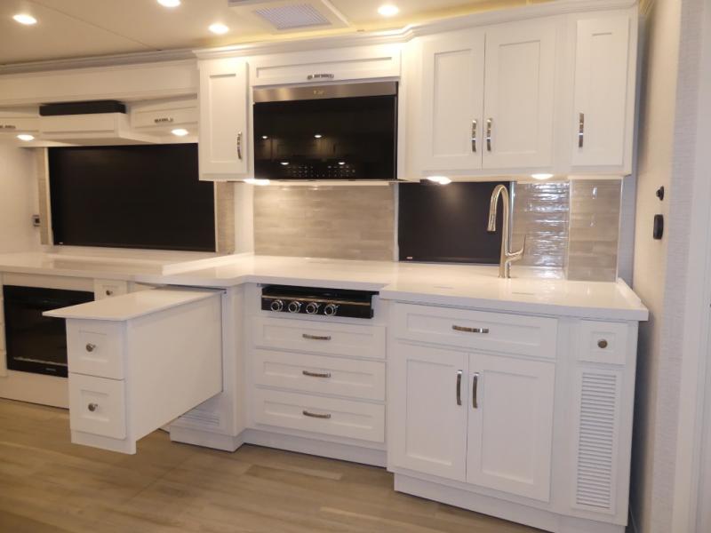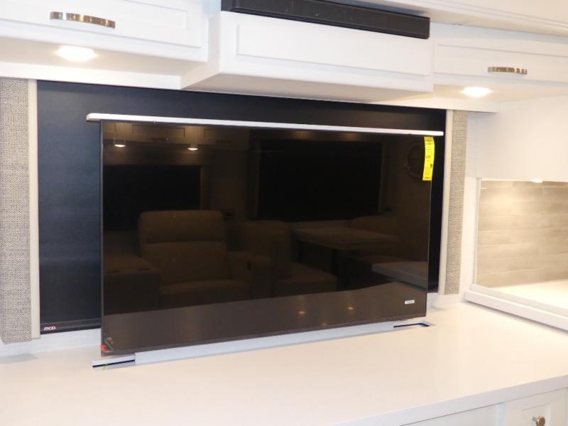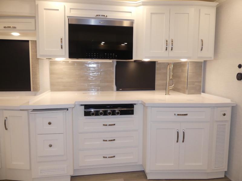 With triple slides plus a bath and a half, this coach may just be the one! Once you arrive at the campground or antique fair, you can make a quick lunch with the 30" stainless steel convection microwave with a three burner cooktop and air fryer feature. There is also a pull-out cabinet to store spices, hand towels, and more. The booth dinette and two Jackknife sofas provide a place to dine, or you may want to take your plate and coffee outdoors under the Carefree Travel'r awning. A mid-coach half bath and full rear bath will allow everyone space to freshen up each day, and you're going to love the master bedroom with a king bed slide out, dual shirt wardrobes, plus your own Samsung LED TV.