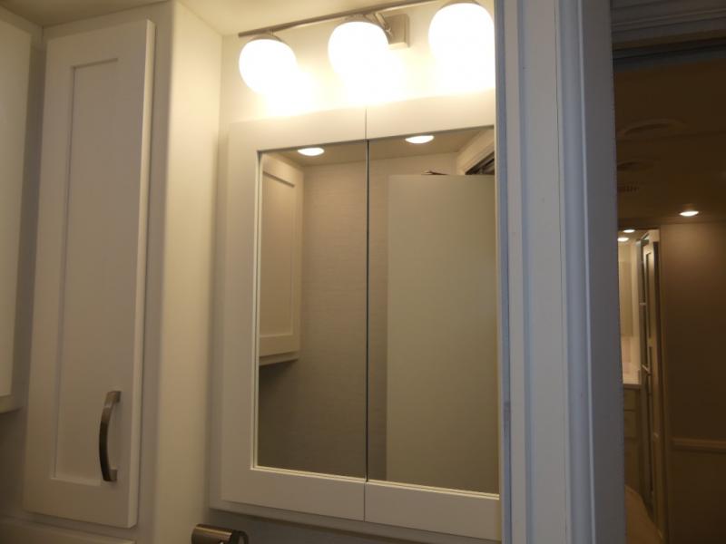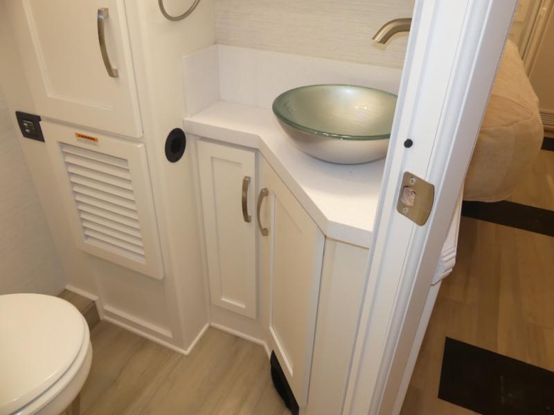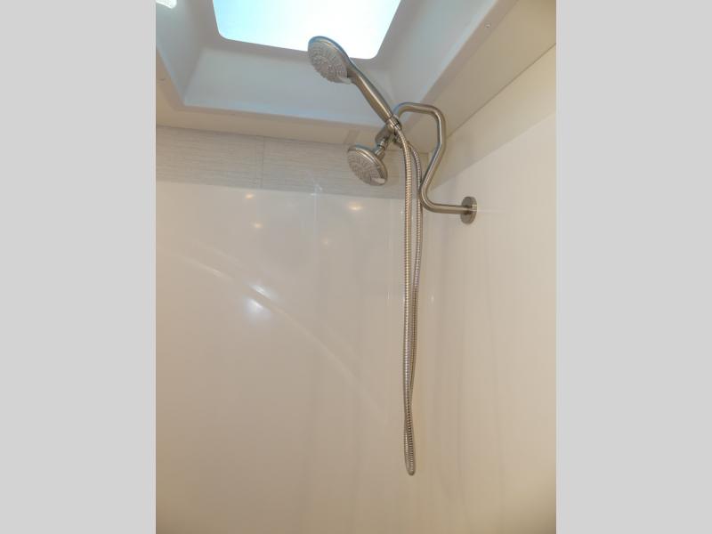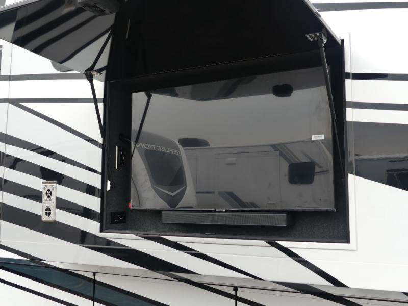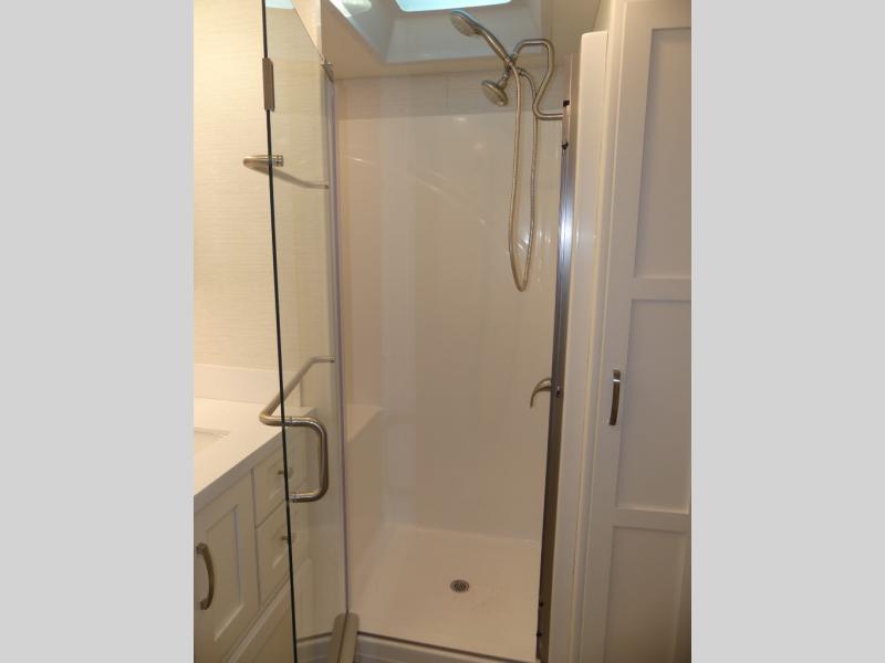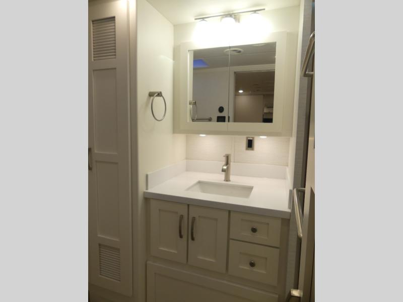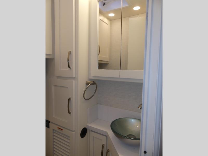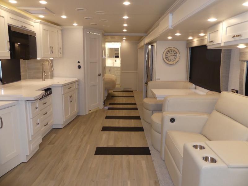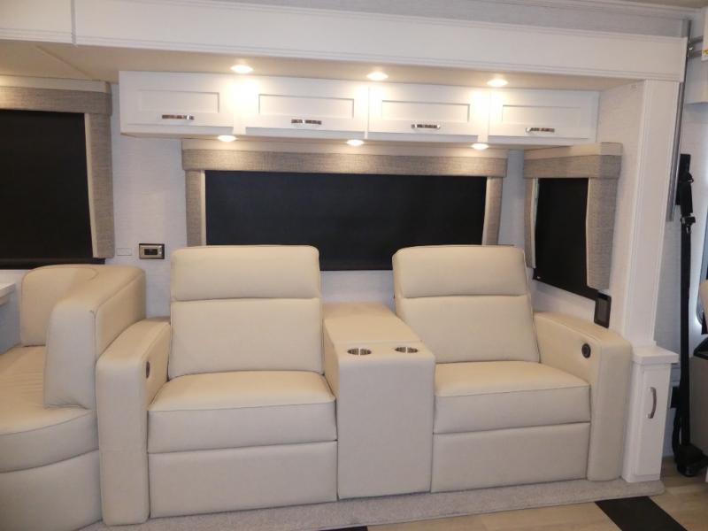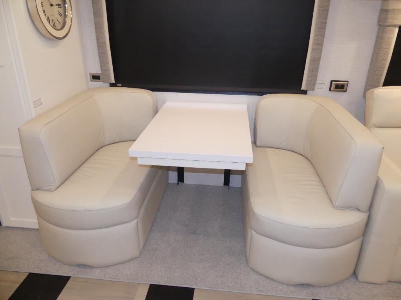 With triple slides plus a bath and a half, this coach may just be the one! Once you arrive at the campground or antique fair, you can make a quick lunch with the 30" stainless steel convection microwave with a three burner cooktop and air fryer feature. There is also a pull-out cabinet to store spices, hand towels, and more. The booth dinette and two Jackknife sofas provide a place to dine, or you may want to take your plate and coffee outdoors under the Carefree Travel'r awning. A mid-coach half bath and full rear bath will allow everyone space to freshen up each day, and you're going to love the master bedroom with a king bed slide out, dual shirt wardrobes, plus your own Samsung LED TV.