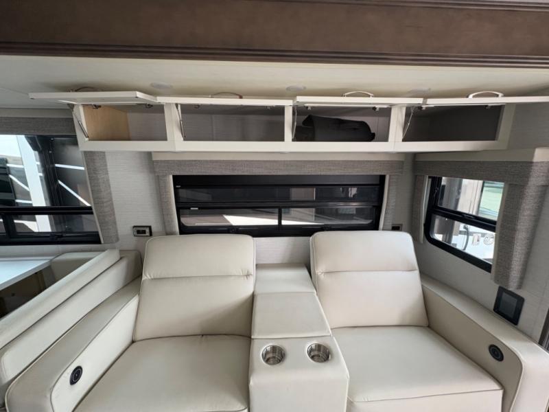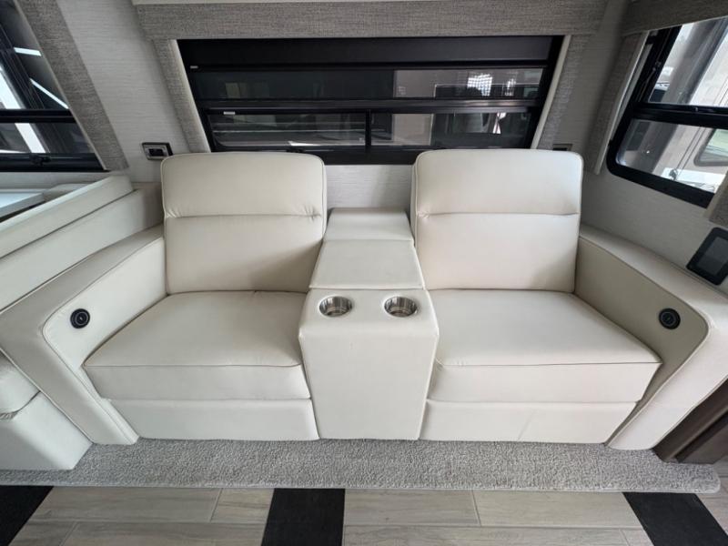 Spacious Living Area with theater seating, a plush sofa, a convertible dinette, and a large LED TV, providing a comfortable space to relax and entertain.