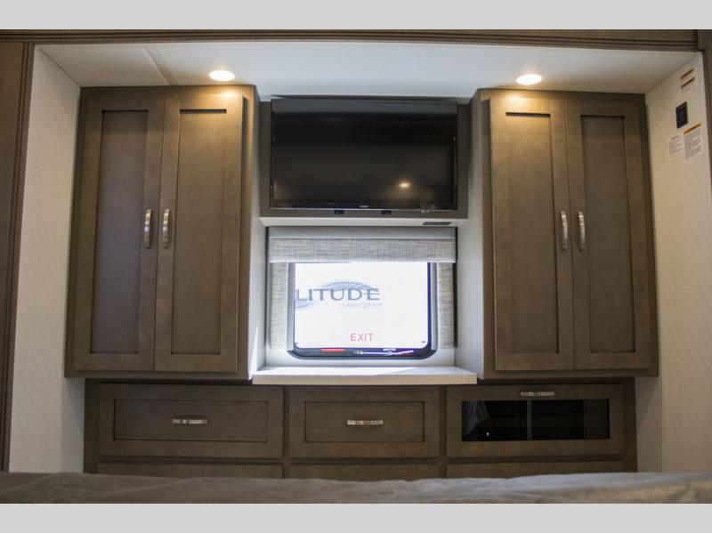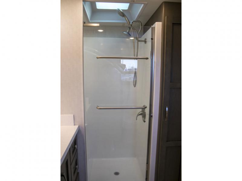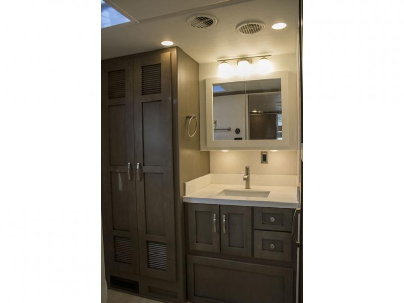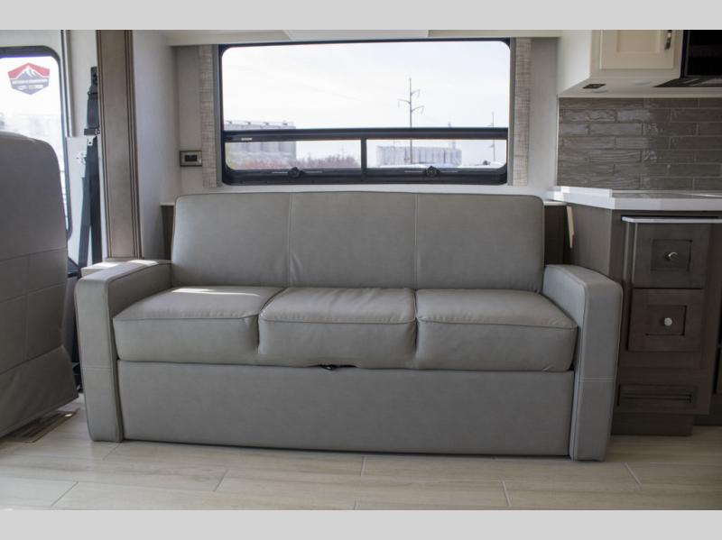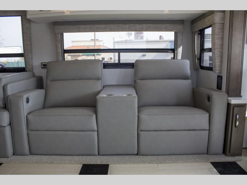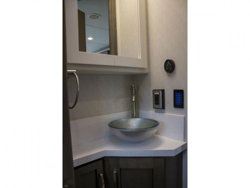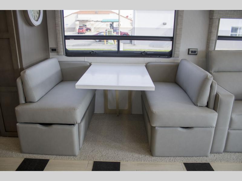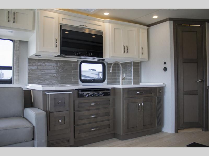 With triple slides plus a bath and a half, this coach may just be the one! Once you arrive at the campground or antique fair, you can make a quick lunch with the 30" stainless steel convection microwave with a three burner cooktop and air fryer feature. There is also a pull-out cabinet to store spices, hand towels, and more. The booth dinette and two Jackknife sofas provide a place to dine, or you may want to take your plate and coffee outdoors under the Carefree Travel'r awning. A mid-coach half bath and full rear bath will allow everyone space to freshen up each day, and you're going to love the master bedroom with a king bed slide out, dual shirt wardrobes, plus your own Samsung LED TV.