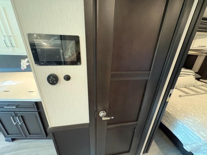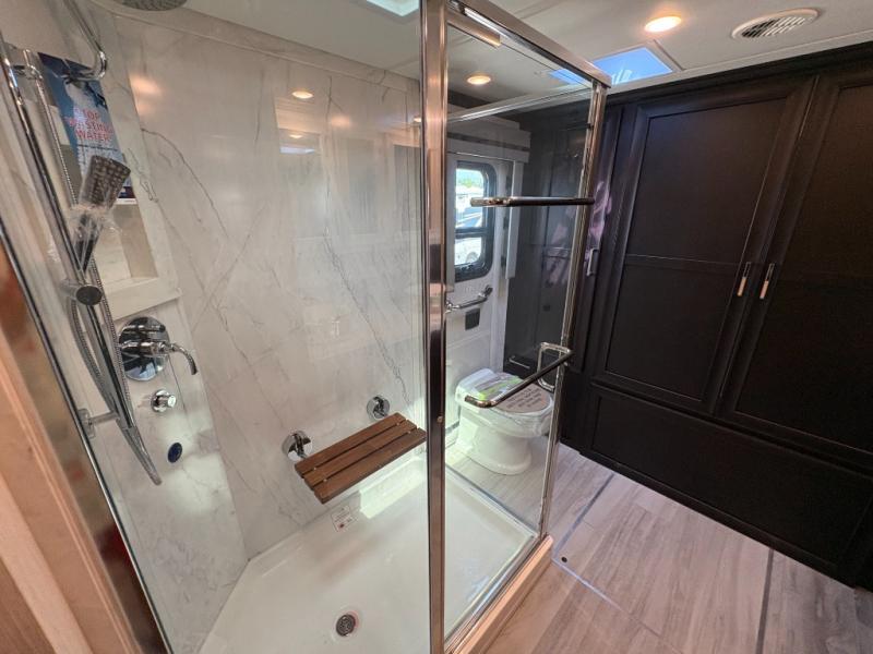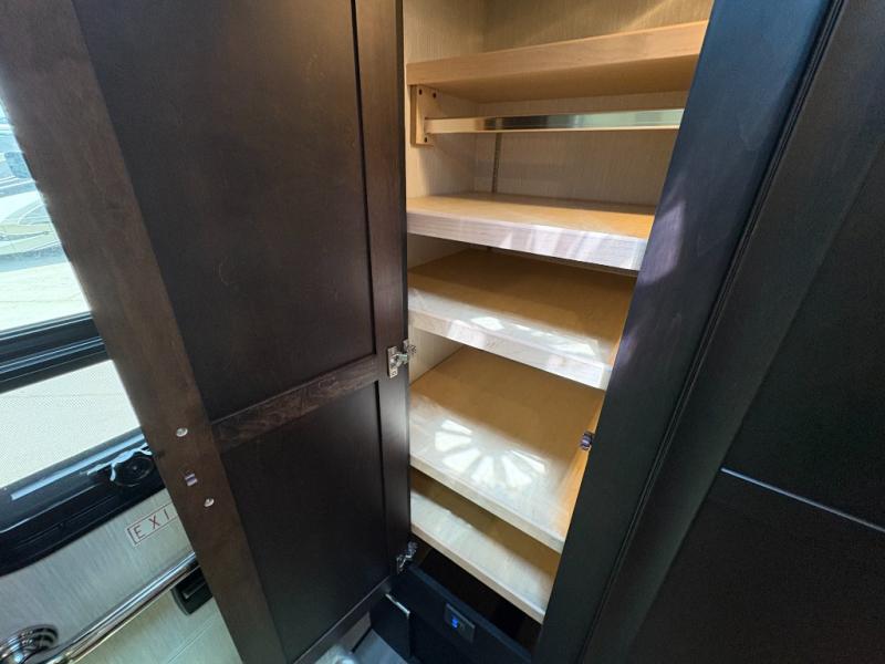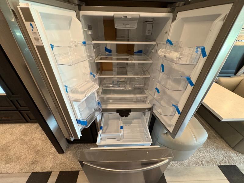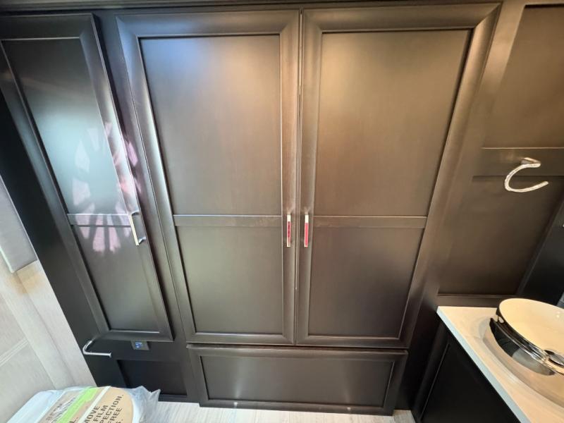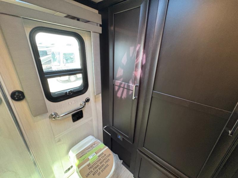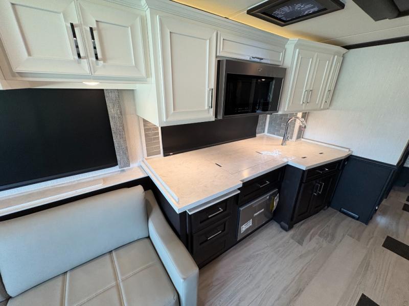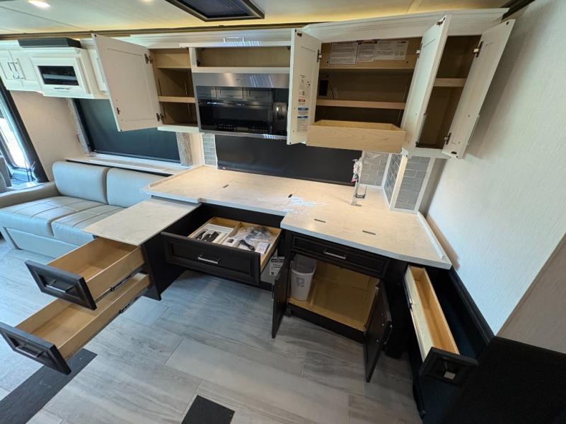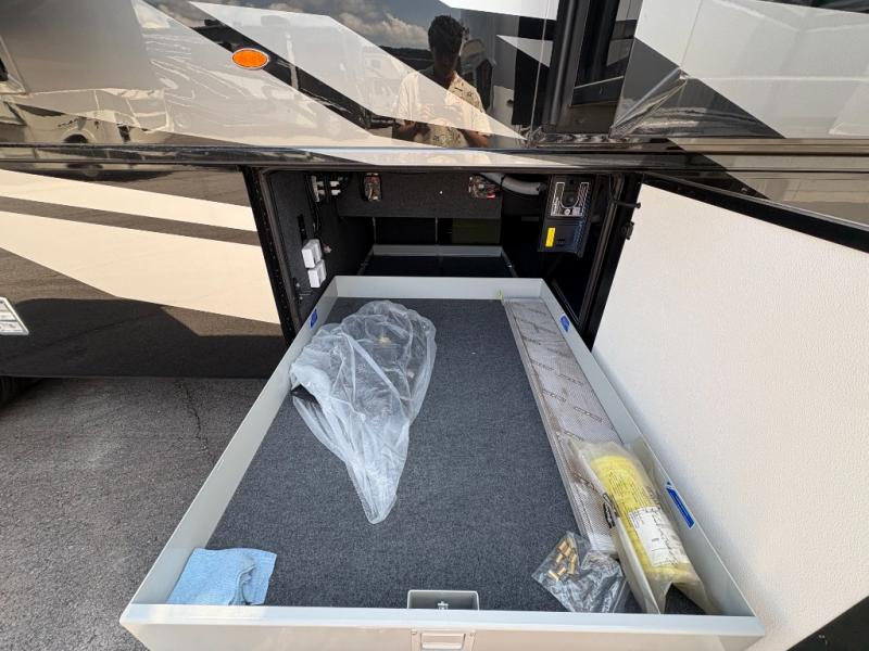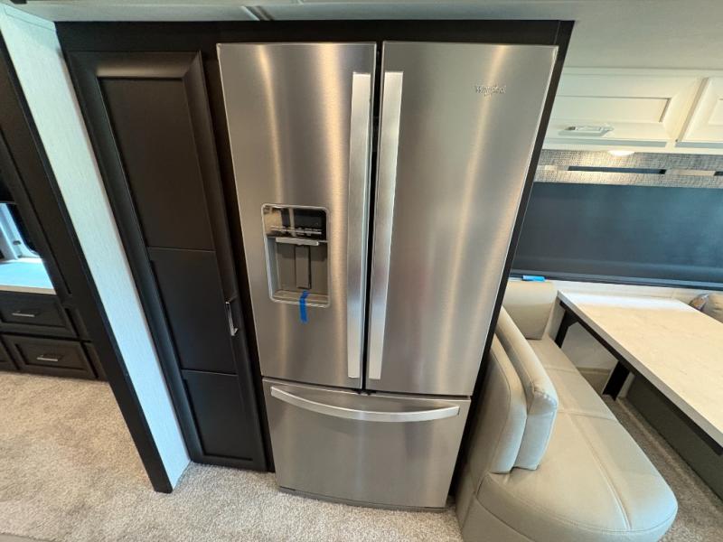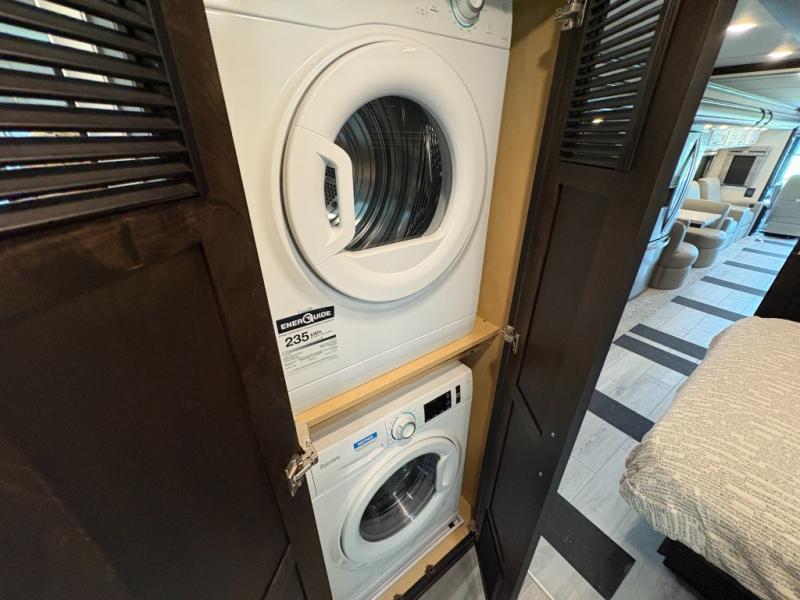 Experience a home away from home with this motorhome! Two can get ready at once in the full rear bathroom with the dual sink vanity, plus it has a 50" x 34" shower with a seat, a linen closet, a wardrobe with doors, adjustable shelves, and even washer and dryer prep. The master suite has access to the bathroom, a king bed slide, and a dresser with wardrobes on either side and a Samsung LED 4K TV. You can prepare your best meals with the all electric induction cooktop, pull-out cabinet, and large pantry then enjoy them at the free-standing dinette with chairs. Now that your belly is full, head to either the 87" hide-a-bed sofa or the 74" jackknife sofa while a movie plays on the 50" Samsung LED 4K TV on a power lift!