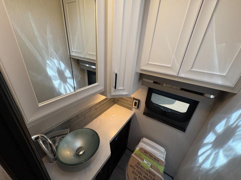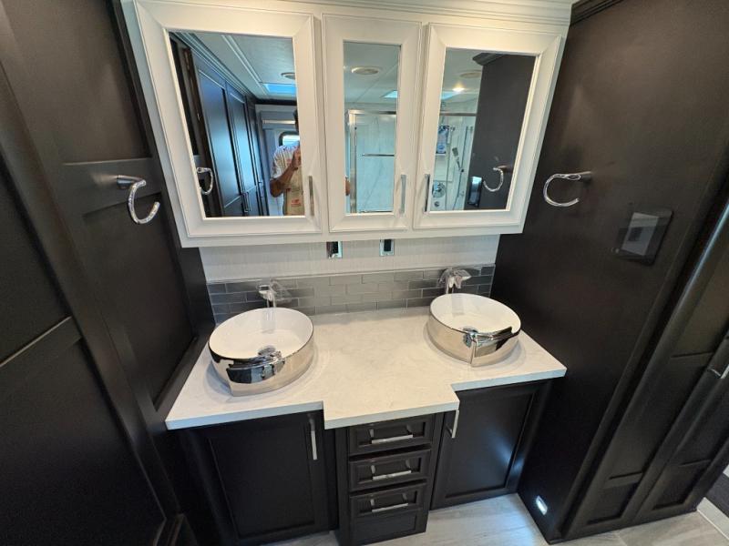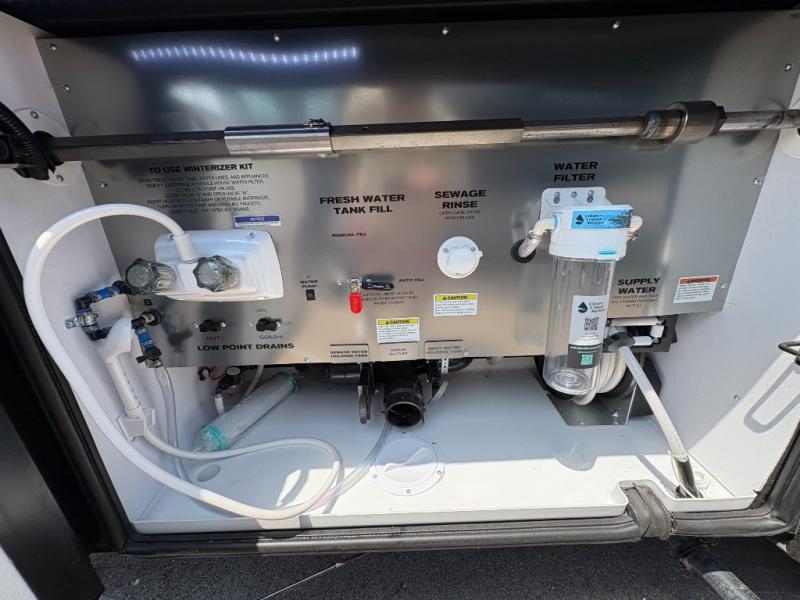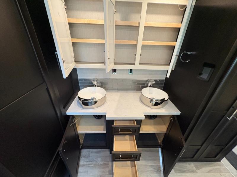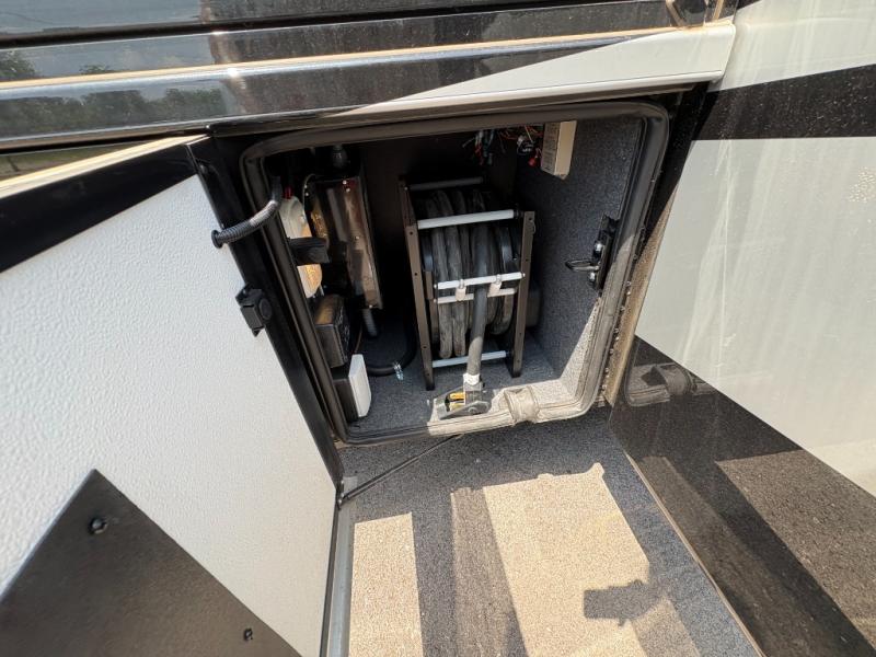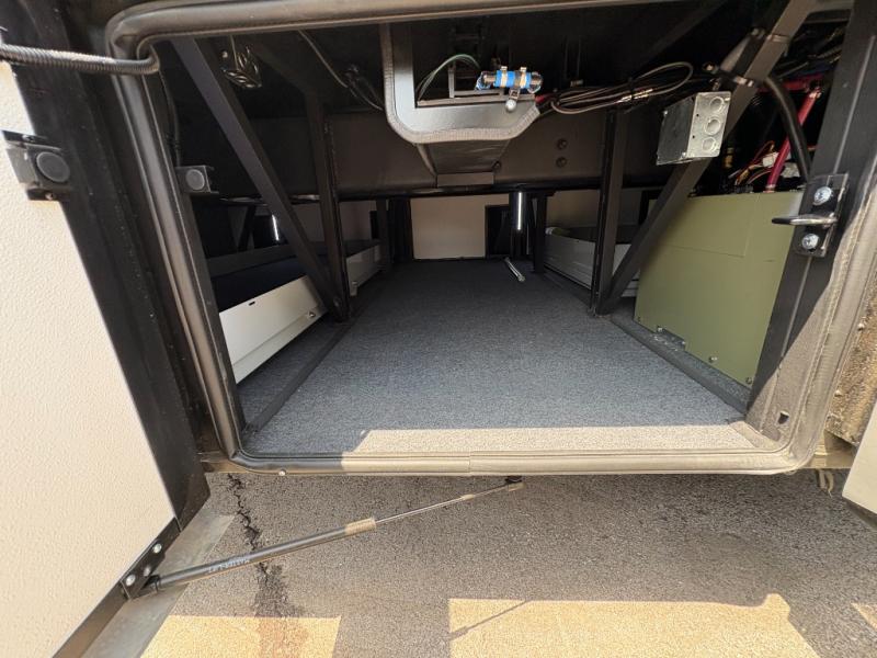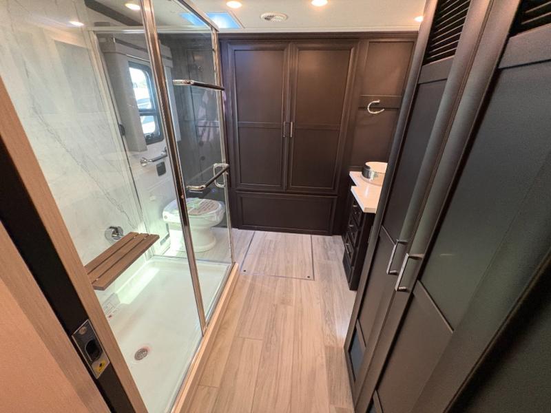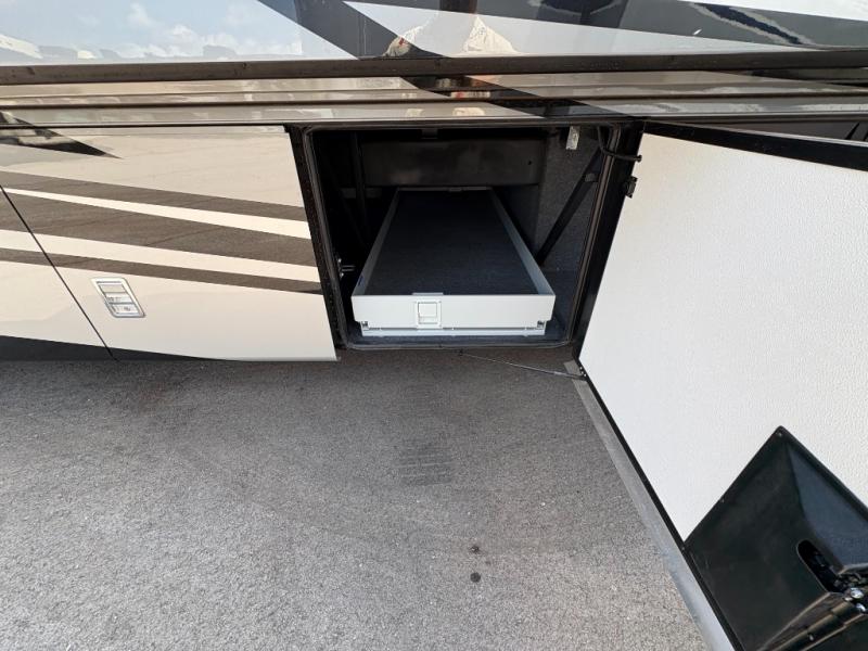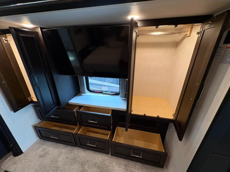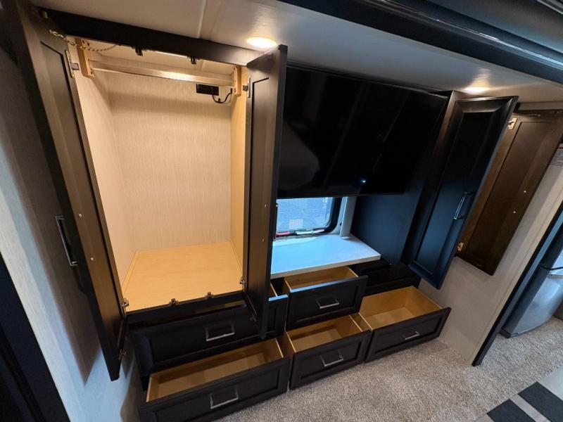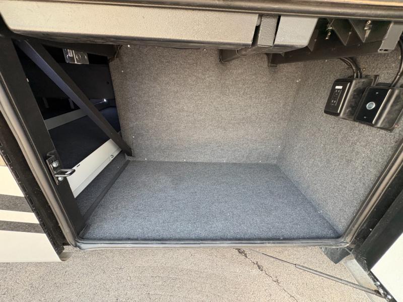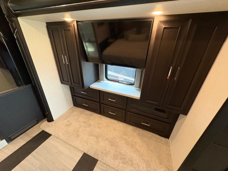 Experience a home away from home with this motorhome! Two can get ready at once in the full rear bathroom with the dual sink vanity, plus it has a 50" x 34" shower with a seat, a linen closet, a wardrobe with doors, adjustable shelves, and even washer and dryer prep. The master suite has access to the bathroom, a king bed slide, and a dresser with wardrobes on either side and a Samsung LED 4K TV. You can prepare your best meals with the all electric induction cooktop, pull-out cabinet, and large pantry then enjoy them at the free-standing dinette with chairs. Now that your belly is full, head to either the 87" hide-a-bed sofa or the 74" jackknife sofa while a movie plays on the 50" Samsung LED 4K TV on a power lift!