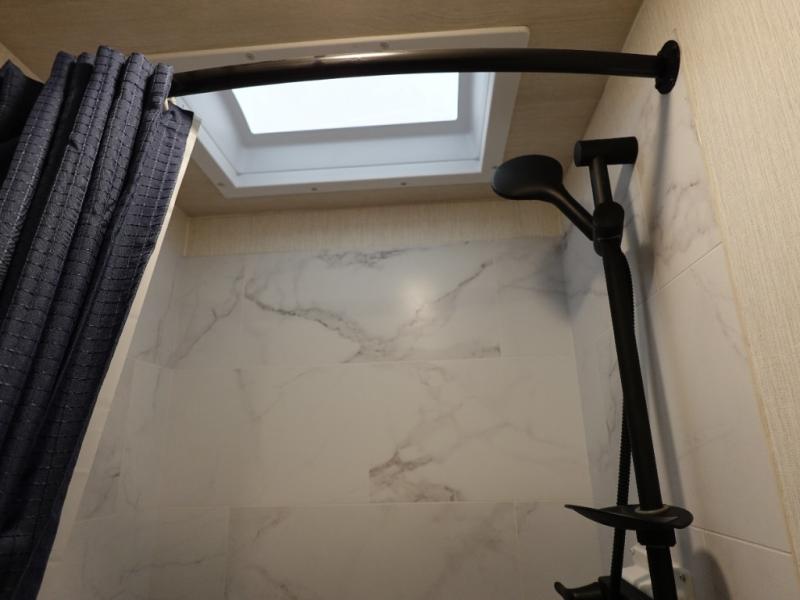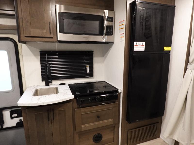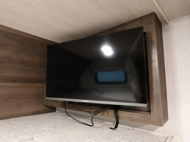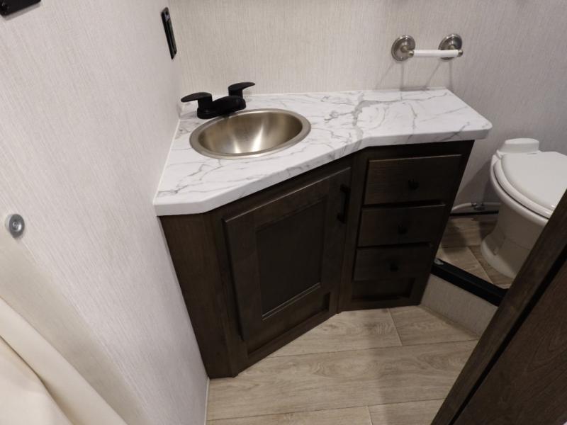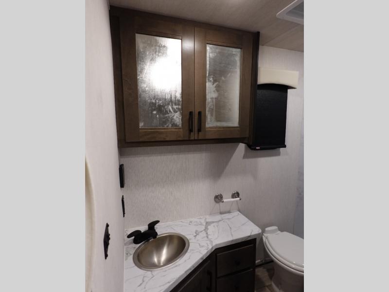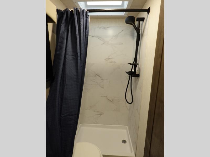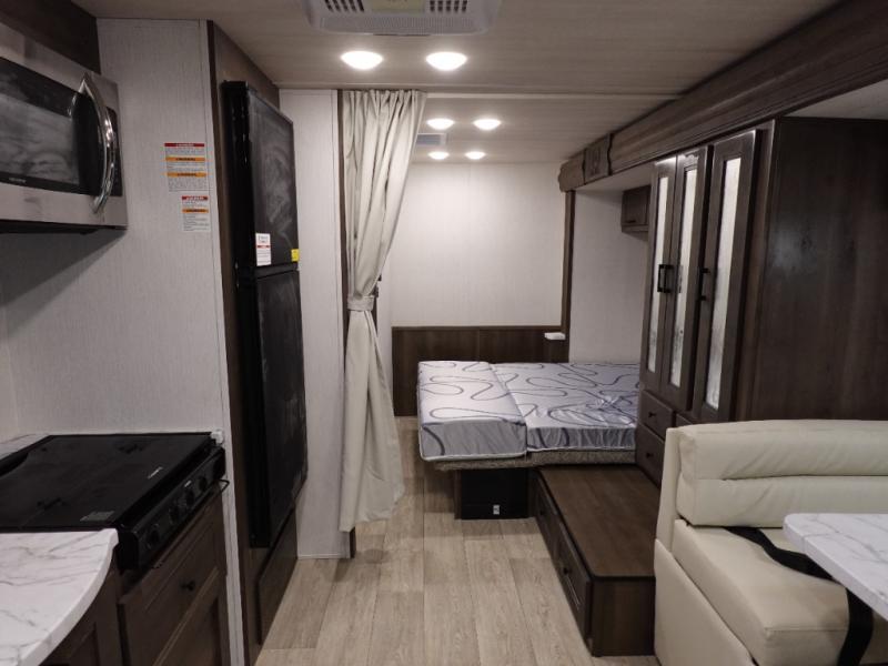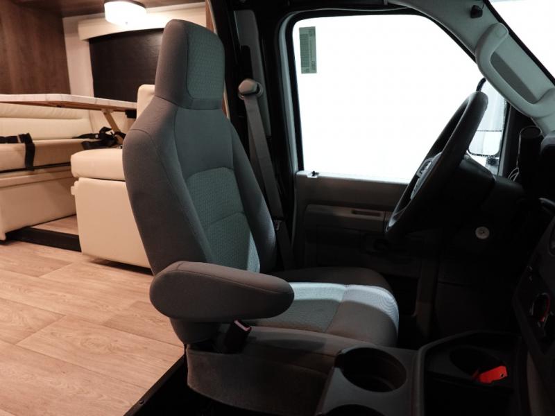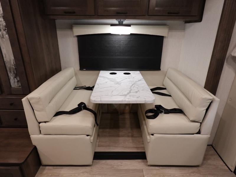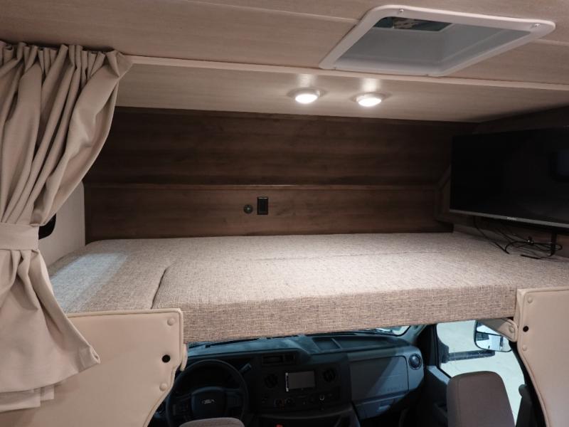 Hit the road with your spouse in this motorhome! It features a rear corner 60" x 74" queen bed for you to rest your head after a long day of traveling. It is also conveniently right next to the full bathroom which has a shower with a skylight above and a stainless steel sink with a dual control faucet. You can prepare your best meals while on the road with the three burner stovetop, 12V residential refrigerator with a 1000 watt inverter, and an over the range residential microwave with exhaust fan. The booth dinette is great for eating your meals, playing card games, and even transforming into an extra sleeping space for another to join in on the fun!