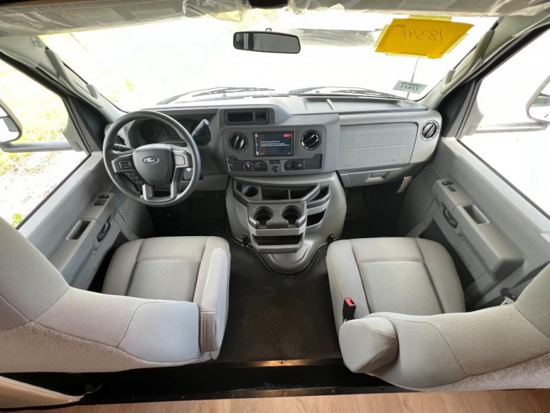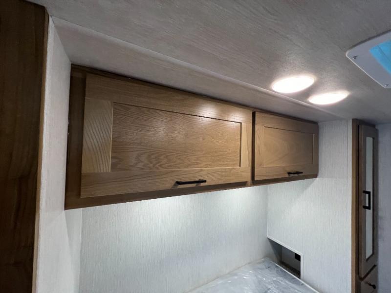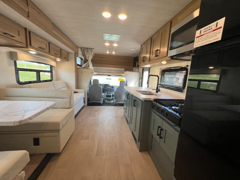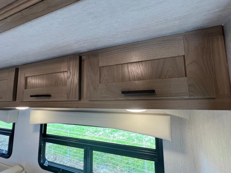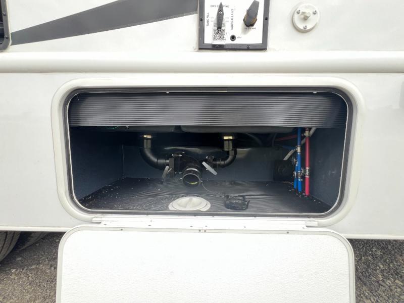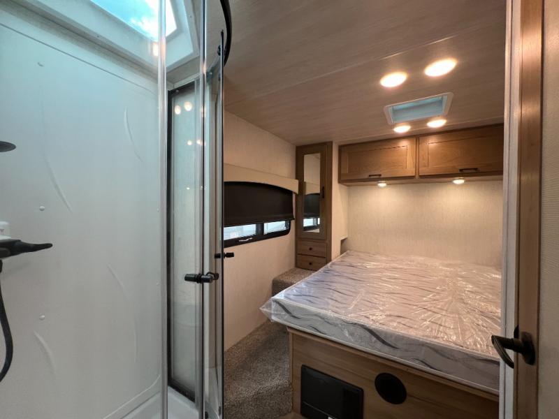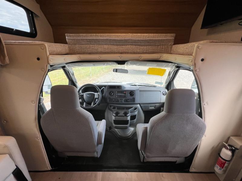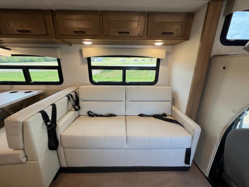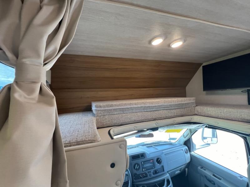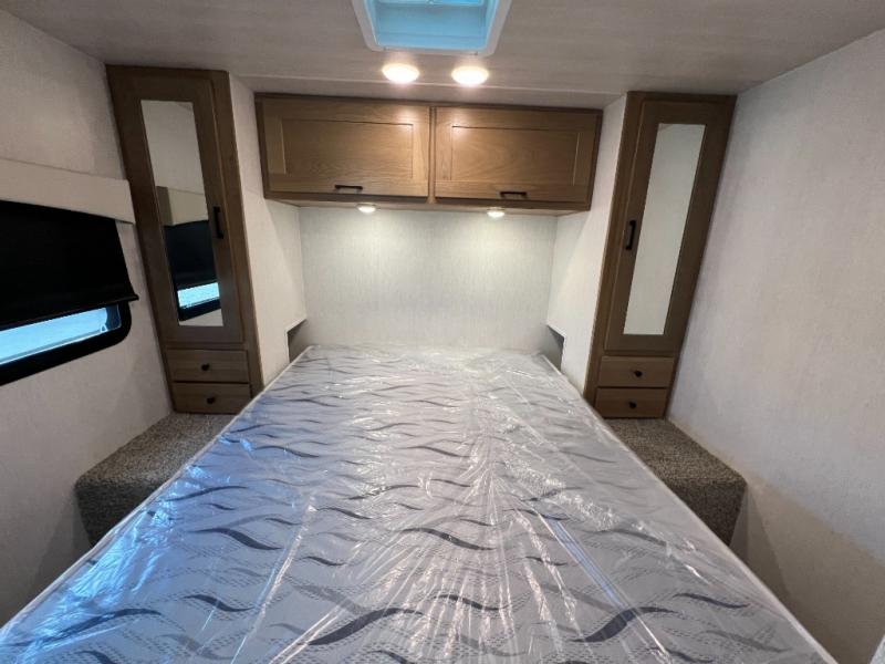 There is plenty of sleeping and seating space for everyone in this motorhome between the bunk over cab, the queen bed in the rear private bedroom, the sofa, and booth dinette which transform into sleeping spaces! The separated bathroom makes it convenient for one person to freshen up in the shower while another uses the private toilet and stainless steel sink with a dual control faucet. The private bedroom also has a wardrobe slide for your clothes and ledges on either side of the queen bed to set your electronics or cup of water!