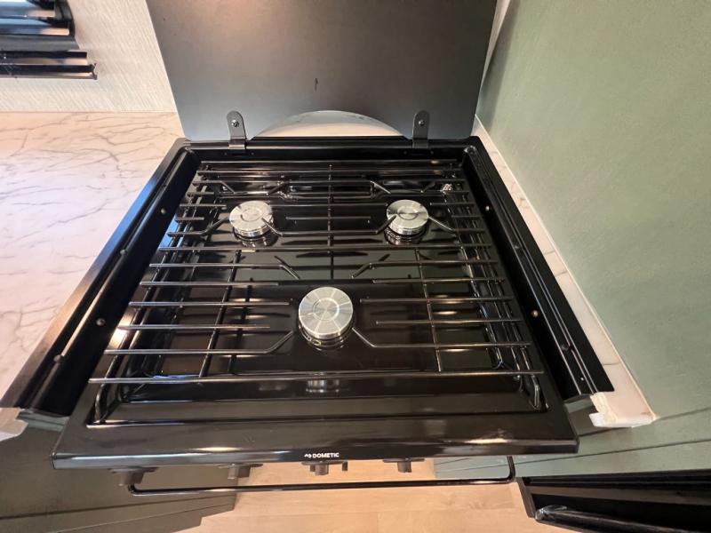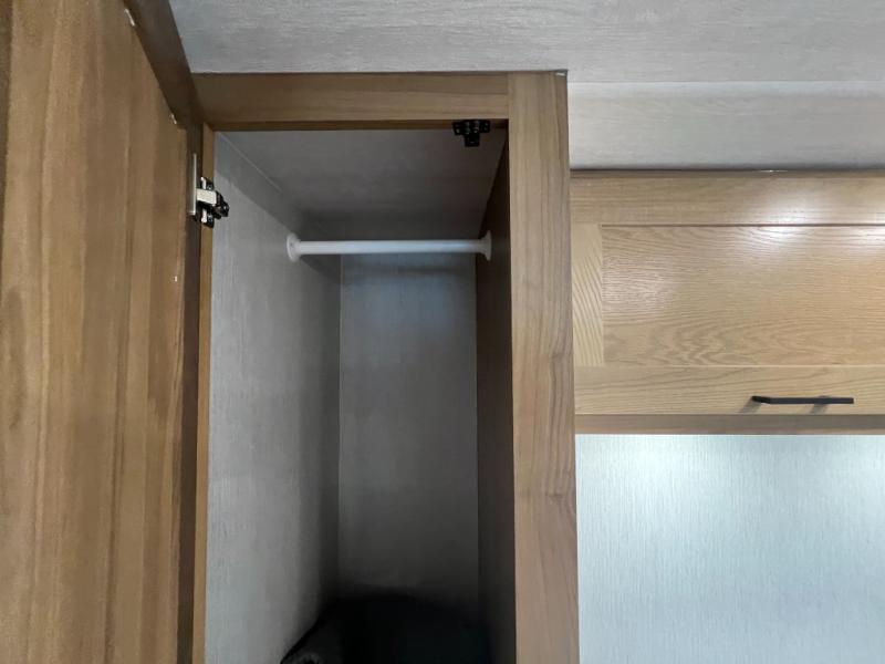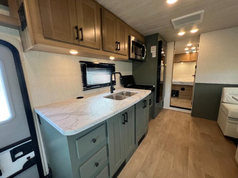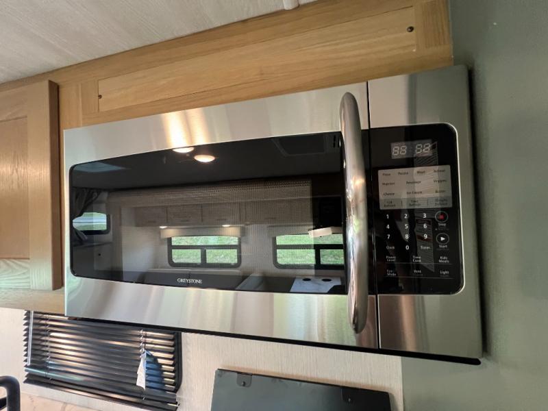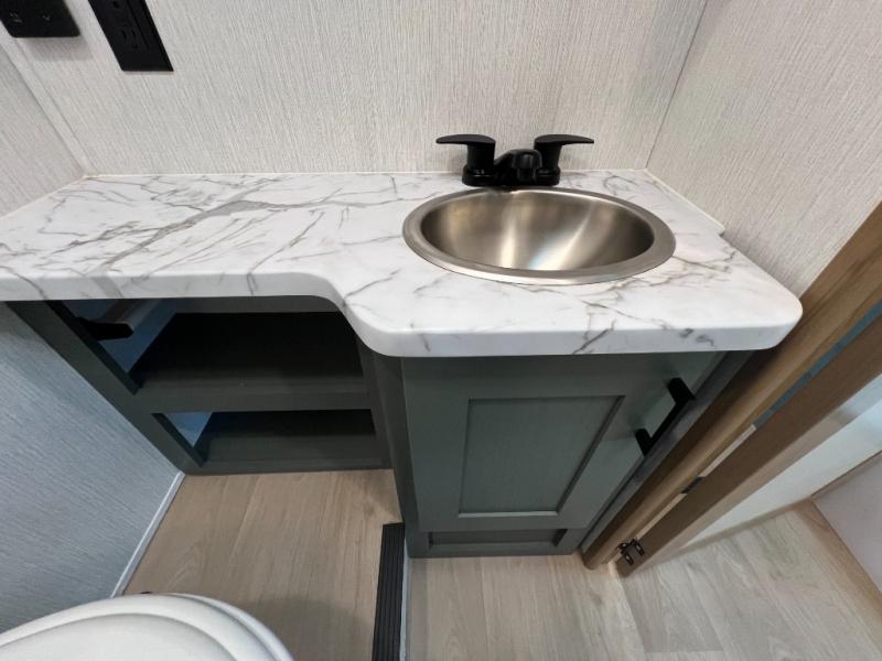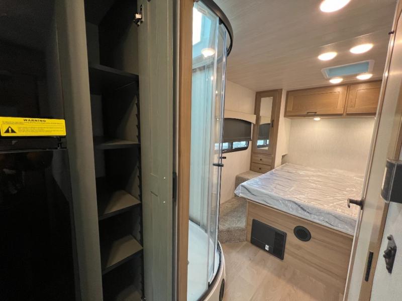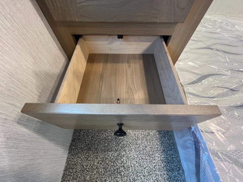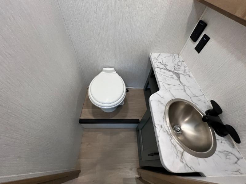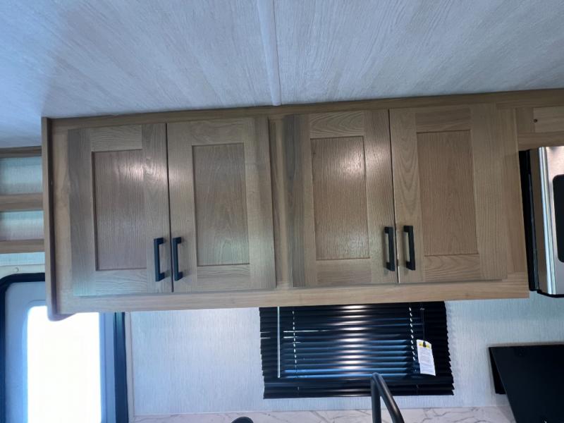 There is plenty of sleeping and seating space for everyone in this motorhome between the bunk over cab, the queen bed in the rear private bedroom, the sofa, and booth dinette which transform into sleeping spaces! The separated bathroom makes it convenient for one person to freshen up in the shower while another uses the private toilet and stainless steel sink with a dual control faucet. The private bedroom also has a wardrobe slide for your clothes and ledges on either side of the queen bed to set your electronics or cup of water!