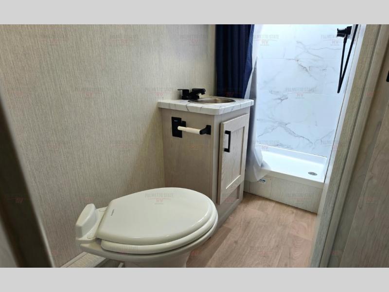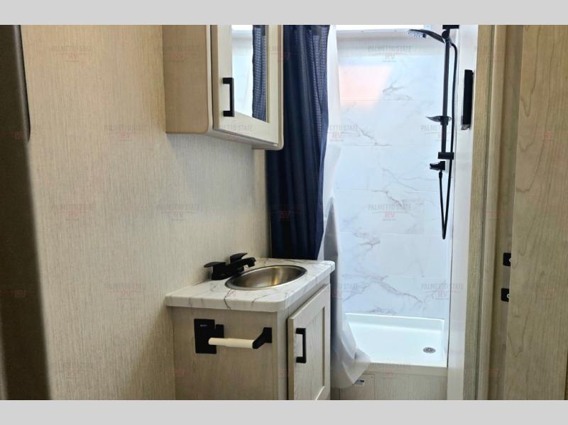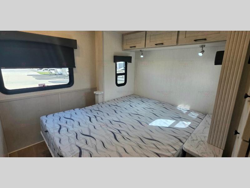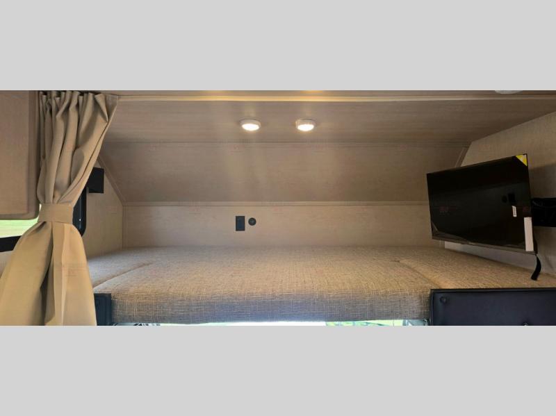 The open road is yours for the taking in this single slide out coach! Get a good night's rest each night on the deluxe innerspring queen bed slide out, and freshen up in the morning with the shower with a skylight in the rear corner bathroom. Grab some eggs from the 10 cu. ft. 12V refrigerator then head to the three burner cooktop to fry them up. You can then enjoy them at the booth dinette which can also transform into an extra sleeping space. The bunk over cab is also another sleeping space or you can add the optional entertainment center, and there is plenty of storage found in the coach, including a wardrobe and pantry!