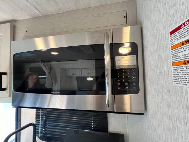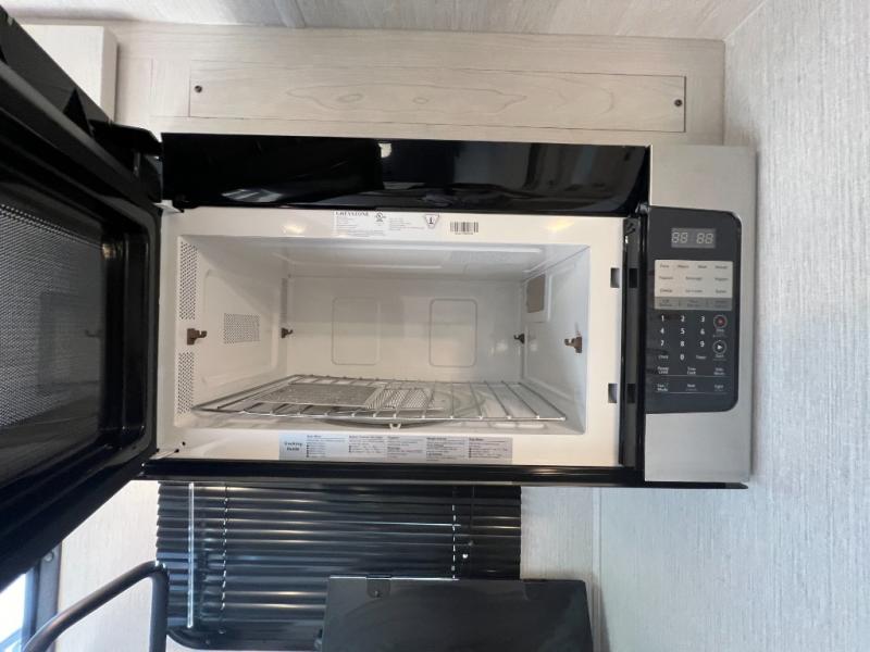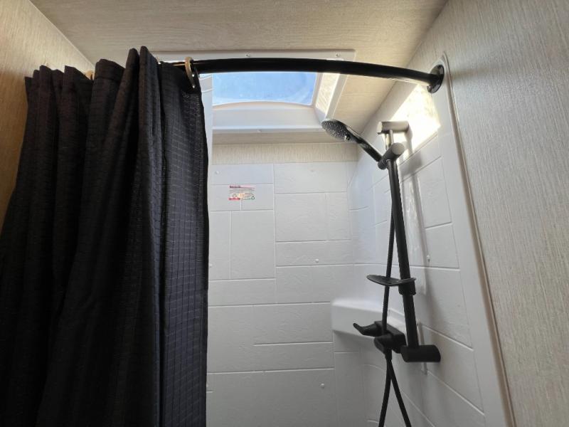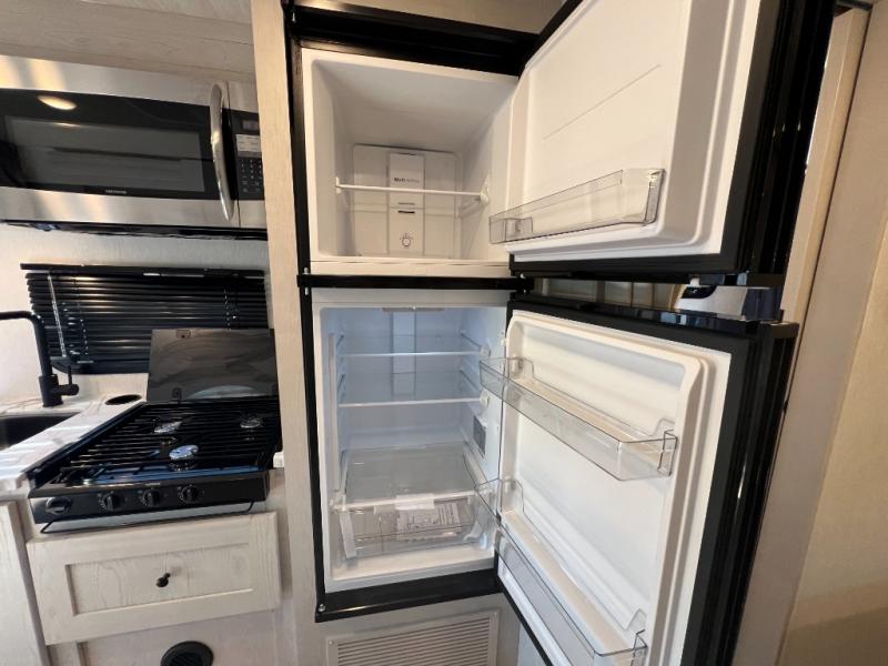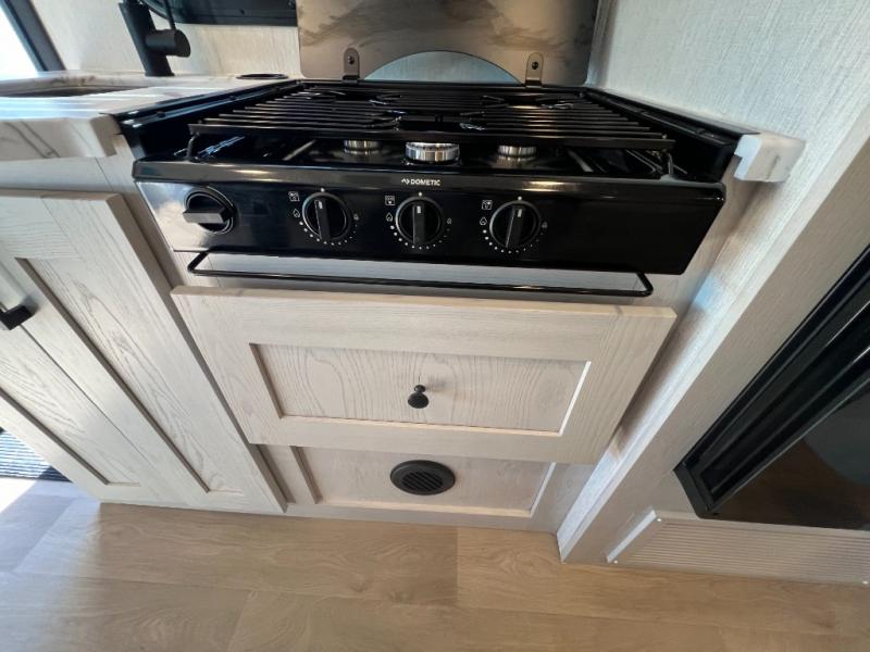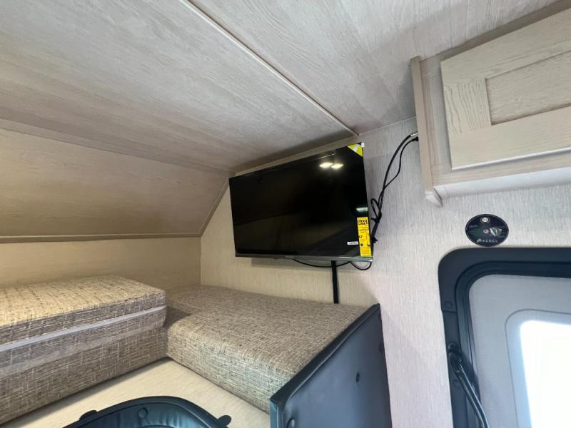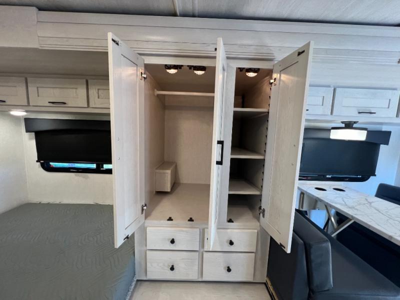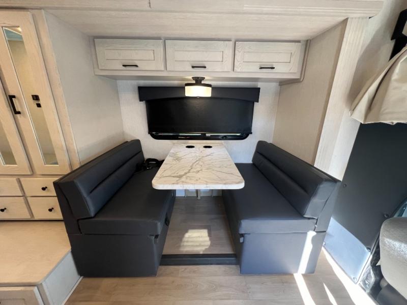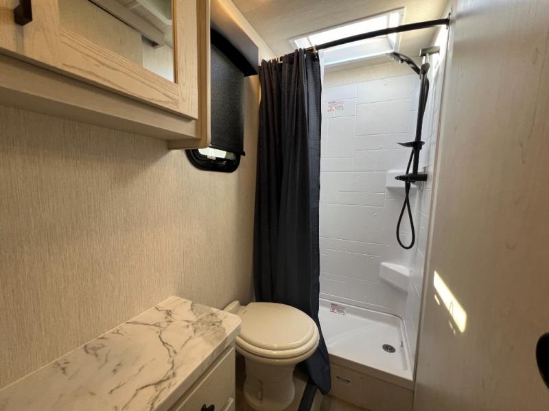 Pack your bags and head across the country in this cozy coach! Get a good night's rest each night on the deluxe innerspring 60" x 74" queen bed, and freshen up in the morning with the shower with a skylight in the rear corner bathroom. And there is a wardrobe beside the bed to keep your clothes out of the way too. Grab some eggs from the 10 cu. ft. 12V refrigerator then head to the three burner cooktop to fry them up. You can then enjoy them at the booth dinette within the full-wall slide, which can also transform into an extra sleeping space. The bunk over cab is also another sleeping space or it can be used for storage!