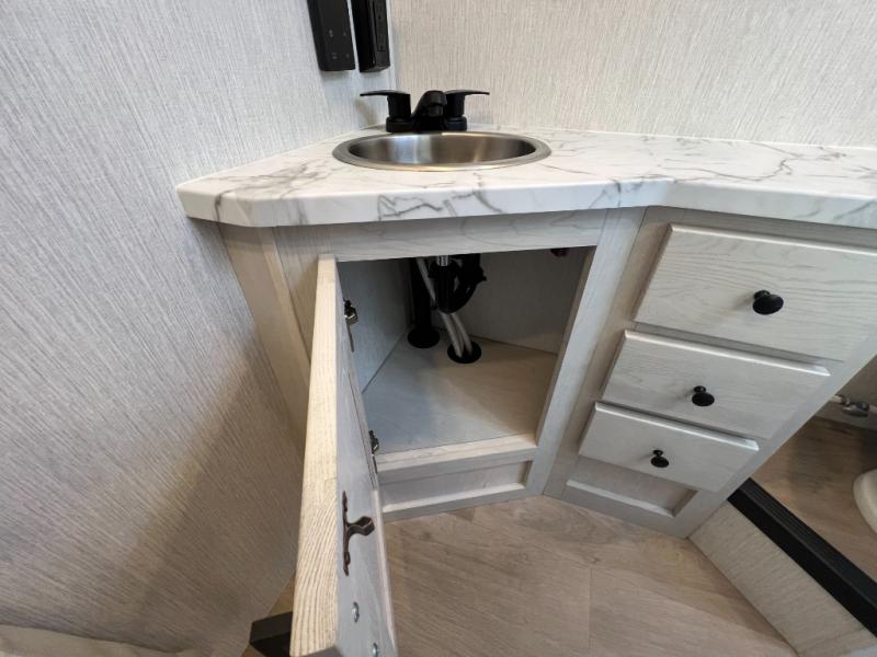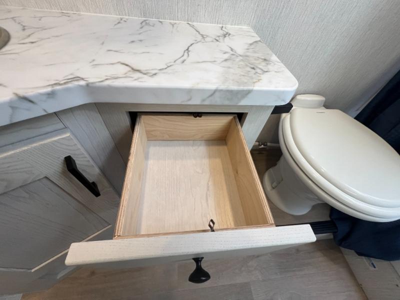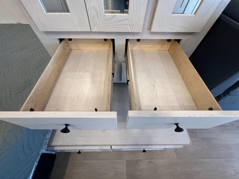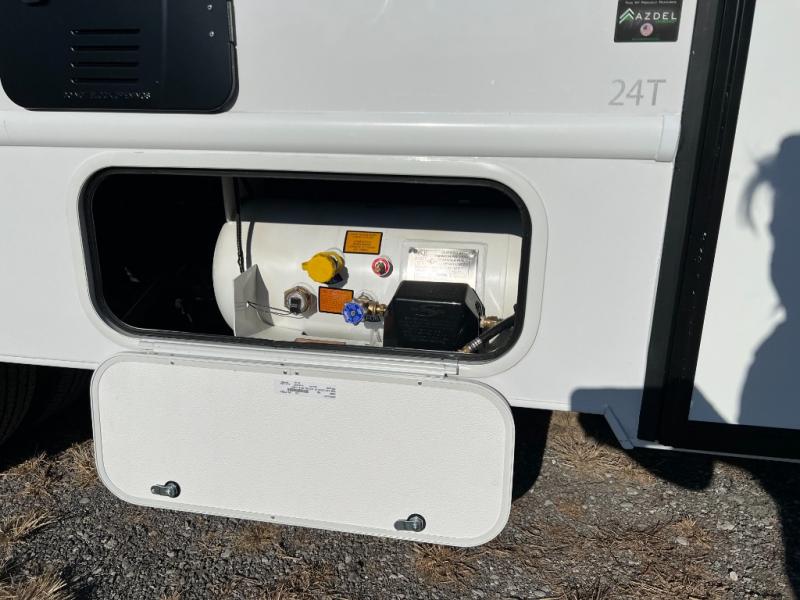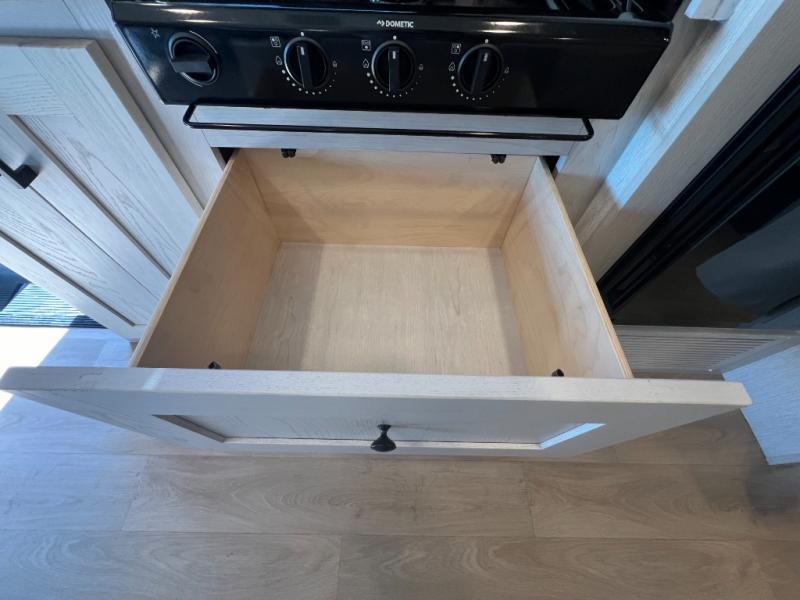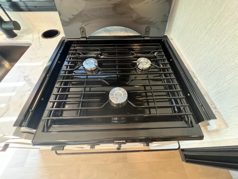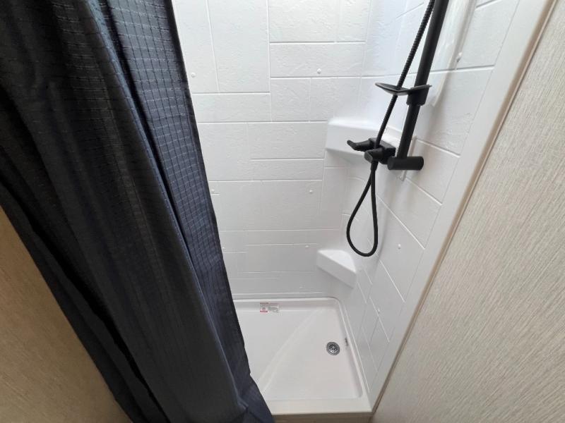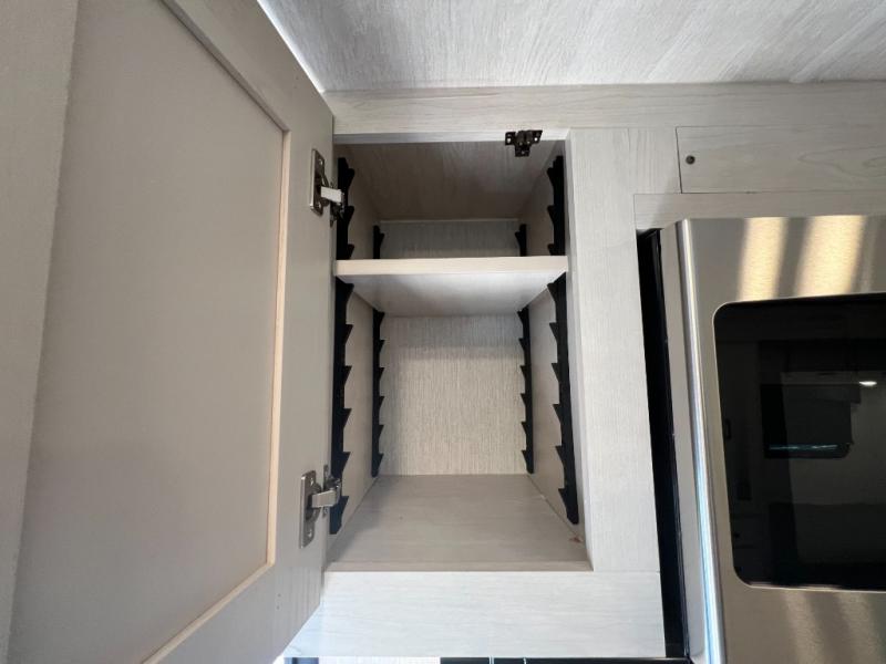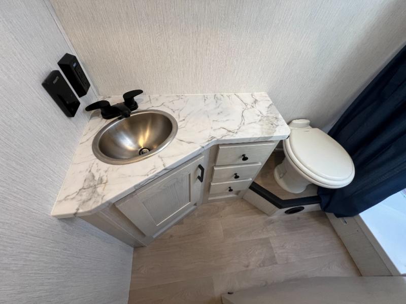 Pack your bags and head across the country in this cozy coach! Get a good night's rest each night on the deluxe innerspring 60" x 74" queen bed, and freshen up in the morning with the shower with a skylight in the rear corner bathroom. And there is a wardrobe beside the bed to keep your clothes out of the way too. Grab some eggs from the 10 cu. ft. 12V refrigerator then head to the three burner cooktop to fry them up. You can then enjoy them at the booth dinette within the full-wall slide, which can also transform into an extra sleeping space. The bunk over cab is also another sleeping space or it can be used for storage!