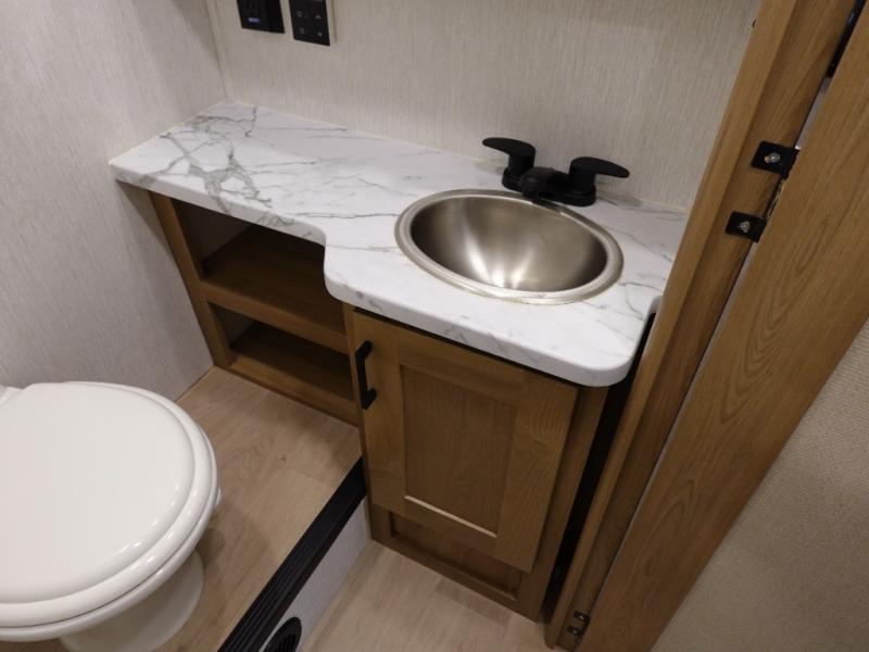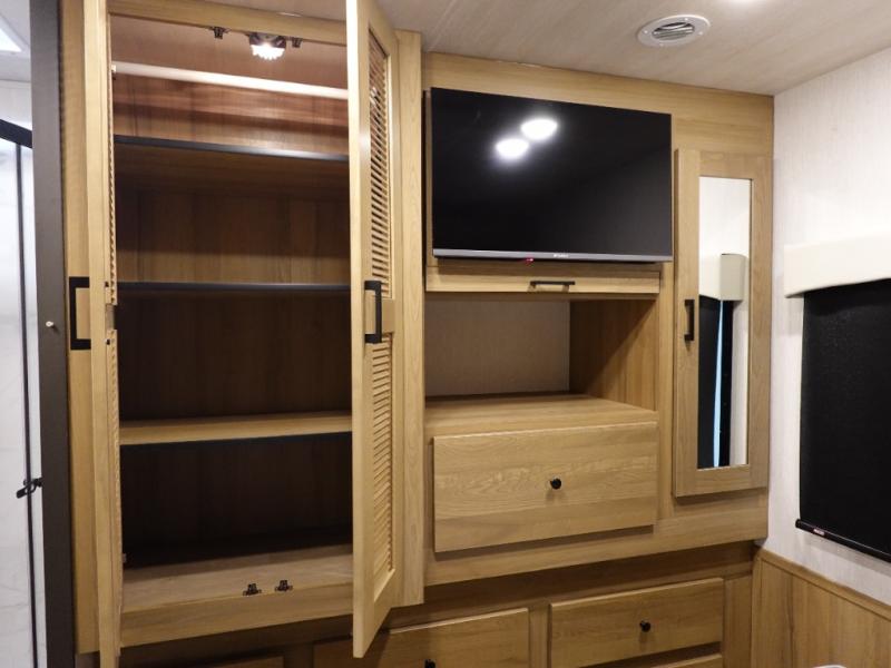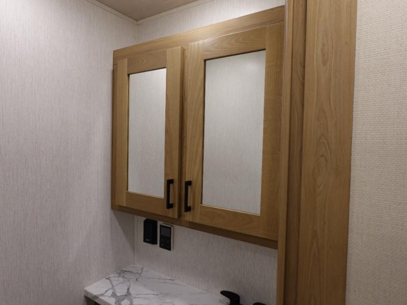 This Super C diesel motorhome offers something for everyone. The front living area features a jackknife sofa across from a roomy booth dinette, where you’ll enjoy the meals you prepare in the kitchen. With a three-burner cooktop and an over-the-range microwave, you’ll feel like you’re cooking at home. The rear bedroom area offers an efficient use of space with tons of storage including overhead cabinets and a full wardrobe closet. There’s even an area prewired for an optional washer/dryer. The center bath is split with the shower across the hall so two people can use the facilities at the same time.