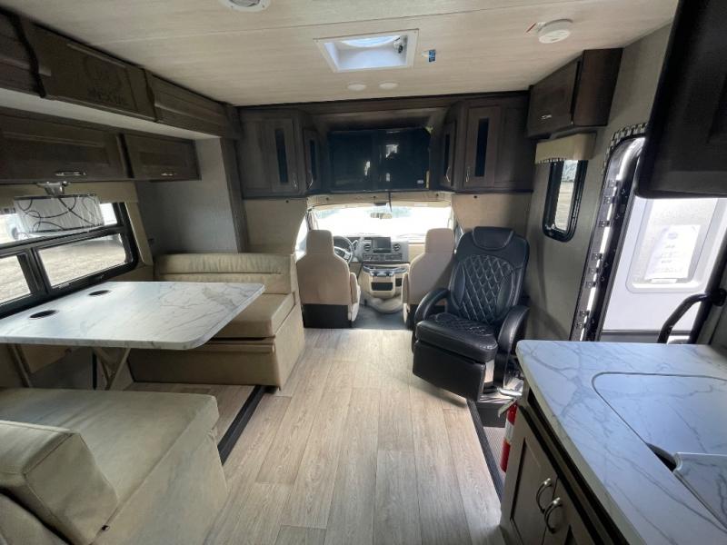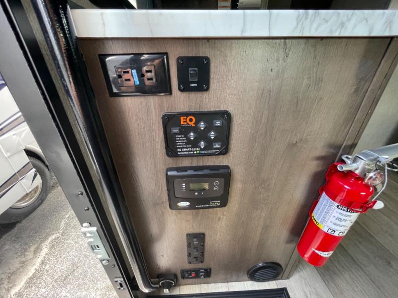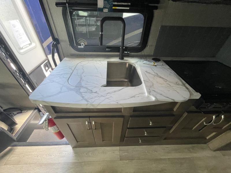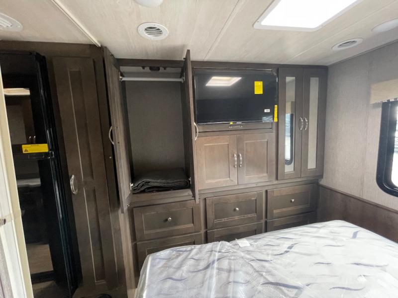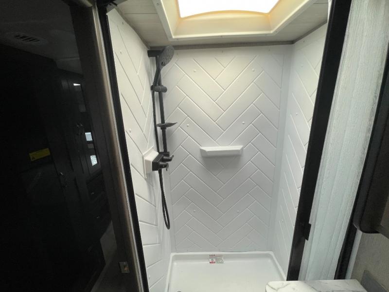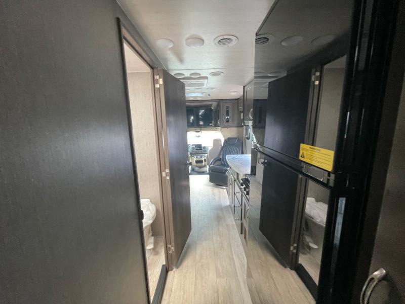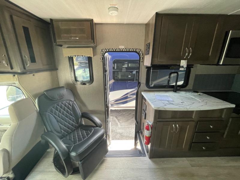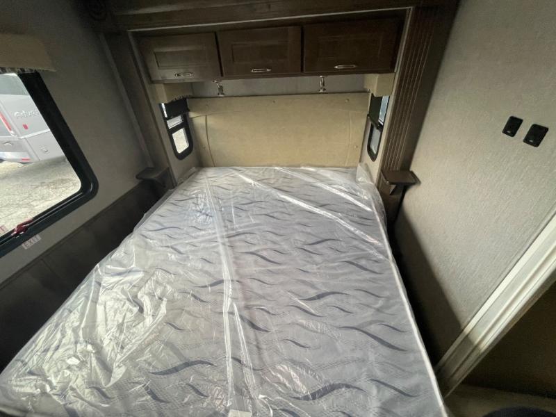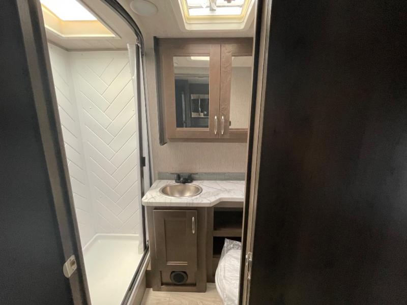Whether you travel with your family on long vacations or your spouse for months at a time, this spacious Class B+ offers two slide outs giving you lots of floor space to enjoy at any destination. The cook will love having a 10 cu. ft. refrigerator to carry lots of goodies especially when the family joins you, and there is storage found throughout in overhead cabinets for your dishes and such. The full bathroom is in between the main area and the rear bedroom and offers a shower with a flexible hose shower head, a skylight for more headroom in the shower, and a vinyl door, plus everything else needed to stay refreshed. The rear window in your bedroom will provide great views while you lay in your queen bed slide out! You will have a wardrobe to keep your clothing ready for shopping in town or venturing outdoors, and you might like to add the optional LED TV. You will also find a 4.0 KW generator, an LP quick disconnect, and a 7,500 lb. hitch if you decide to tow something.