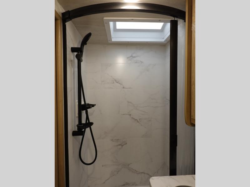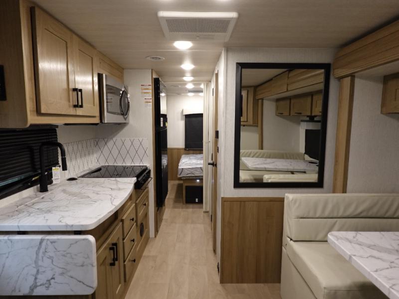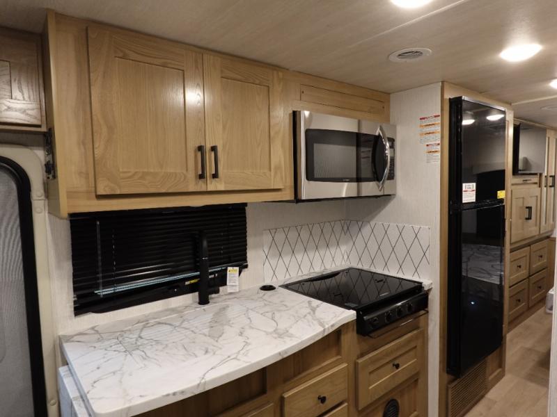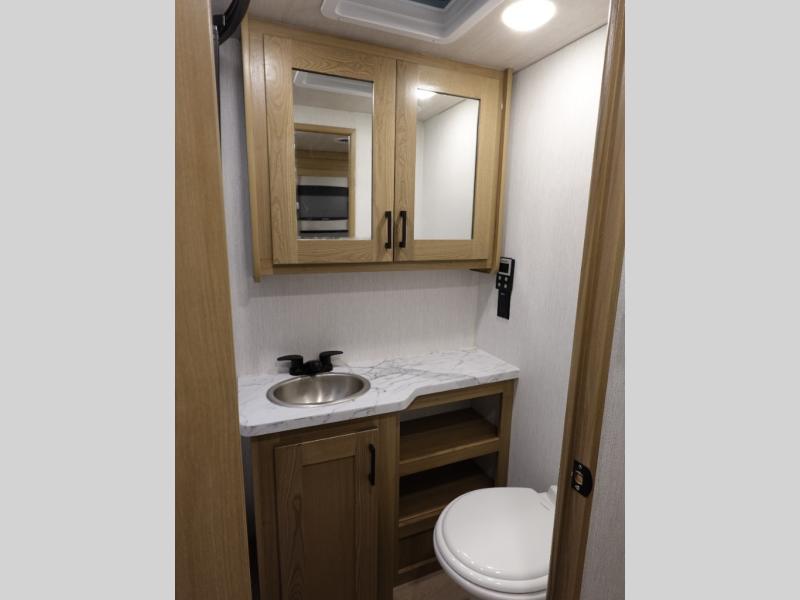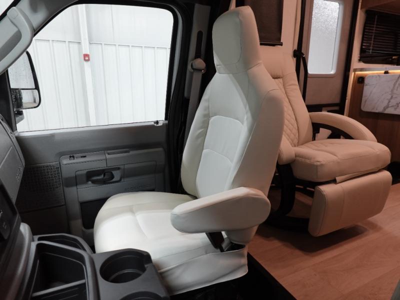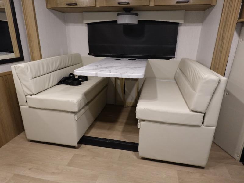 Whether you travel with your family on long vacations or your spouse for months at a time, this spacious Class B+ offers two slide outs giving you lots of floor space to enjoy at any destination. The cook will love having a 10 cu. ft. refrigerator to carry lots of goodies especially when the family joins you, and there is storage found throughout in overhead cabinets for your dishes and such. The full bathroom is in between the main area and the rear bedroom and offers a shower with a flexible hose shower head, a skylight for more headroom in the shower, and a vinyl door, plus everything else needed to stay refreshed. The rear window in your bedroom will provide great views while you lay in your RV queen bed slide out! You will also find an NPS 4500 generator, an LP quick disconnect, and a 7,500 lb. hitch if you decide to tow something.