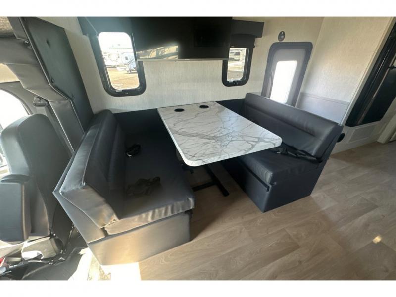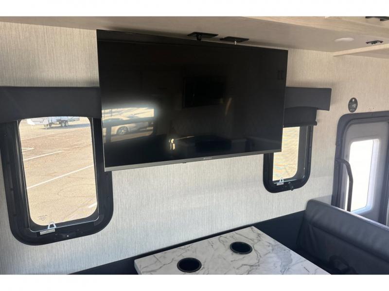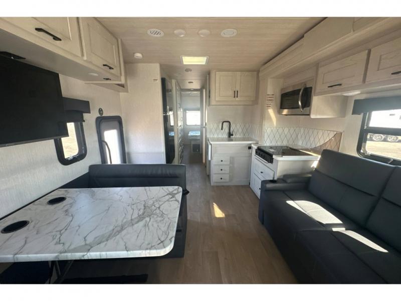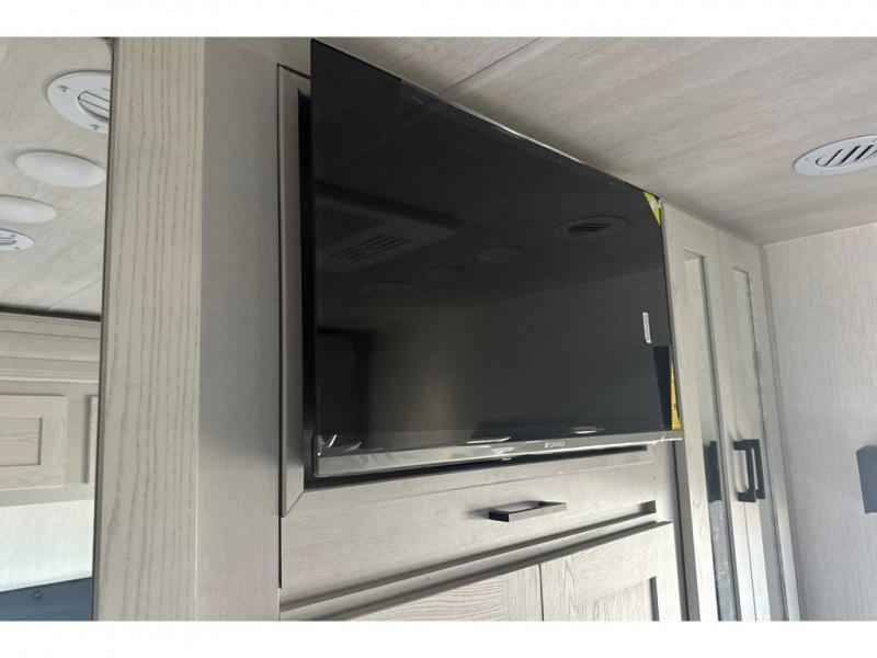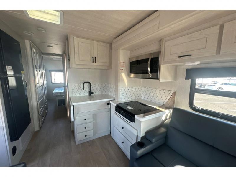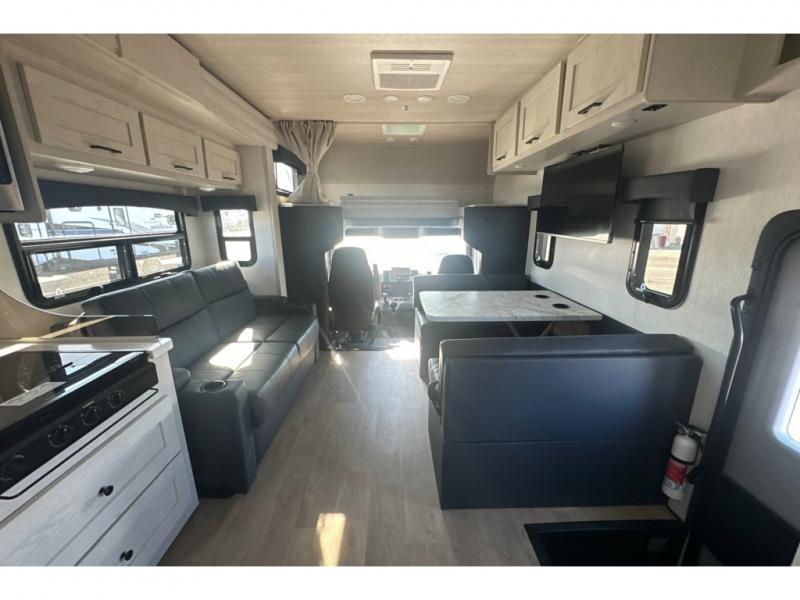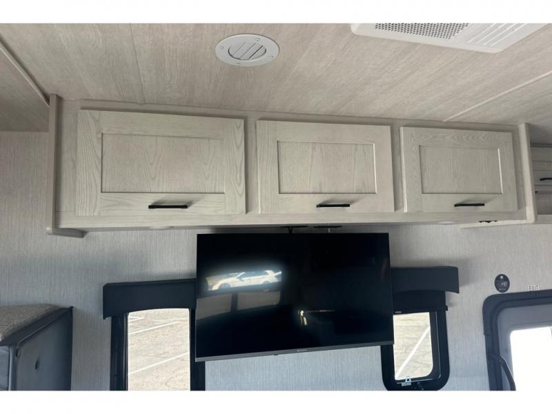 Pack your bags and load up into this motorhome for a fun vacation! It features a rear private bedroom with a queen bed slide for more interior space, a wardrobe for your clothes, and an optional TV for added entertainment. Freshen up each morning in the full bathroom with the shower with a flexible hose shower head, vinyl shower door, and skylight to bring the outdoors inside. The fully equipped kitchen has everything you need to whip up a home cooked meal and even an over the range stainless steel microwave with exhaust fan. Enjoy your meals at the booth dinette then relax on the deluxe tri-fold sofa while watching a movie with the flat screen TV. The bunk over cab even has an optional entertainment area that can be added and standard bunk storage for your guests things.
