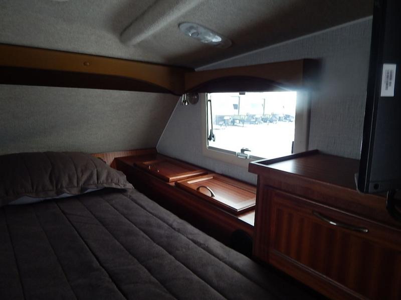 Enjoy a home on top of your long bed truck with this truck camper! Start each morning feeling recharged after sleeping on the front queen bed while your electronics recharge at the 12V USB charging stations. Fill your bellies with fried bacon and eggs cooked on the three burner stove with oven and drink a cold glass of orange juice stored in the 8 cu. ft. refrigerator. Plus, you can eat your meals at the face-to-face dinette and transform into an extra sleeping space. You can even freshen up each morning in the dry bath with extra room, a divider that separates the shower from the toilet, and a built-in shower seat. There is plenty of storage throughout with closets and overhead cabinets too!