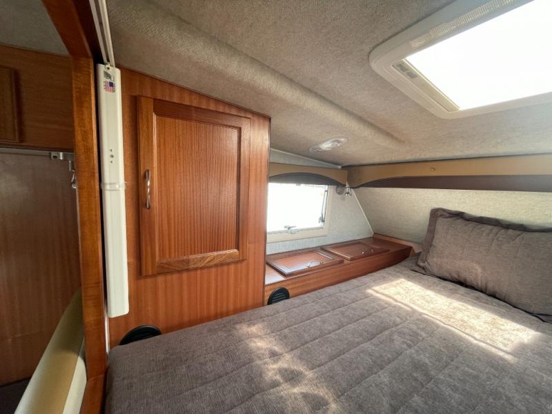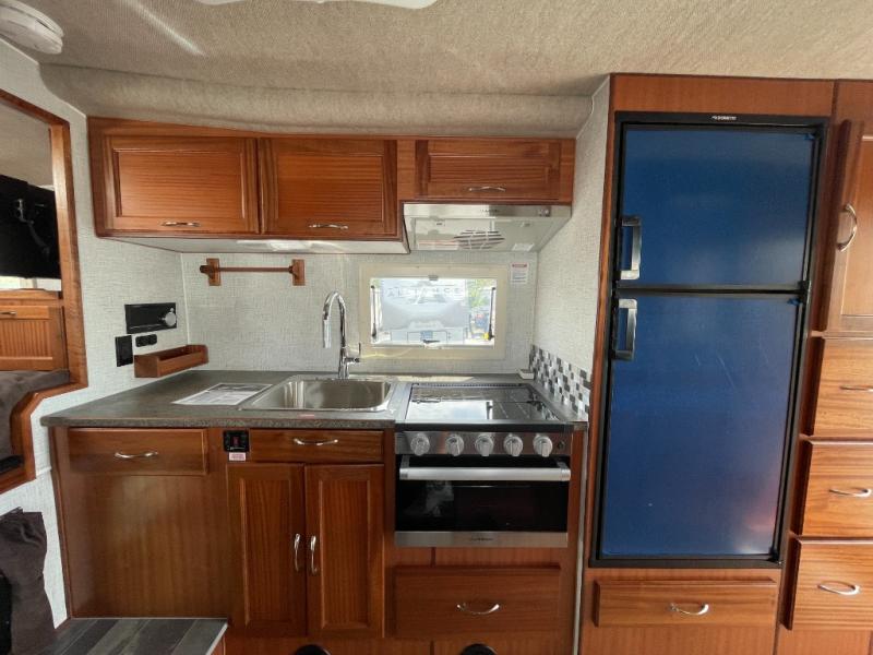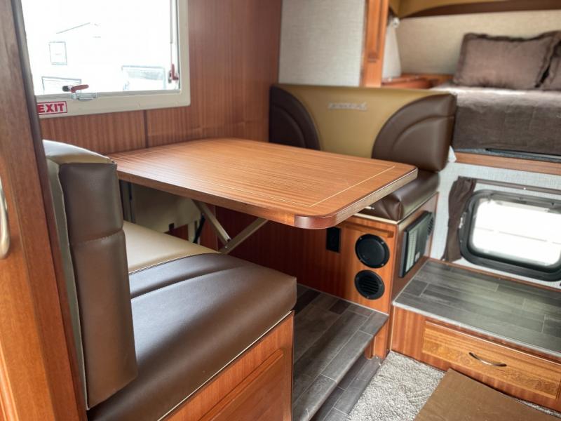 Enjoy a home on top of your long bed truck with this truck camper! Start each morning feeling recharged after sleeping on the front queen bed while your electronics recharge at the 12V USB charging stations. Fill your bellies with fried bacon and eggs cooked on the three burner stove with oven and drink a cold glass of orange juice stored in the 6.3 cu. ft. three way refrigerator. Plus, you can eat your meals at the face-to-face dinette and transform into an extra sleeping space. You can even freshen up each morning in the wet bath. There is plenty of storage throughout with closets and overhead cabinets too!