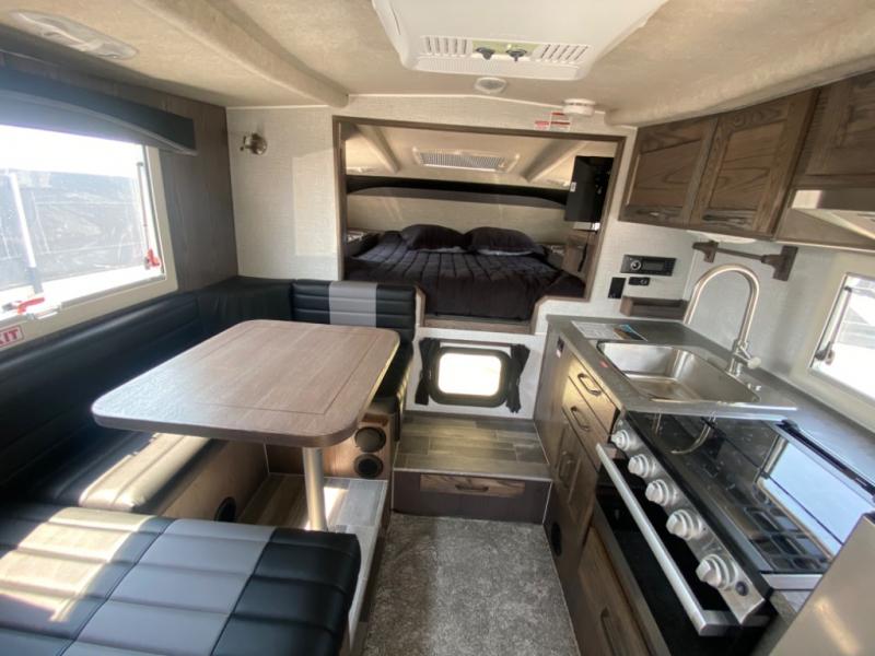 If you have a short bed truck then you need this truck camper for your next adventure! Start each morning feeling recharged after sleeping on the front queen bed while your electronics recharge at the 12V USB charging stations. Fill your bellies with fried bacon and eggs cooked on the three burner stove with oven and drink a cold glass of orange juice stored in the refrigerator. Plus, you can eat your meals at the face-to-face dinette and transform into an extra sleeping space. You can even freshen up each morning in the wet bath. There is plenty of storage throughout with closets and overhead cabinets too!