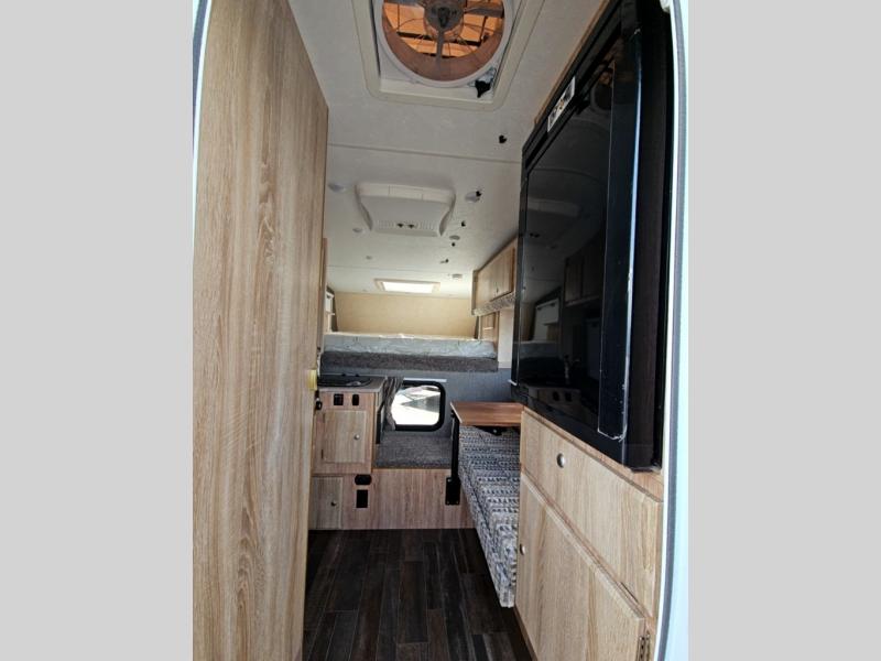 You're looking at the shortest and lightest truck camper that is designed to fit ultra short beds (5' 6" to 5' 10") and short bed (6' 4" to 6' 10") 1/2 ton or larger trucks! Even though it is compact in size, it still has all of the features needed for a comfortable trip like a front cabover queen-size bed with storage on either side and a TV stand at the foot of the bed. The LED lighting will help you see what you are cooking on the two burner stove day or night, and the seating area has a table for you to enjoy your meals. You even have a wet bath to freshen up in each morning with a cassette toilet, as well as an exterior spray port shower to rinse off the mud!