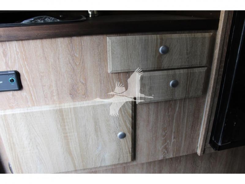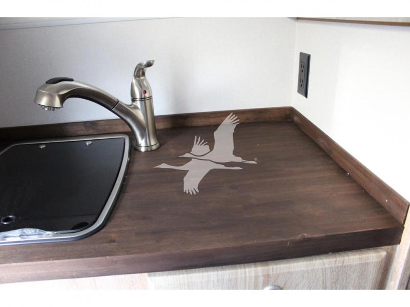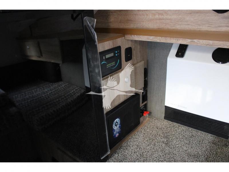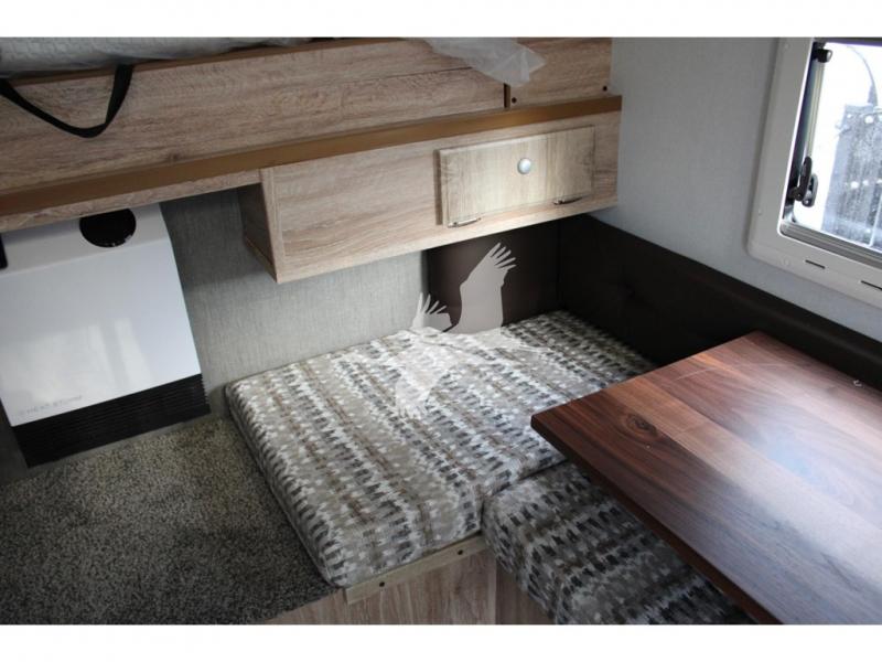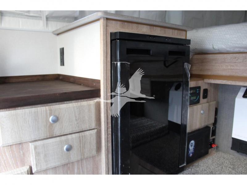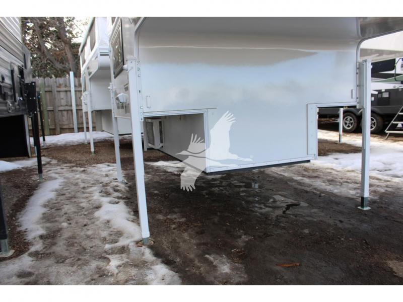 UPGRADED STANDARD EQUIPMENT: HappiJac (4220) Removable 4 Corner Jacks Screened Entry Door w/Deadbolt Lift Up Cabover Bed Storage (5.5" Depth) w/Gas Struts Extended Cabover (North/South) w/Side Hampers Sure Sleep" 6" Gel/Foam Mattress Gas Strut Entry Door Stop Aviation Cabinet Latches Galley Overhead Cabinet w/Dimmer LED Interior Access Doors For Inside Truck Bed Tiedown System Rear Wall Ladder (50" 4 Rung) Genuine Anodized Black Lagun Table System Acacia Wood Kitchen Countertop Teak Cutting Board Sink Insert