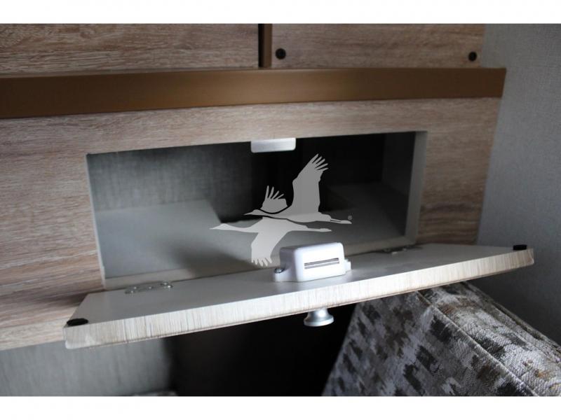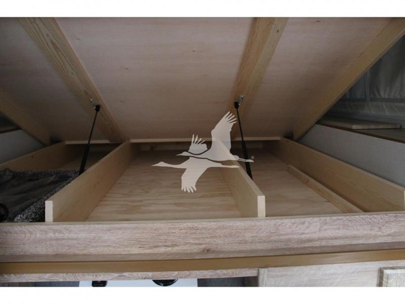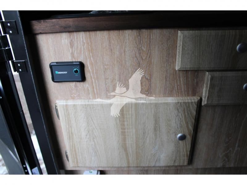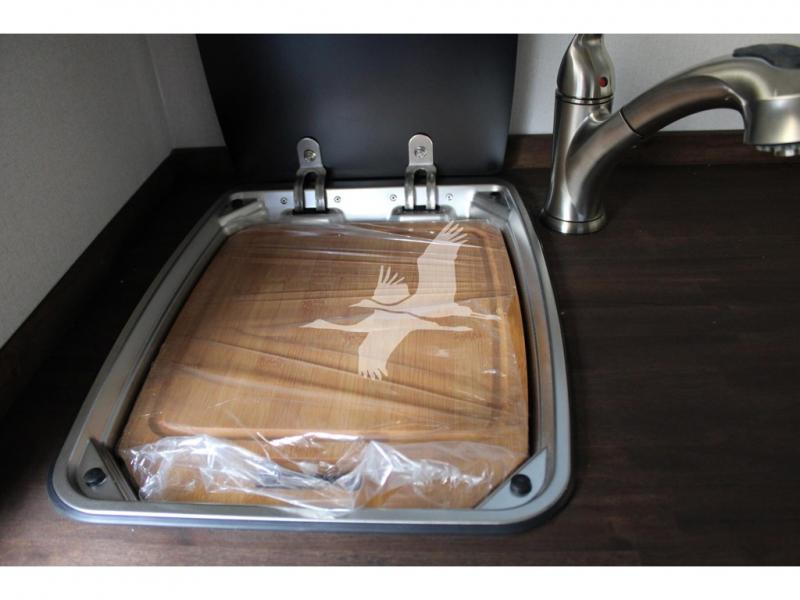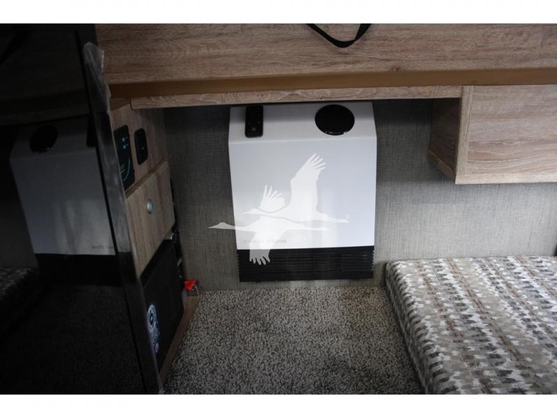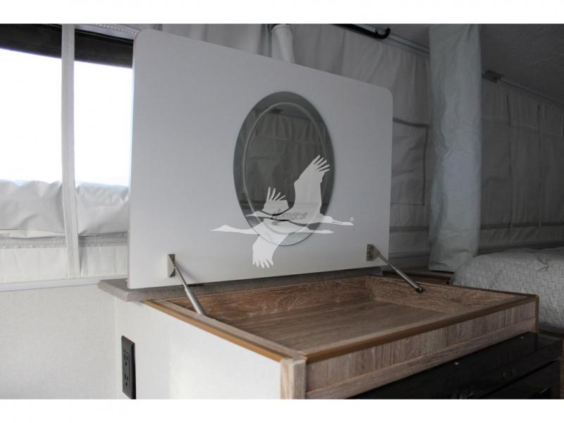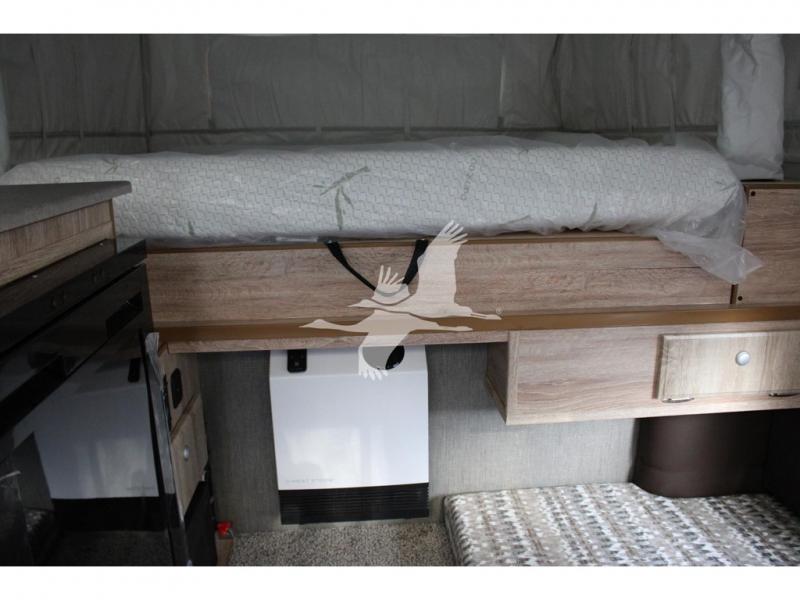 UPGRADED STANDARD EQUIPMENT: HappiJac (4220) Removable 4 Corner Jacks Screened Entry Door w/Deadbolt Lift Up Cabover Bed Storage (5.5" Depth) w/Gas Struts Extended Cabover (North/South) w/Side Hampers Sure Sleep" 6" Gel/Foam Mattress Gas Strut Entry Door Stop Aviation Cabinet Latches Galley Overhead Cabinet w/Dimmer LED Interior Access Doors For Inside Truck Bed Tiedown System Rear Wall Ladder (50" 4 Rung) Genuine Anodized Black Lagun Table System Acacia Wood Kitchen Countertop Teak Cutting Board Sink Insert