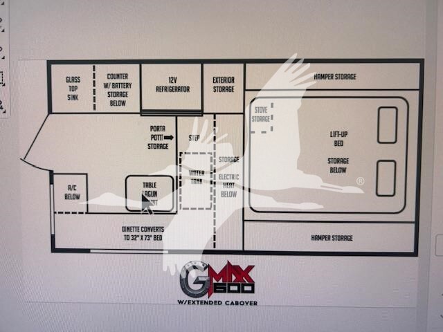 G-MAX 600 All Electric Pop Up Truck Camper designed to fit all of the smaller trucks such as Gladiator, Tacoma, Ranger, Frontier, Colorado and Canyon. This camper will not fit full size trucks, the correct model for full size trucks would be the G-MAX 650. The Upgraded Electric System includes, but is not limited to: 3.5 CF 12v Compressor fridge, 6,000 BTU AC, 2 x 200 Watt Solar panel w/ Blue Tooth Module, Electric Infrared Heater w/Digital Thermostat, Dual Induction Electric Stove, 3,000 Watt Inverter, 280 Amp Hr. Lithium Battery and Electric Roof Lift. This unit includes the following options: Pre-wire electric jacks LED accent lights under outs 2nd 280amp lithium battery (total of two batteries) Clear entry door window with snap cover Fresh water cleaning port All of the electronics in the G-Max 600 are designed to operate from the included 280 Amp Hr. Lithium Battery. Features