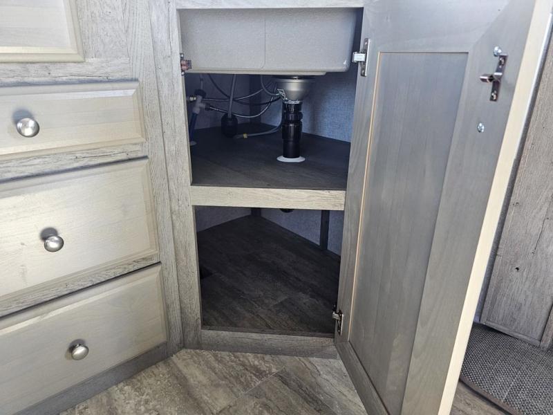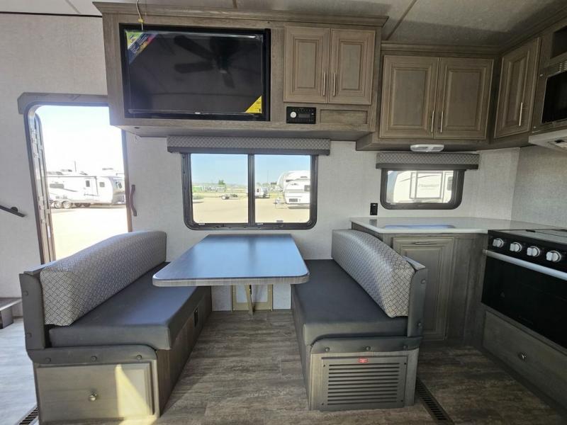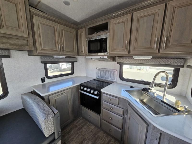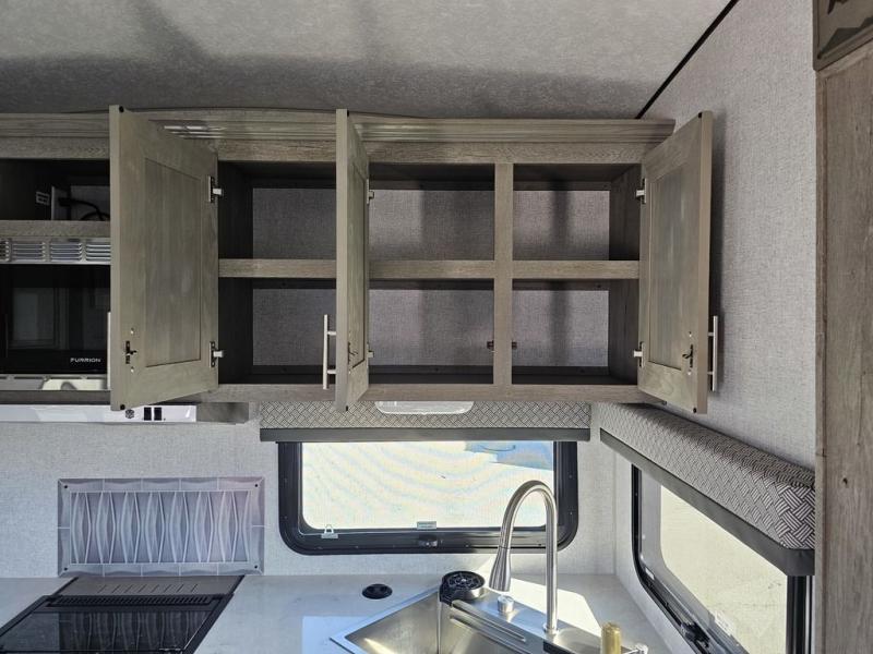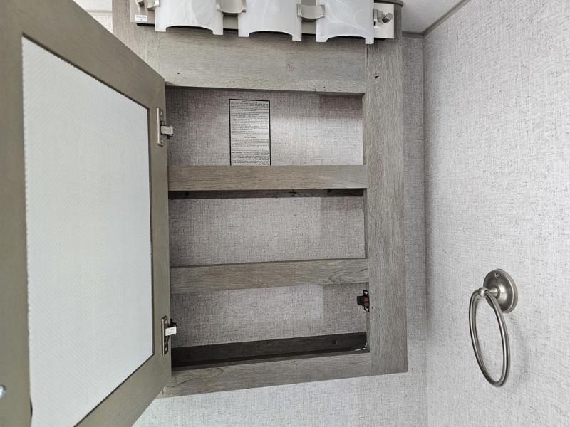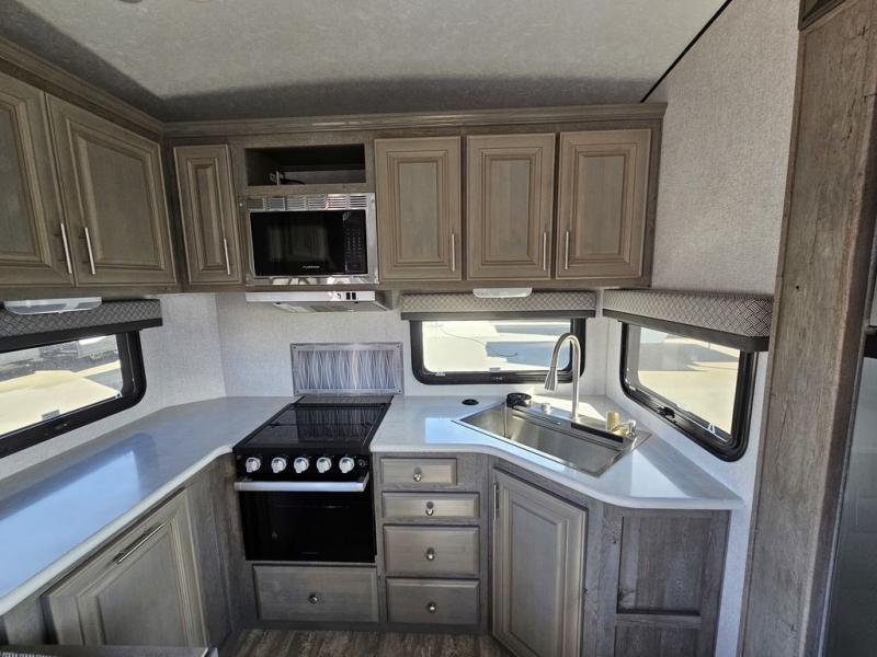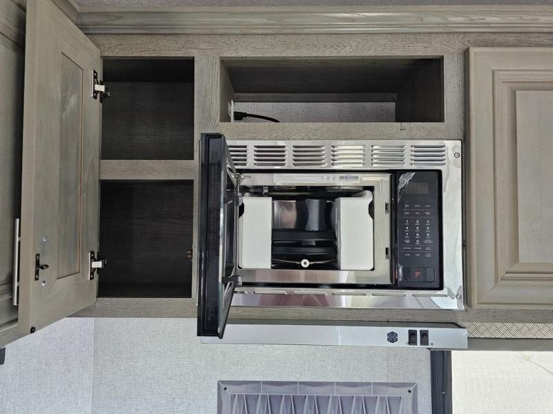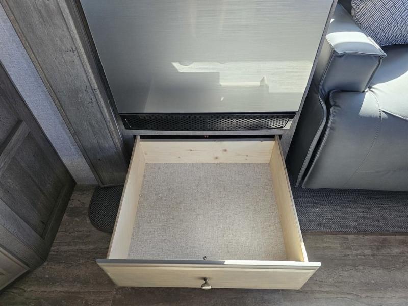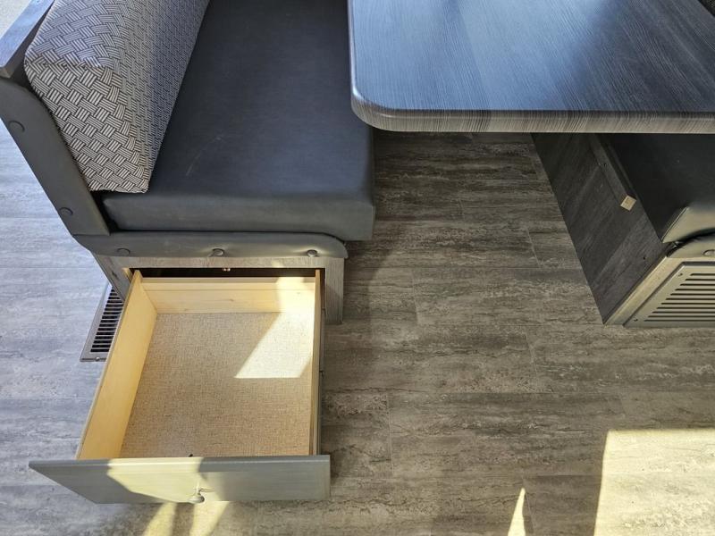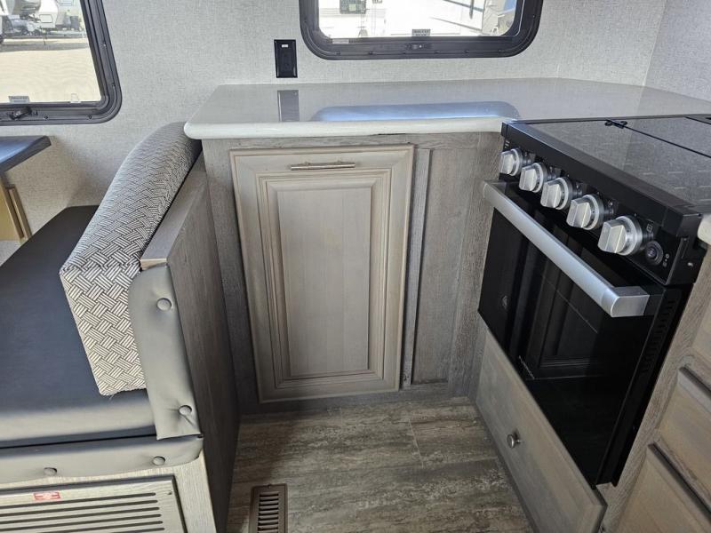 Pack your bags and head to your local state park for fun trips in this rear kitchen travel trailer. There is a three burner range and residential style microwave with an air fryer to whip up your best meals, and you're sure to appreciate the generous counter space. The mudroom bench provides a place to pull your hiking boots off, and the pantry lets you keep snacks stocked. This space also includes a booth dinette that converts to a 40" x 76" sleeping area for guests plus theater seating within a slide for more comfort and space. A spacious full bath will let you freshen up after a day outdoors, and a front private bedroom will make you feel right at home. There is a queen bed here, along with dual bedside wardrobes and a wardrobe slide for more space when getting dressed in the morning!
