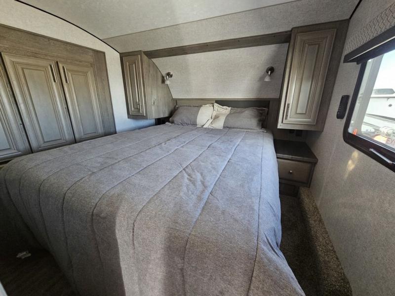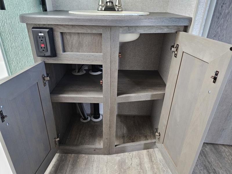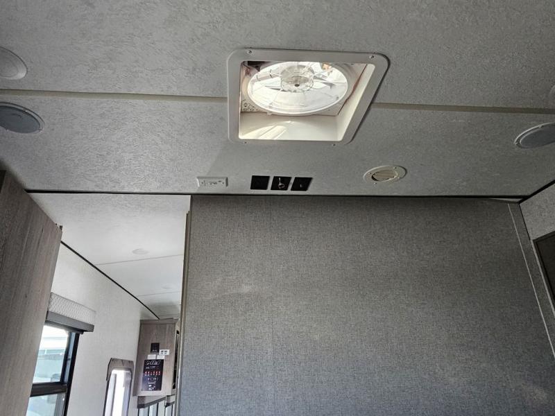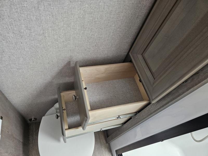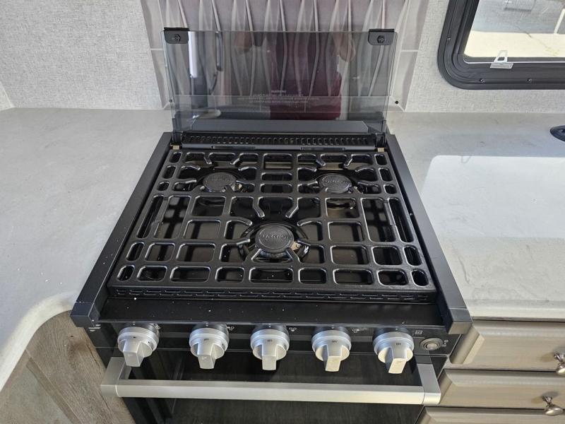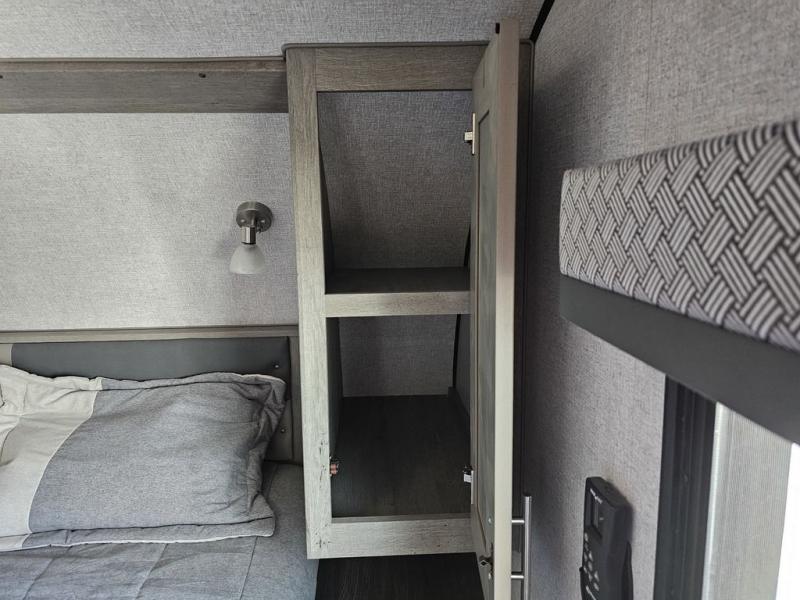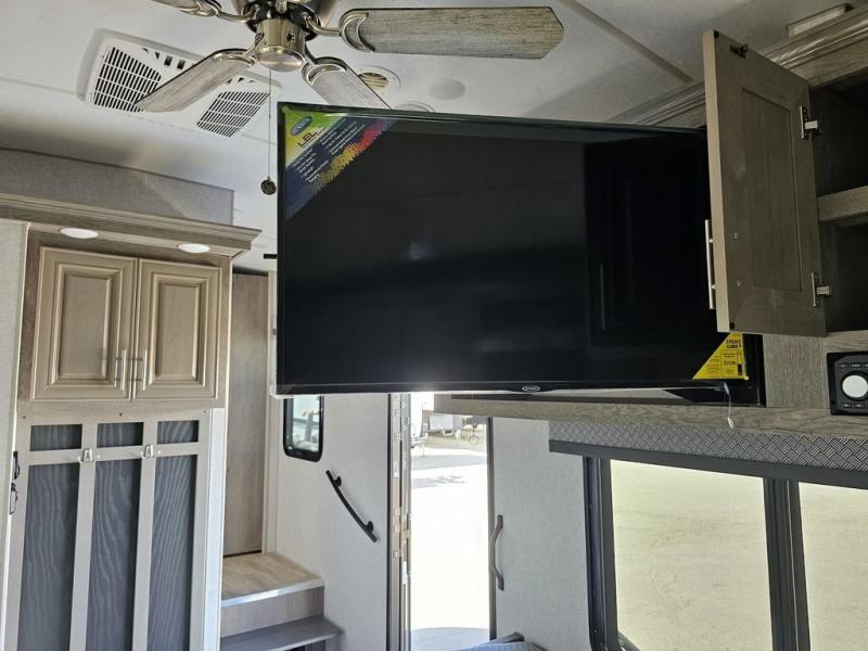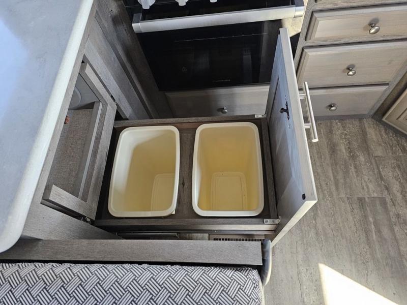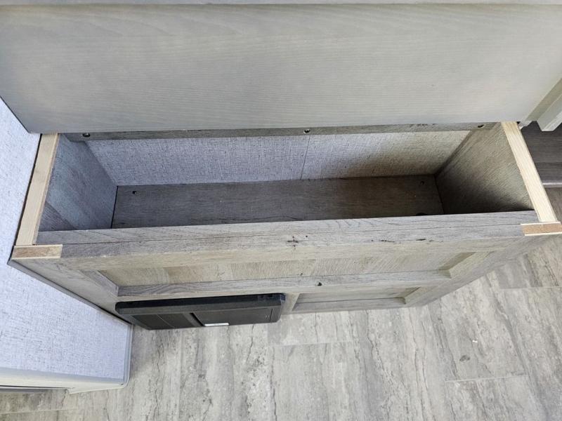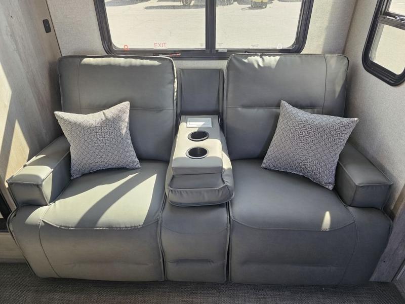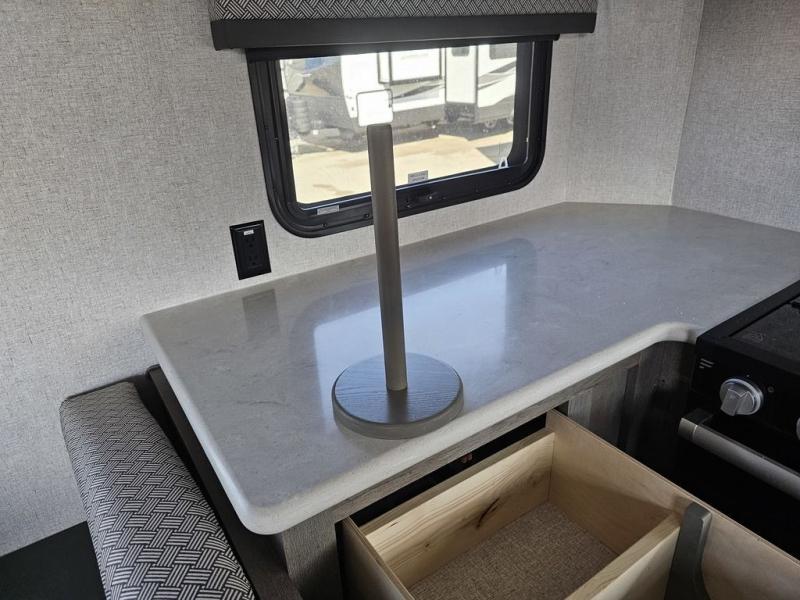 Pack your bags and head to your local state park for fun trips in this rear kitchen travel trailer. There is a three burner range and residential style microwave with an air fryer to whip up your best meals, and you're sure to appreciate the generous counter space. The mudroom bench provides a place to pull your hiking boots off, and the pantry lets you keep snacks stocked. This space also includes a booth dinette that converts to a 40" x 76" sleeping area for guests plus theater seating within a slide for more comfort and space. A spacious full bath will let you freshen up after a day outdoors, and a front private bedroom will make you feel right at home. There is a queen bed here, along with dual bedside wardrobes and a wardrobe slide for more space when getting dressed in the morning!