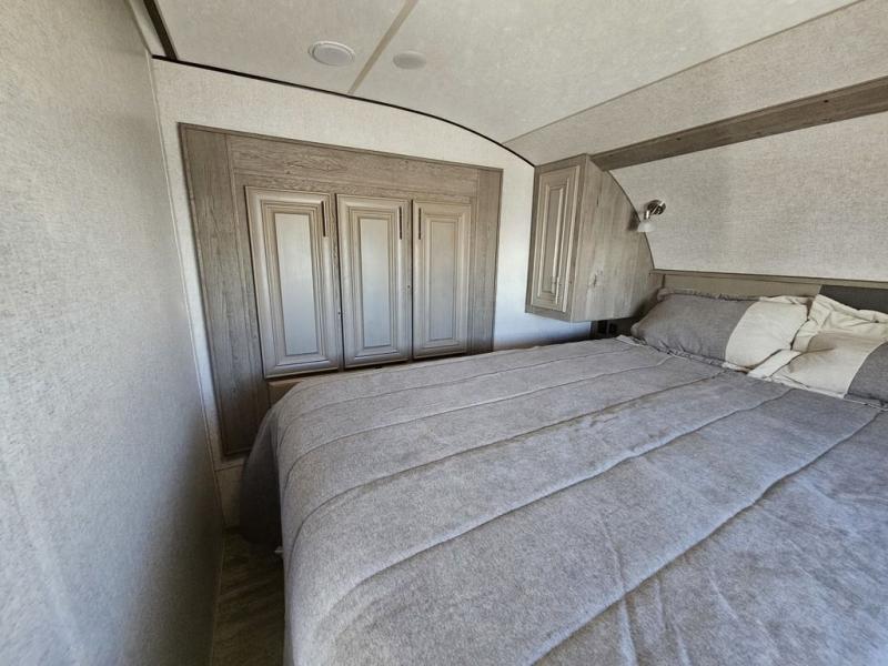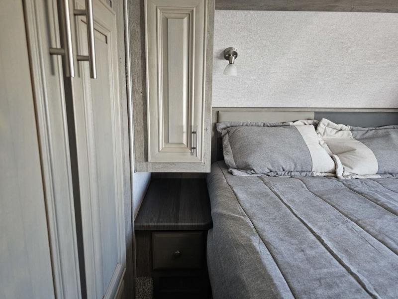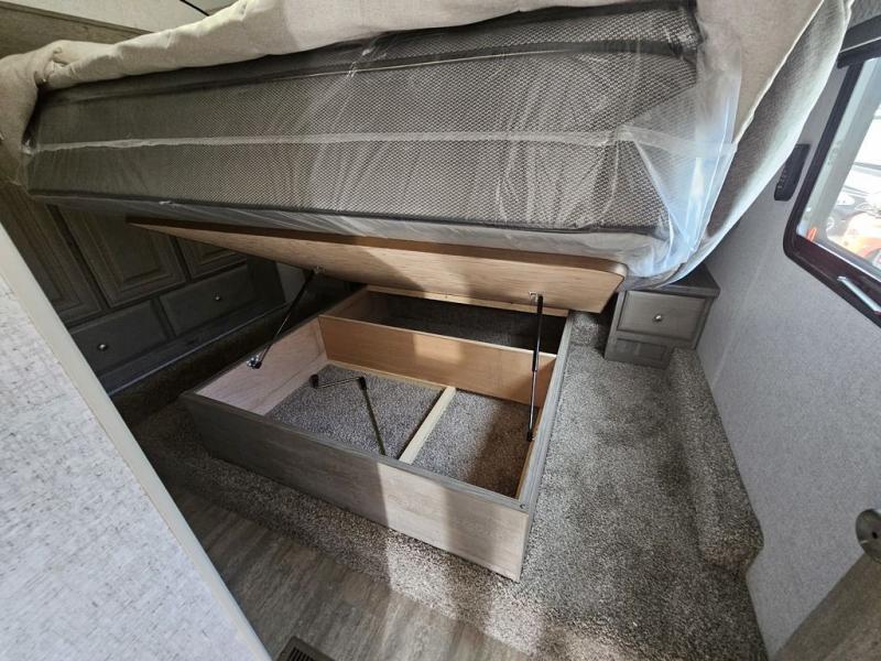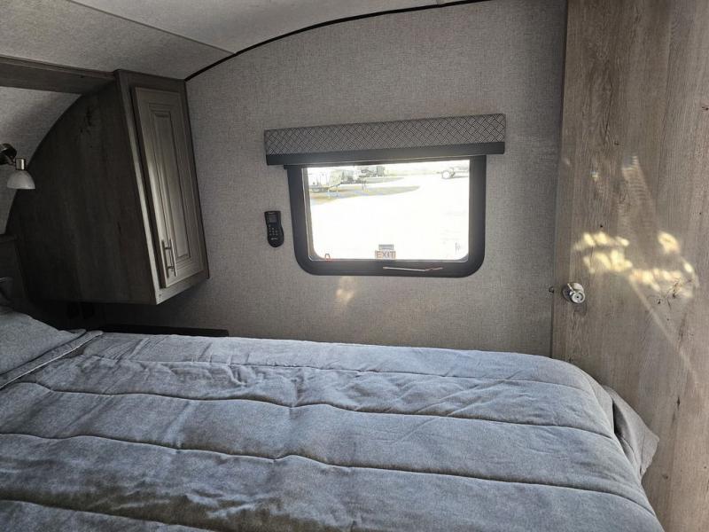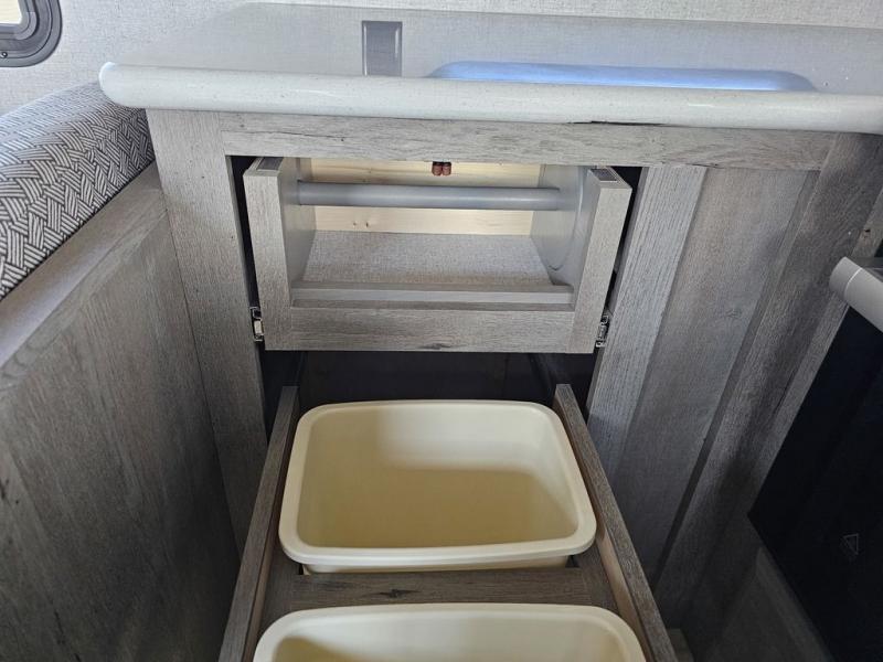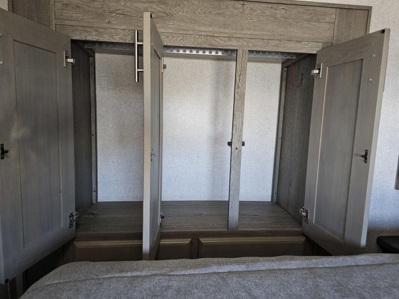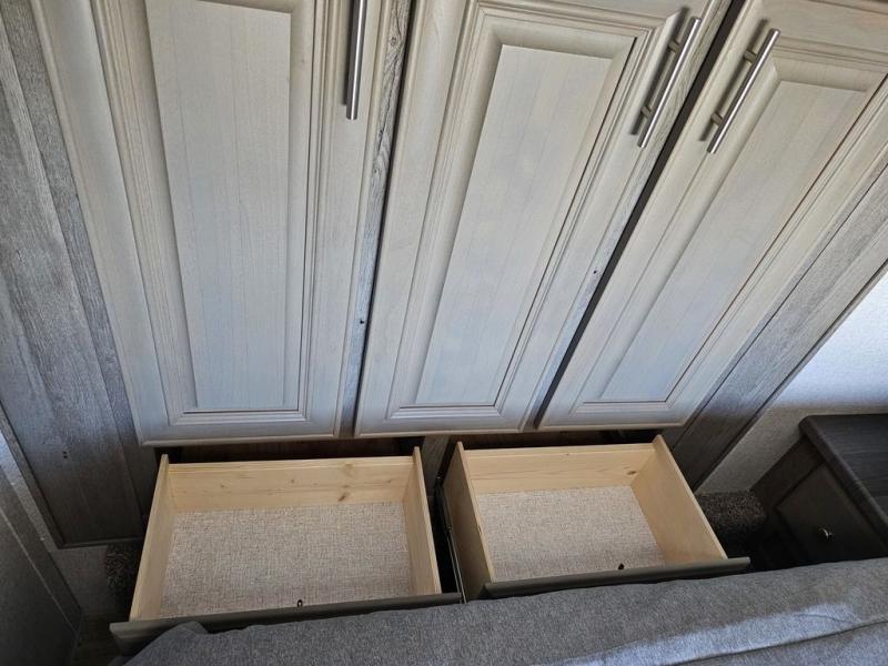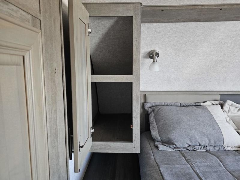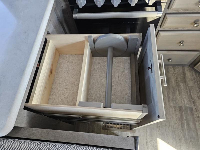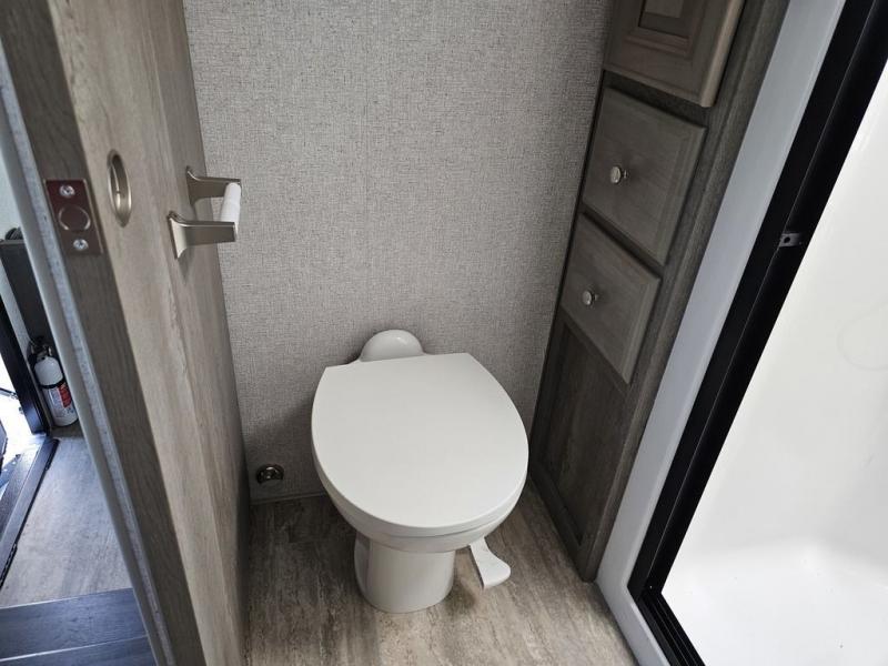 Pack your bags and head to your local state park for fun trips in this rear kitchen travel trailer. There is a three burner range and residential style microwave with an air fryer to whip up your best meals, and you're sure to appreciate the generous counter space. The mudroom bench provides a place to pull your hiking boots off, and the pantry lets you keep snacks stocked. This space also includes a booth dinette that converts to a 40" x 76" sleeping area for guests plus theater seating within a slide for more comfort and space. A spacious full bath will let you freshen up after a day outdoors, and a front private bedroom will make you feel right at home. There is a queen bed here, along with dual bedside wardrobes and a wardrobe slide for more space when getting dressed in the morning!