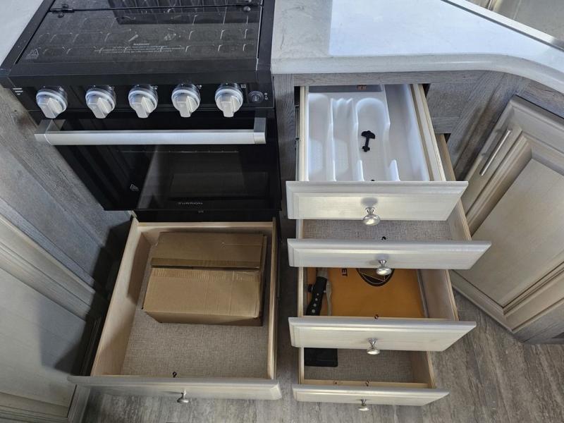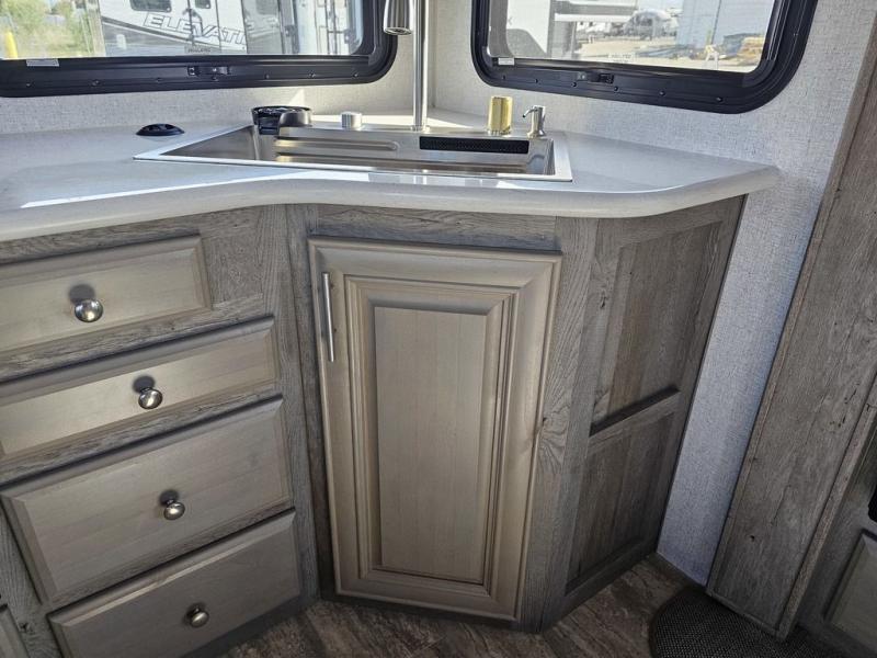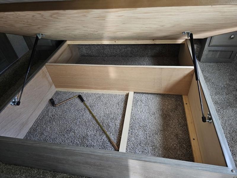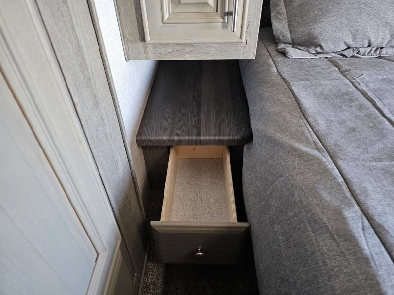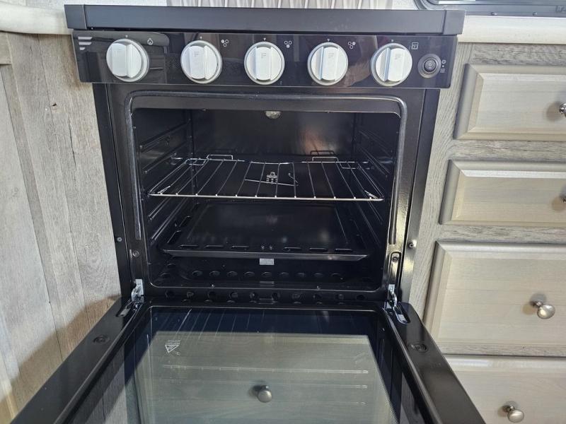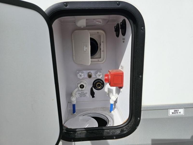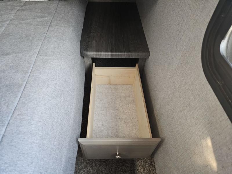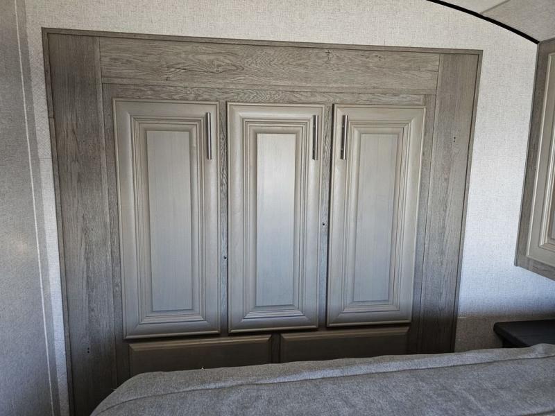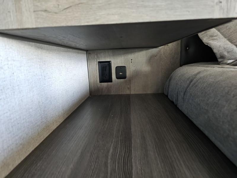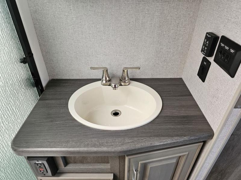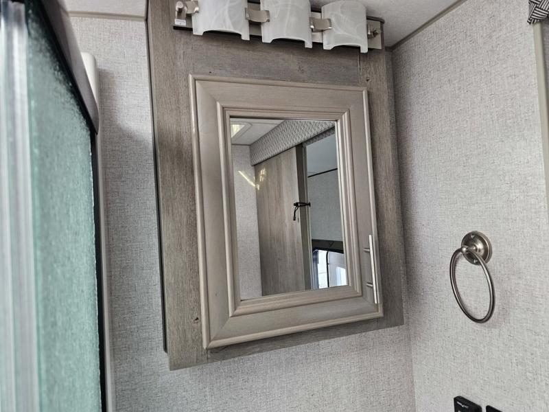 Pack your bags and head to your local state park for fun trips in this rear kitchen travel trailer. There is a three burner range and residential style microwave with an air fryer to whip up your best meals, and you're sure to appreciate the generous counter space. The mudroom bench provides a place to pull your hiking boots off, and the pantry lets you keep snacks stocked. This space also includes a booth dinette that converts to a 40" x 76" sleeping area for guests plus theater seating within a slide for more comfort and space. A spacious full bath will let you freshen up after a day outdoors, and a front private bedroom will make you feel right at home. There is a queen bed here, along with dual bedside wardrobes and a wardrobe slide for more space when getting dressed in the morning!