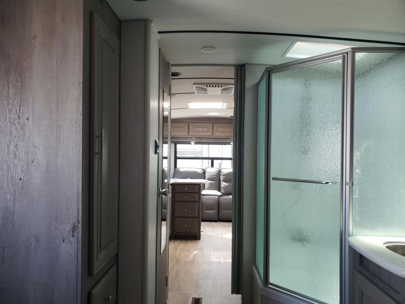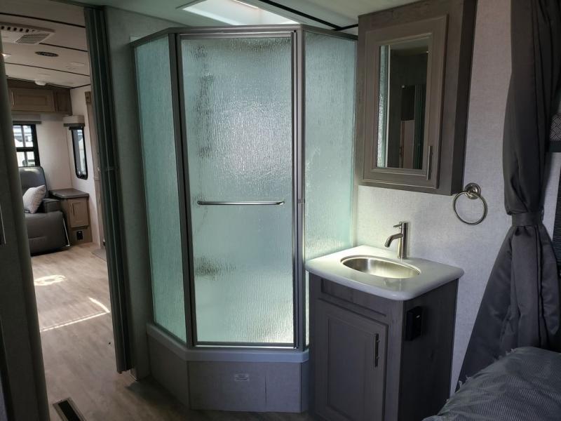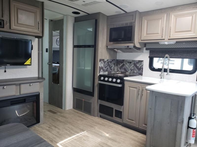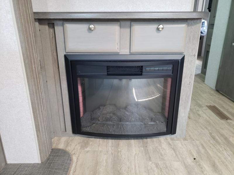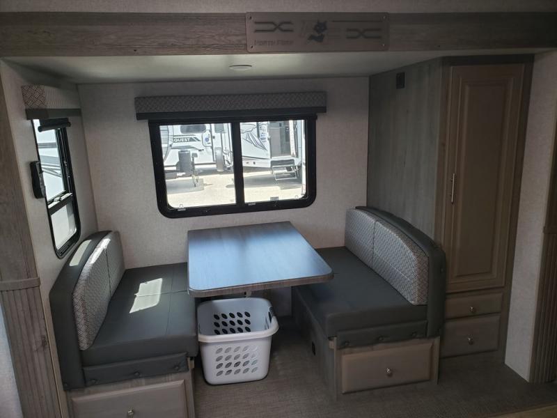 You won't have anything stopping you from having a good time when you have this Arctic Fox North Fork travel trailer! A front queen-size bed in the master suite is a comfortable place to lay down each night, and you will appreciate having discreet access into the bathroom from your bedroom so that you can clean up in the neo-angled shower each morning, and there is a private toilet so two people can use this room at once. After you are ready for the day, you can grab a bowl of cereal from the pantry or fry up some eggs on the three-burner range. There is also a booth dinette that converts to a 40" x 72" sleeping area for guests, plus swivel rockers with end tables where you can enjoy your coffee at each morning. You can even switch out the swivel rockers for optional theater seating for even more comfort!