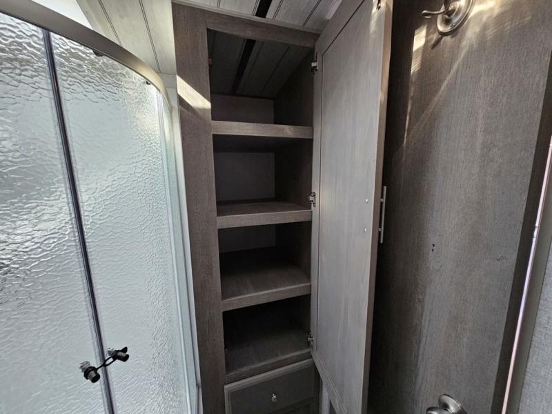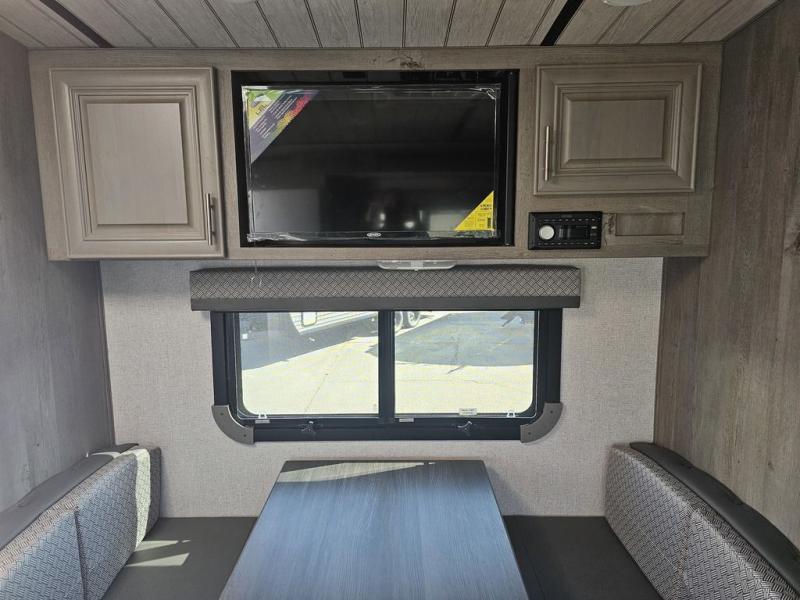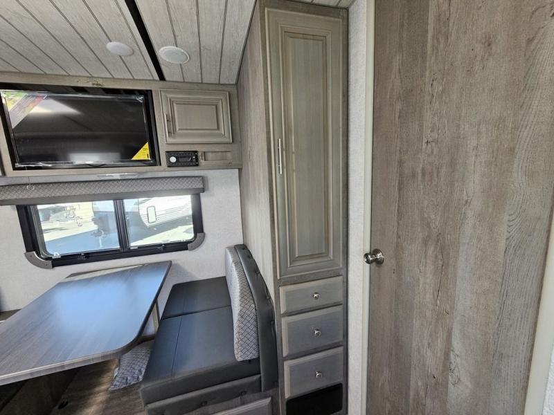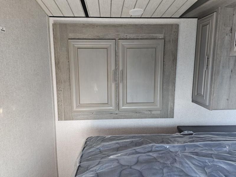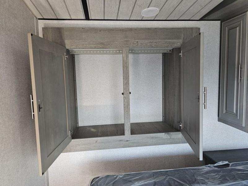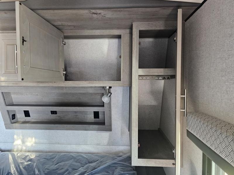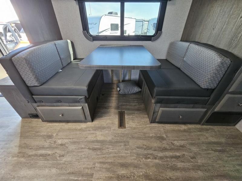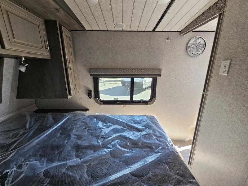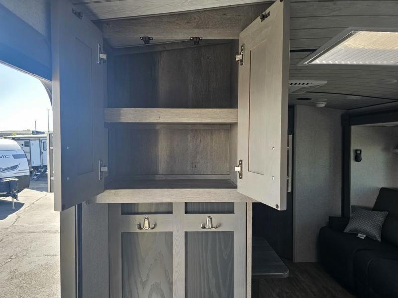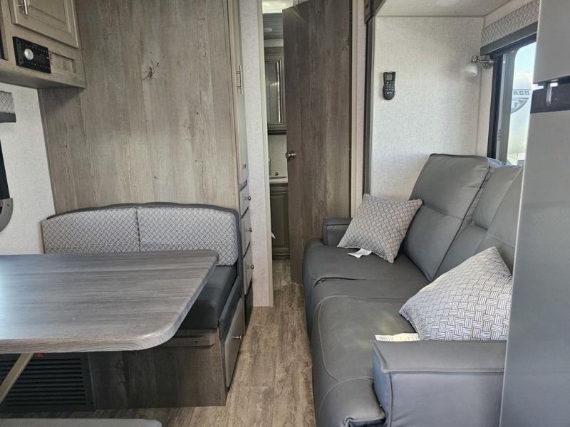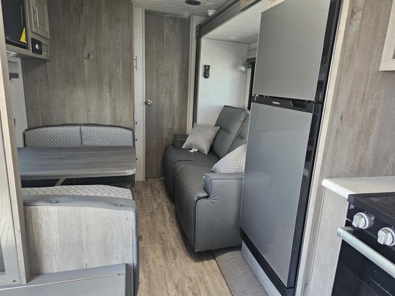 You will be enchanted by this travel trailer's amenities! The full rear bathroom provides a private and convenient space for freshening up. The kitchen has a fridge for keeping food and drinks fresh, a booth dinette for dining and socializing, and a three-burner cooktop for creating your favorite meals. Plus, overhead cabinets are placed throughout the trailer for ample storage of cookware and dishes. The living area boasts a spacious 62” sofa for relaxation, a mud bench for cleaning and storing outdoor gear, and a coat rack for hanging jackets and accessories. This unit's cozy front bedroom features two wardrobes on each side of the bed and a bigger one for storing clothing and essentials.