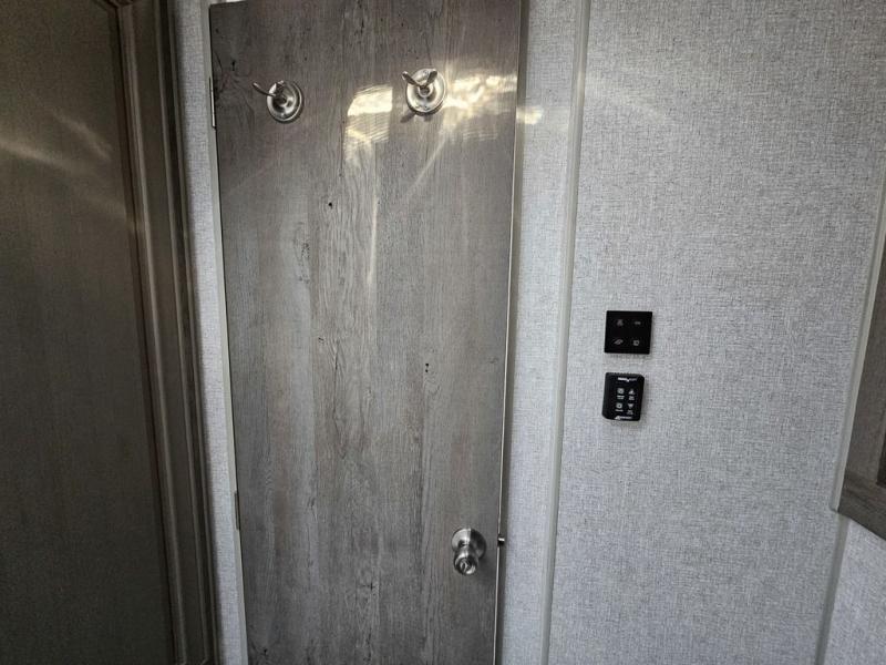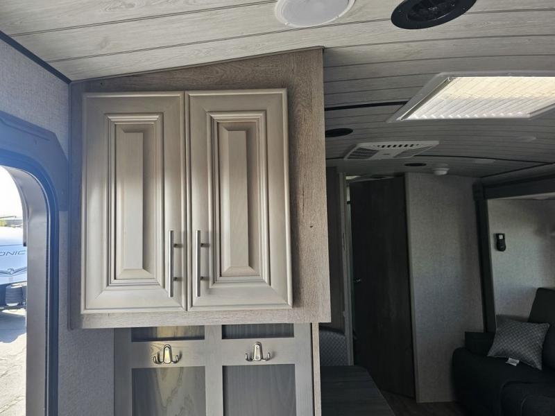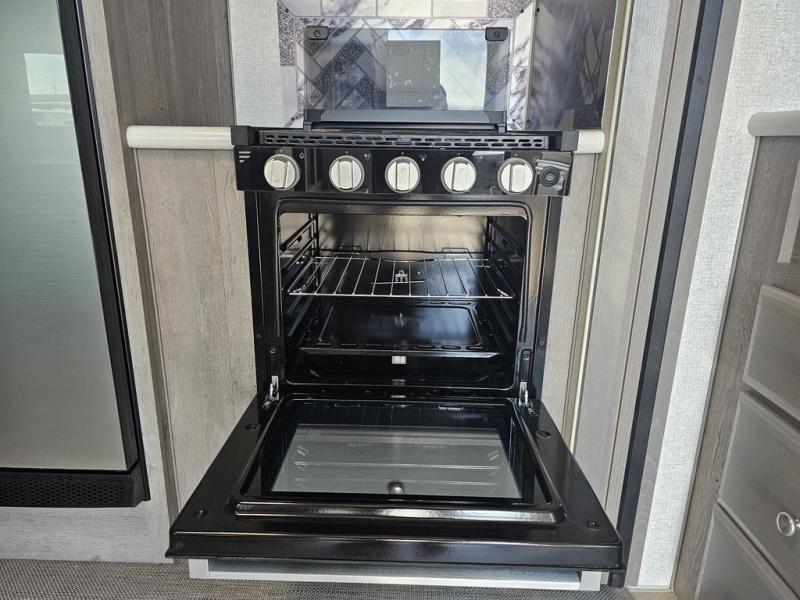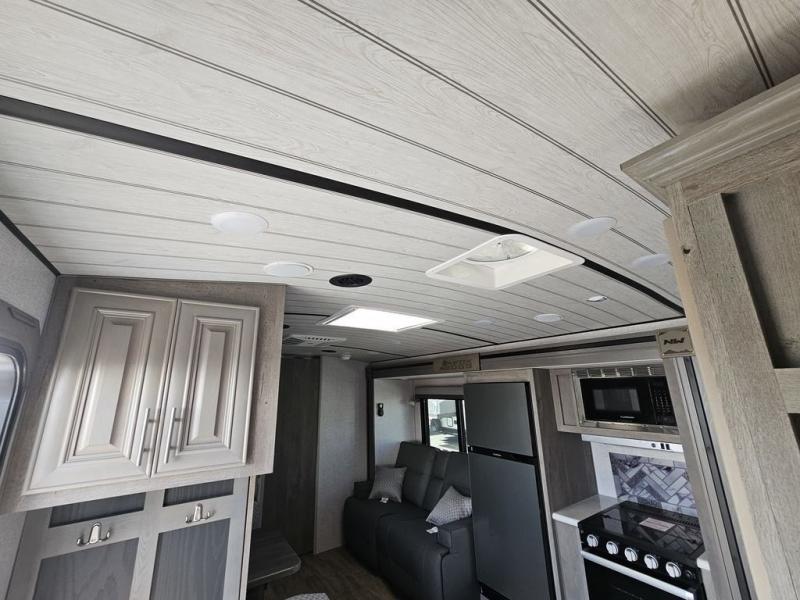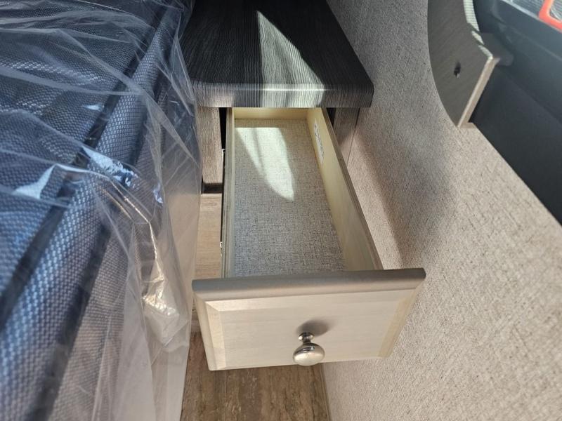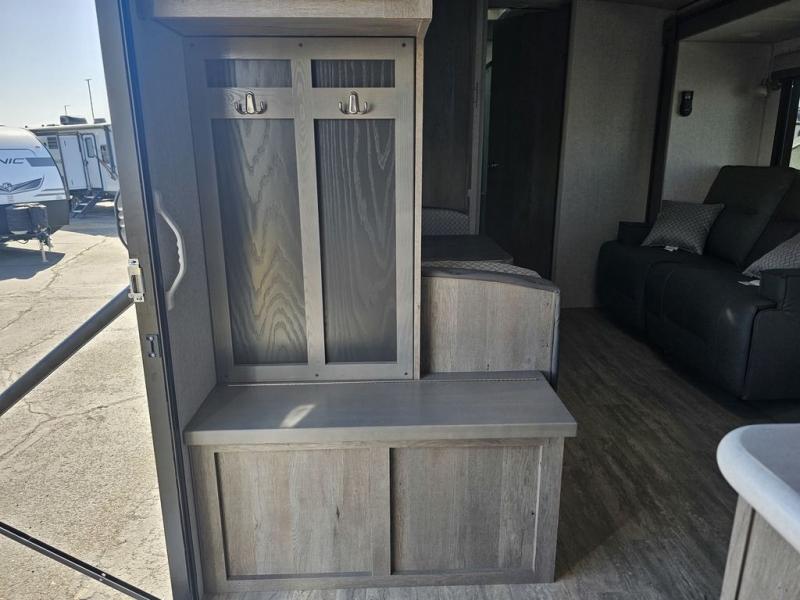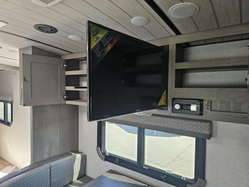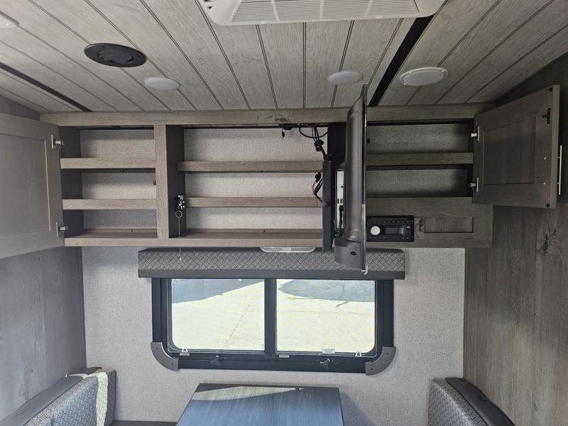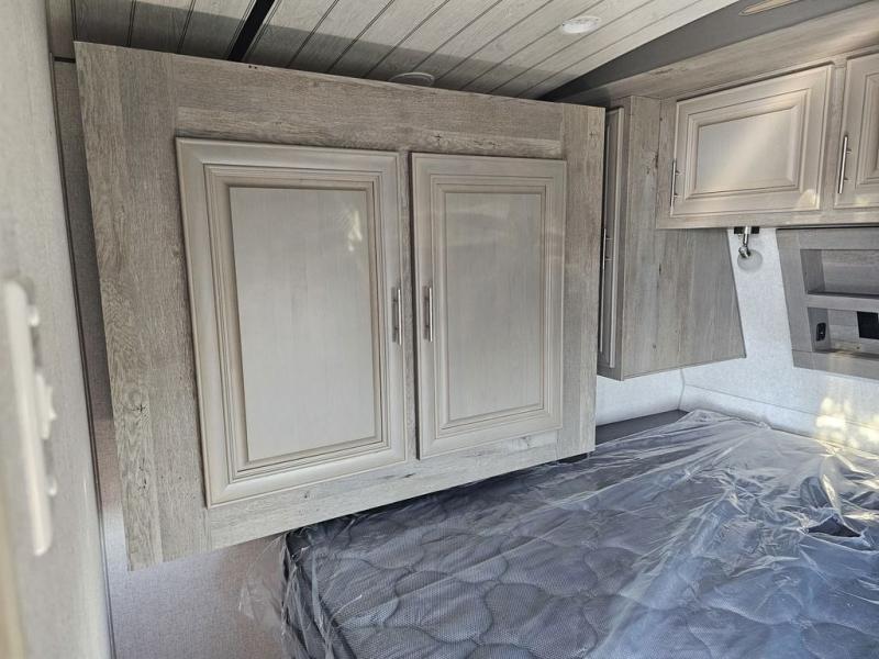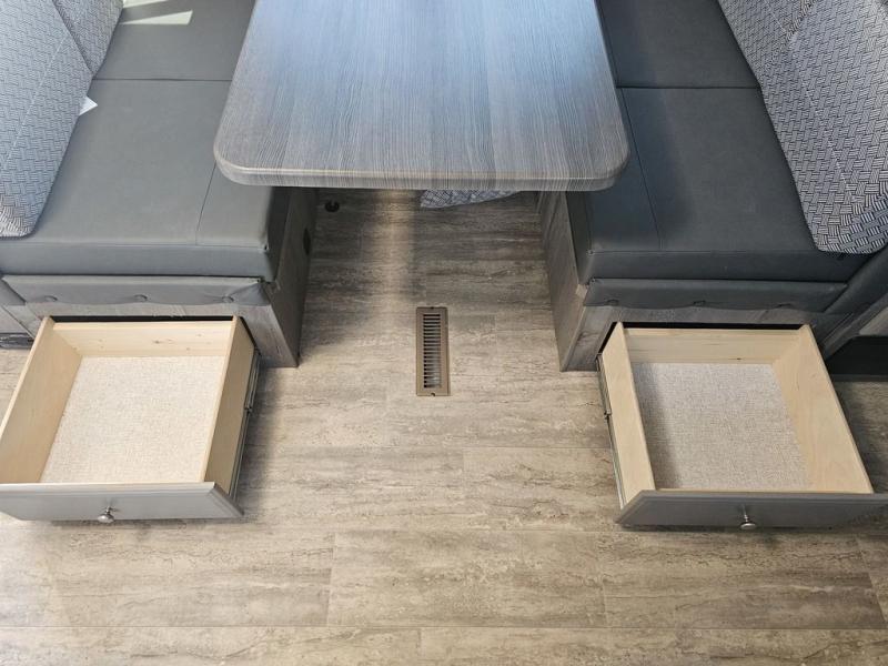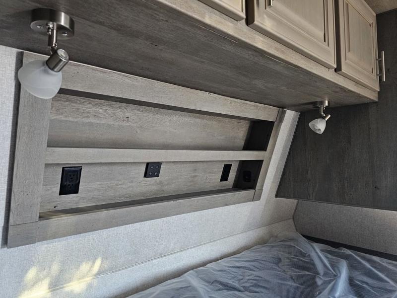 You will be enchanted by this travel trailer's amenities! The full rear bathroom provides a private and convenient space for freshening up. The kitchen has a fridge for keeping food and drinks fresh, a booth dinette for dining and socializing, and a three-burner cooktop for creating your favorite meals. Plus, overhead cabinets are placed throughout the trailer for ample storage of cookware and dishes. The living area boasts a spacious 62” sofa for relaxation, a mud bench for cleaning and storing outdoor gear, and a coat rack for hanging jackets and accessories. This unit's cozy front bedroom features two wardrobes on each side of the bed and a bigger one for storing clothing and essentials.