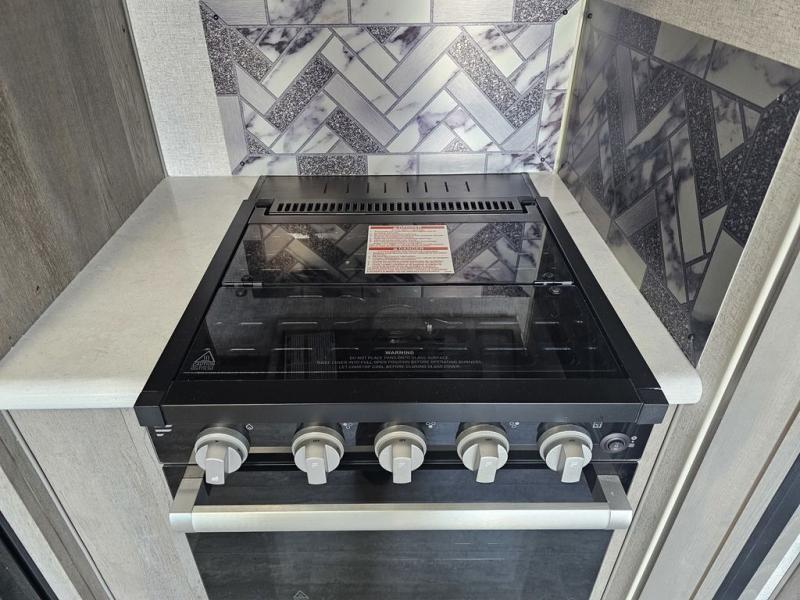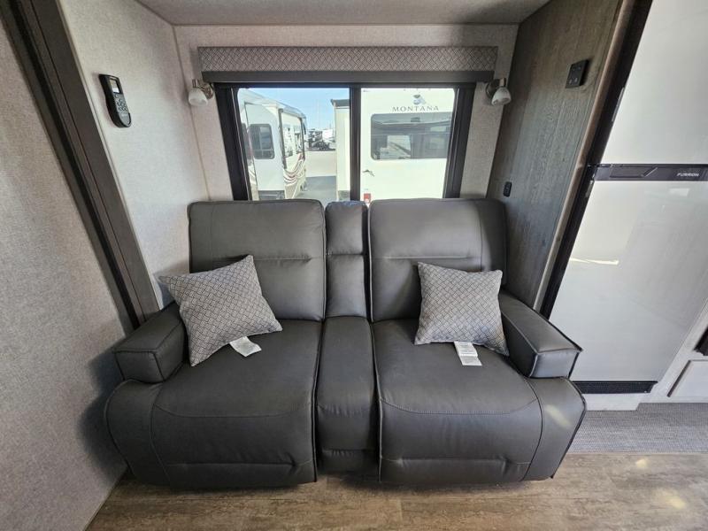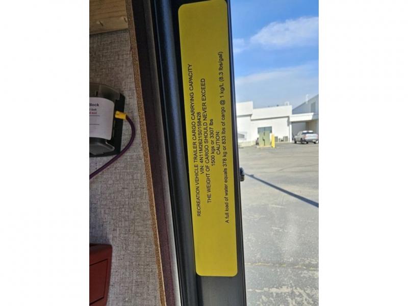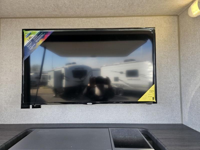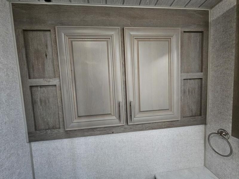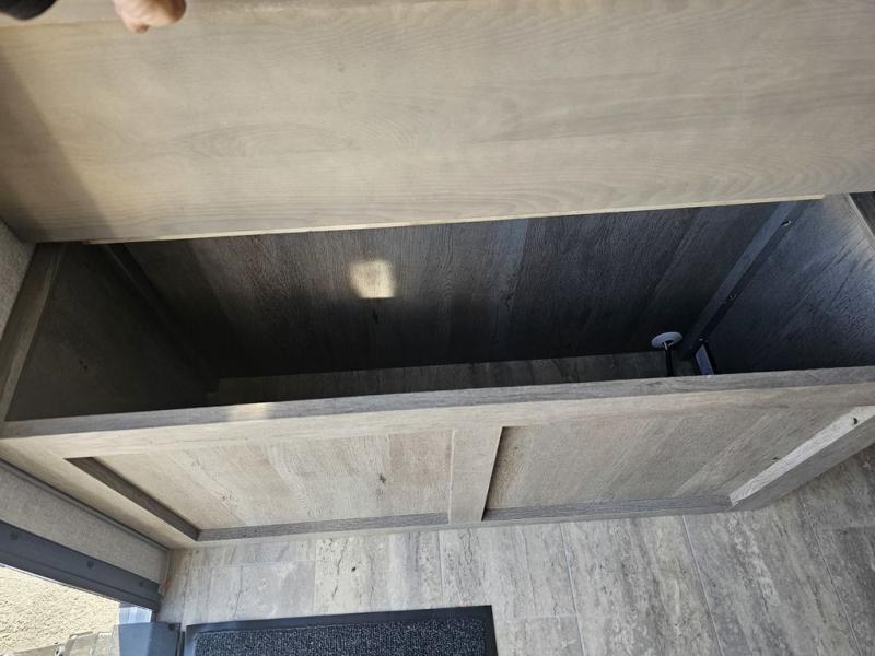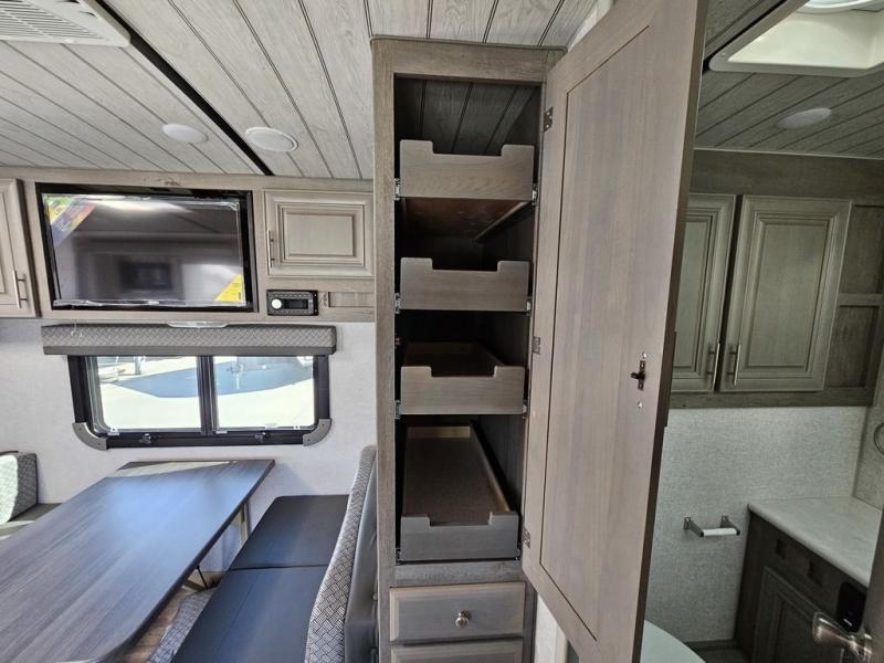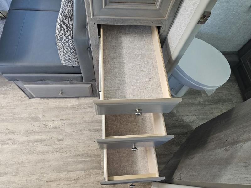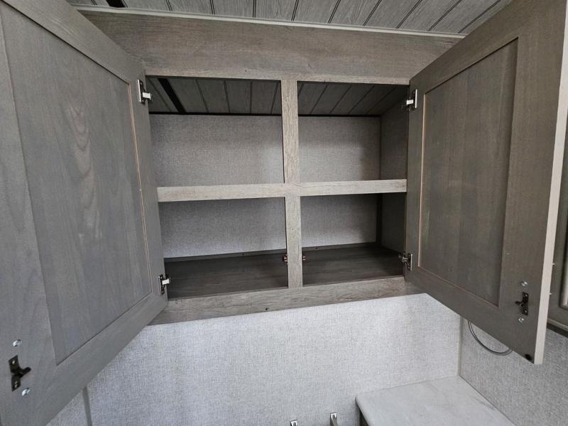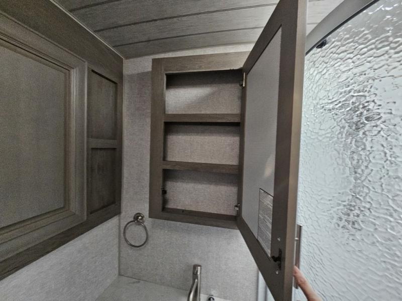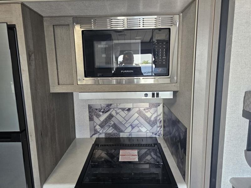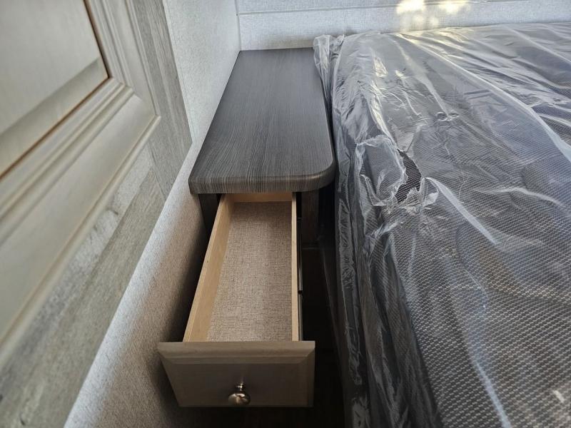 You will be enchanted by this travel trailer's amenities! The full rear bathroom provides a private and convenient space for freshening up. The kitchen has a fridge for keeping food and drinks fresh, a booth dinette for dining and socializing, and a three-burner cooktop for creating your favorite meals. Plus, overhead cabinets are placed throughout the trailer for ample storage of cookware and dishes. The living area boasts a spacious 62” sofa for relaxation, a mud bench for cleaning and storing outdoor gear, and a coat rack for hanging jackets and accessories. This unit's cozy front bedroom features two wardrobes on each side of the bed and a bigger one for storing clothing and essentials.