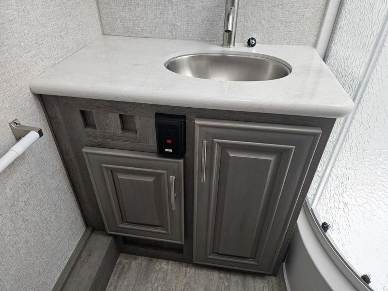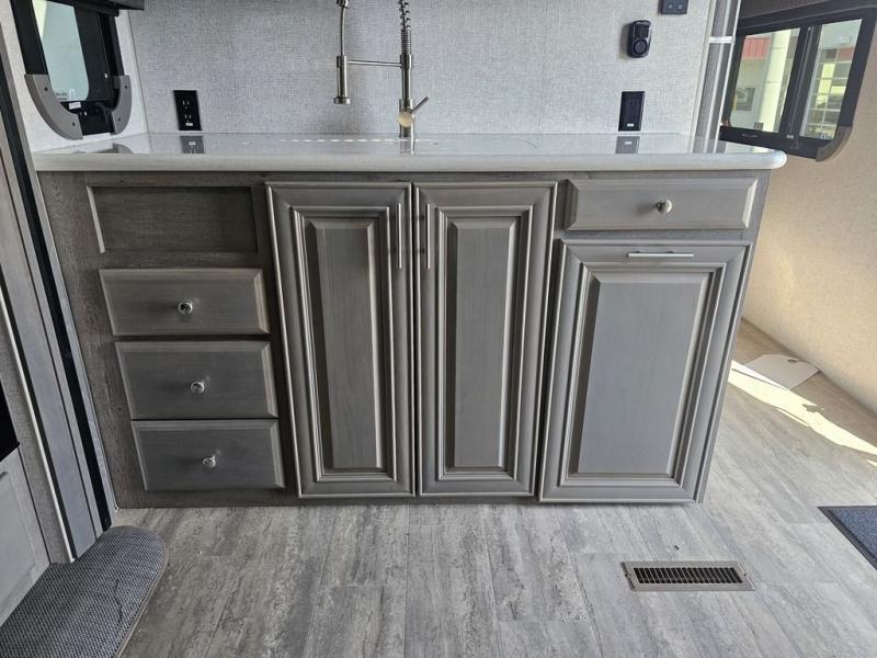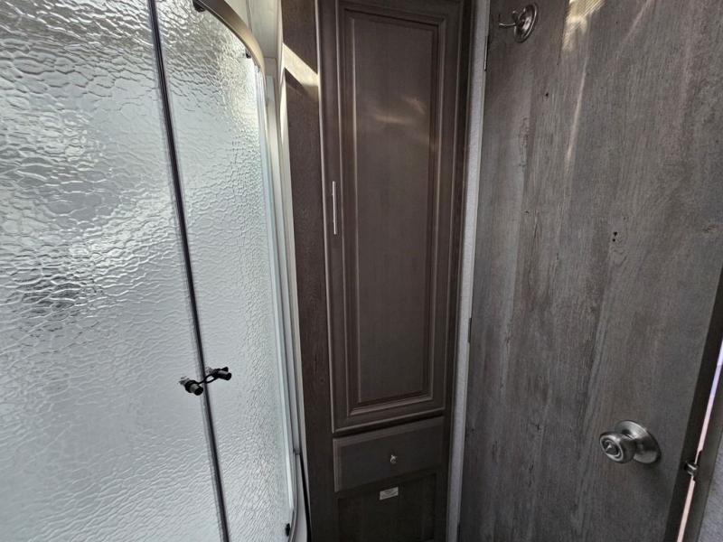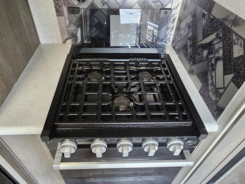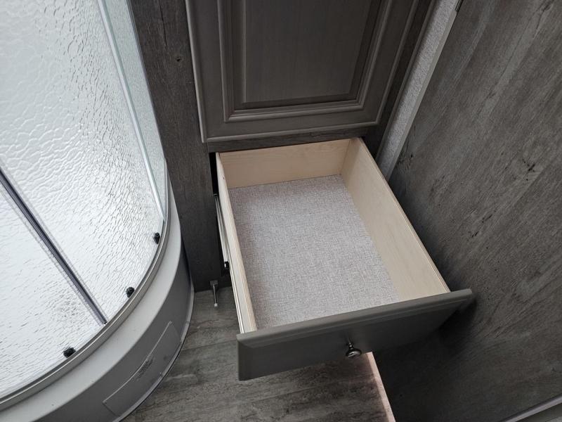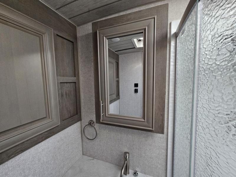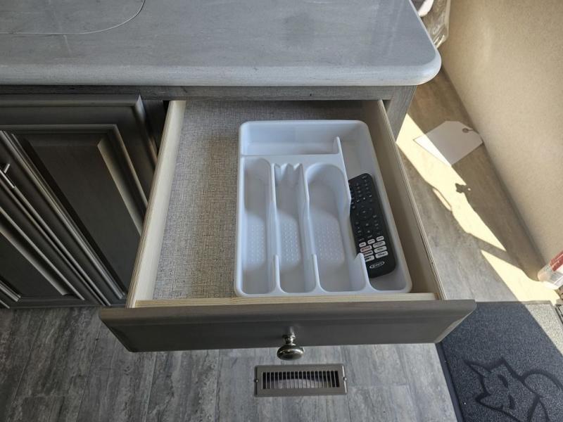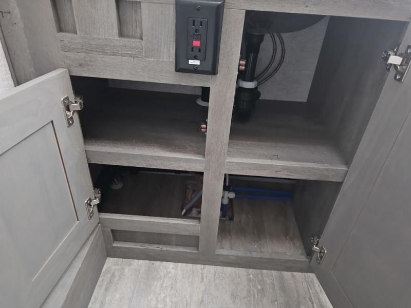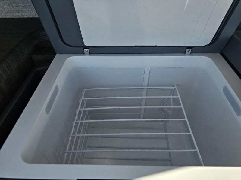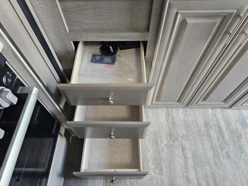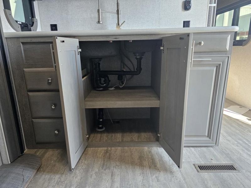 You will be enchanted by this travel trailer's amenities! The full rear bathroom provides a private and convenient space for freshening up. The kitchen has a fridge for keeping food and drinks fresh, a booth dinette for dining and socializing, and a three-burner cooktop for creating your favorite meals. Plus, overhead cabinets are placed throughout the trailer for ample storage of cookware and dishes. The living area boasts a spacious 62” sofa for relaxation, a mud bench for cleaning and storing outdoor gear, and a coat rack for hanging jackets and accessories. This unit's cozy front bedroom features two wardrobes on each side of the bed and a bigger one for storing clothing and essentials.