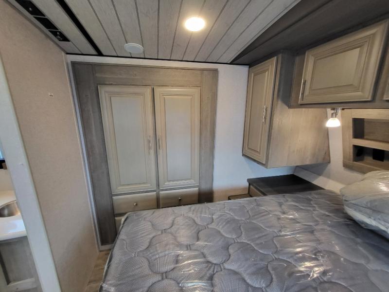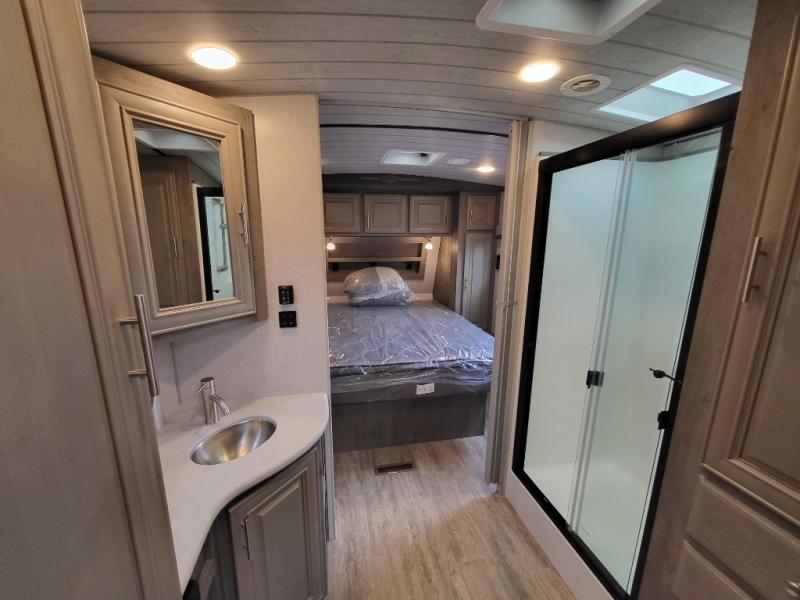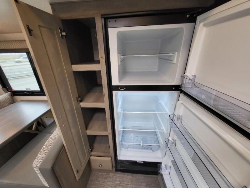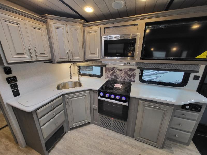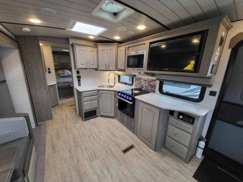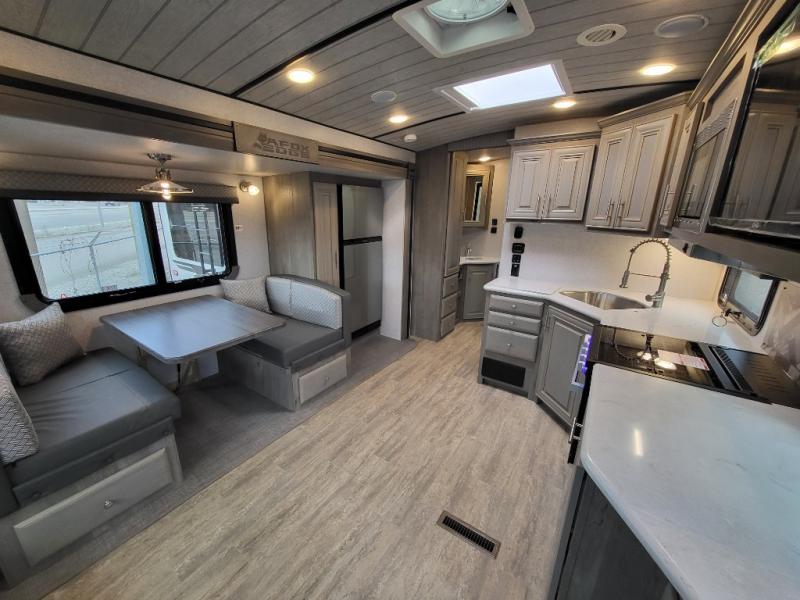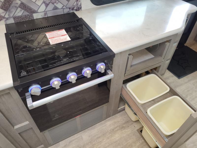 It will be so easy to enjoy camping trips in this spacious travel trailer for three to four. You will have the front master bedroom all to yourselves with one of the dual entry doors, a queen bed, wardrobe slide out, and quick access into the walk-through bath. A booth dinette can serve as dining space and sleeping space since it converts to a 40" x 74" sleeping space for one adult or two little ones. The fully-equipped kitchen includes a three burner range, residential-style microwave with an air fryer, plus a pantry and 10 cu. ft. 12V refrigerator for food storage. After dinner is clean up, you can relax on the rear theater seating and watch a movie on the 32" 12V TV, or head outdoors to relax under the 18' LED awning!