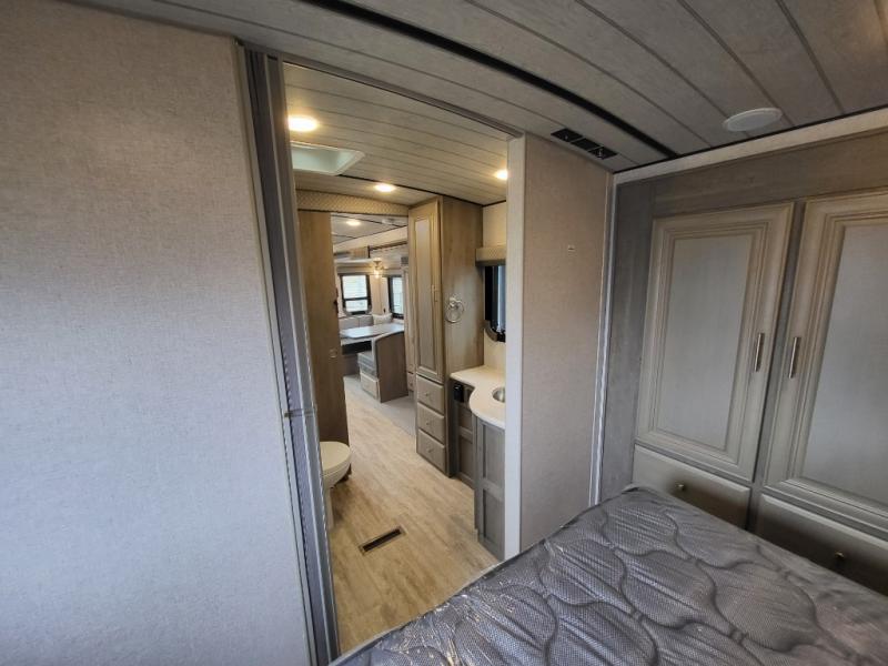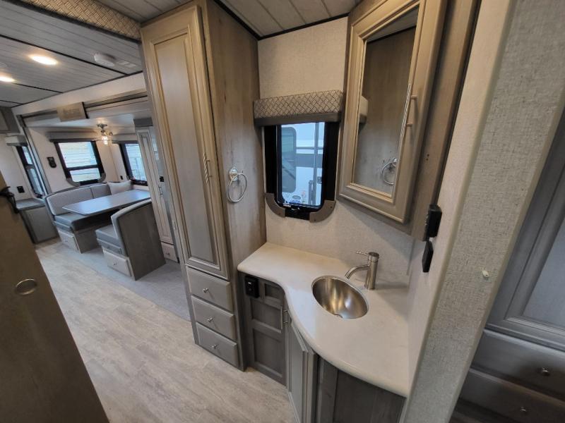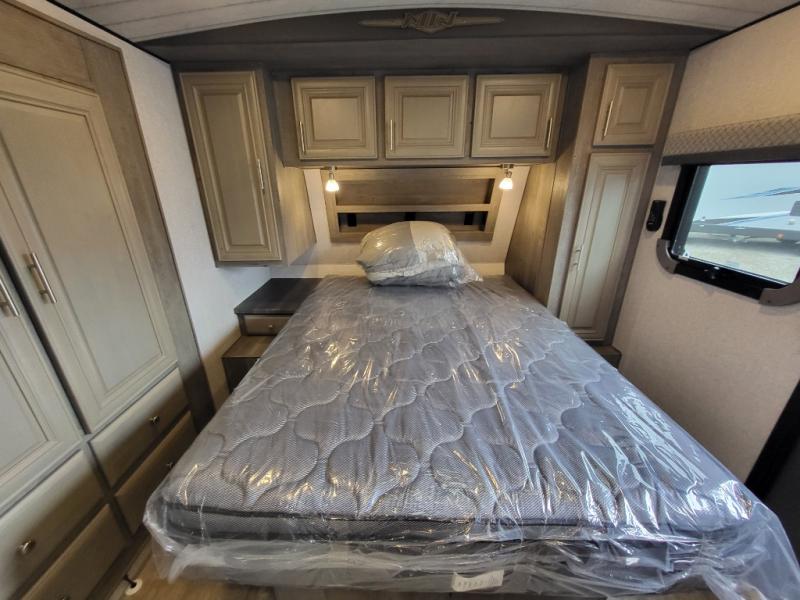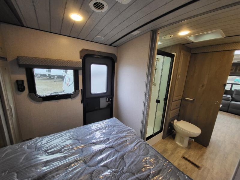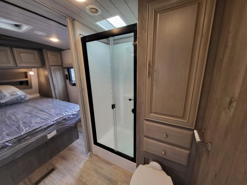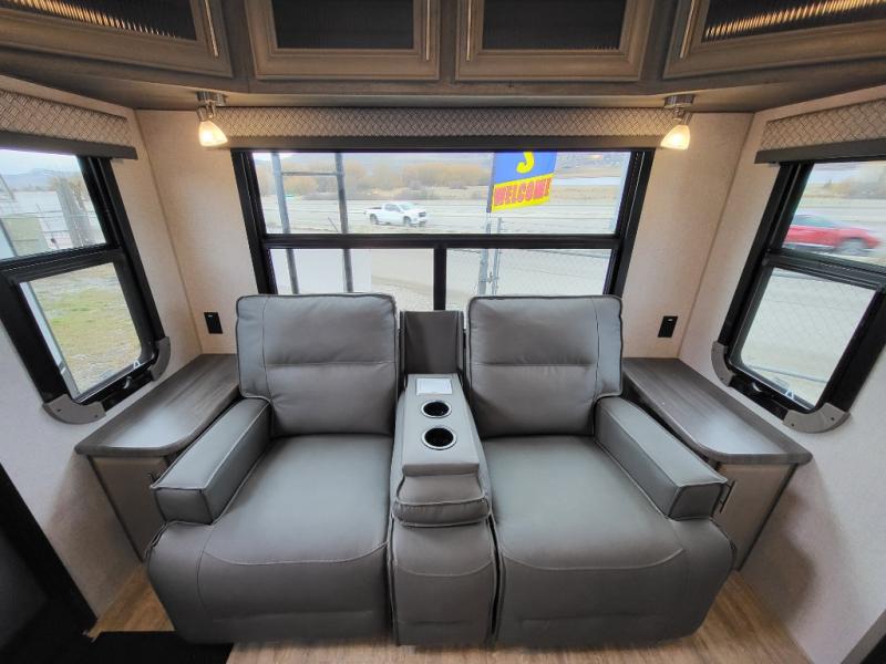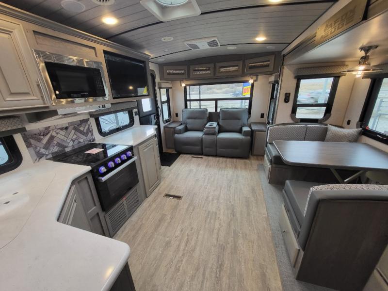 It will be so easy to enjoy camping trips in this spacious travel trailer for three to four. You will have the front master bedroom all to yourselves with one of the dual entry doors, a queen bed, wardrobe slide out, and quick access into the walk-through bath. A booth dinette can serve as dining space and sleeping space since it converts to a 40" x 74" sleeping space for one adult or two little ones. The fully-equipped kitchen includes a three burner range, residential-style microwave with an air fryer, plus a pantry and 10 cu. ft. 12V refrigerator for food storage. After dinner is clean up, you can relax on the rear theater seating and watch a movie on the 32" 12V TV, or head outdoors to relax under the 18' LED awning!