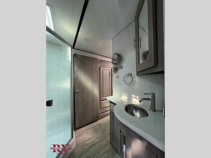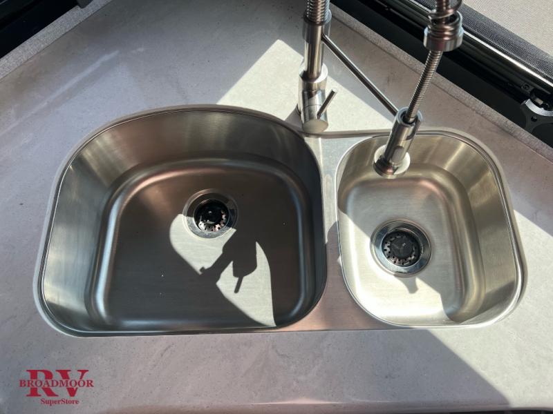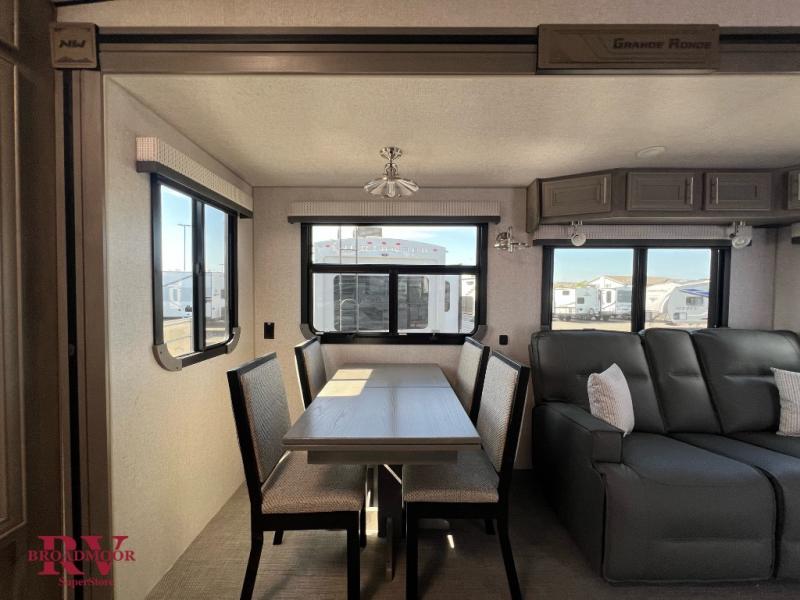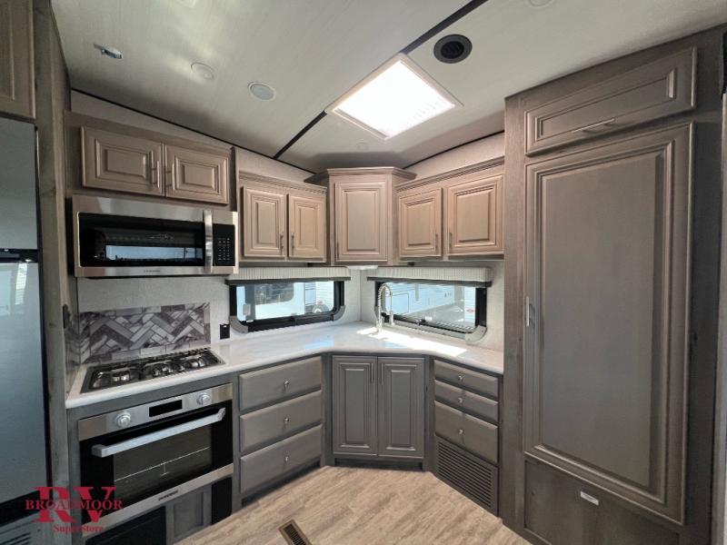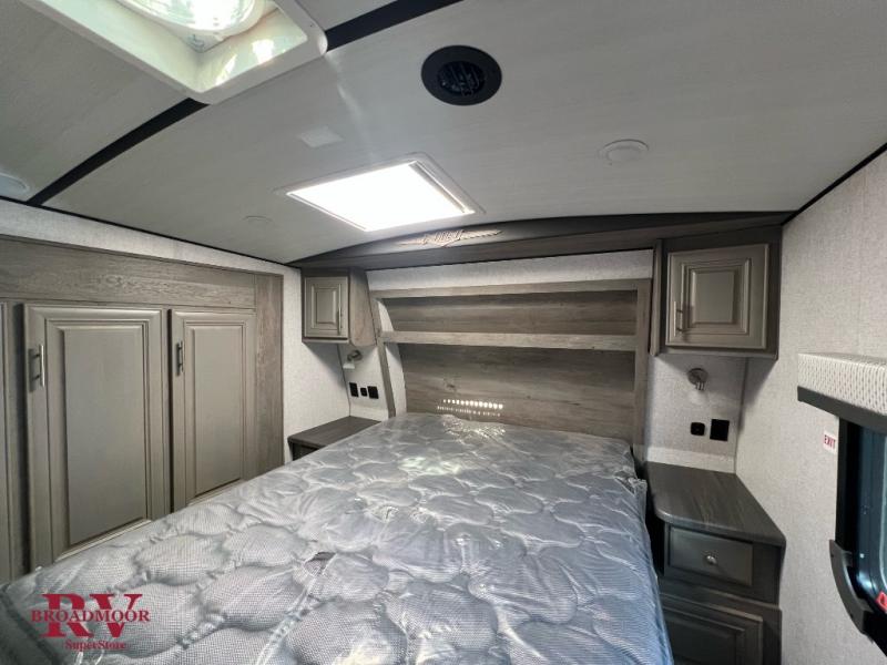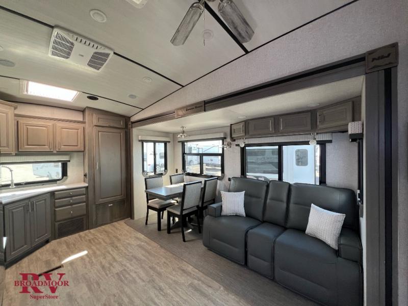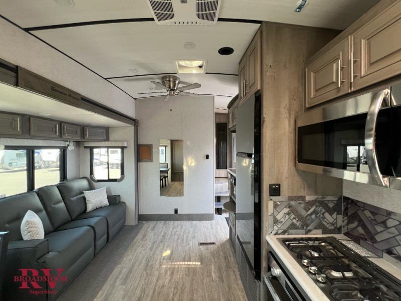 The perfect couples fifth wheel is waiting for you! From the front private bedroom with access to the full bathroom, to the spacious living area with a slide out giving you more interior space to relax and unwind, you will find something to love each time you travel. The rear kitchen offers solid surface countertops and a three burner range, and you can dine at the free-standing dinette with four chairs. You might choose to replace the table and chairs with an optional booth Dream dinette instead. There is a 32" LED Smart TV to watch when you are inside, and you will find two pantries so your snacks and ingredients are organized and ready to grab. And you will find ample storage throughout the interior for all your things as well as along the exterior.