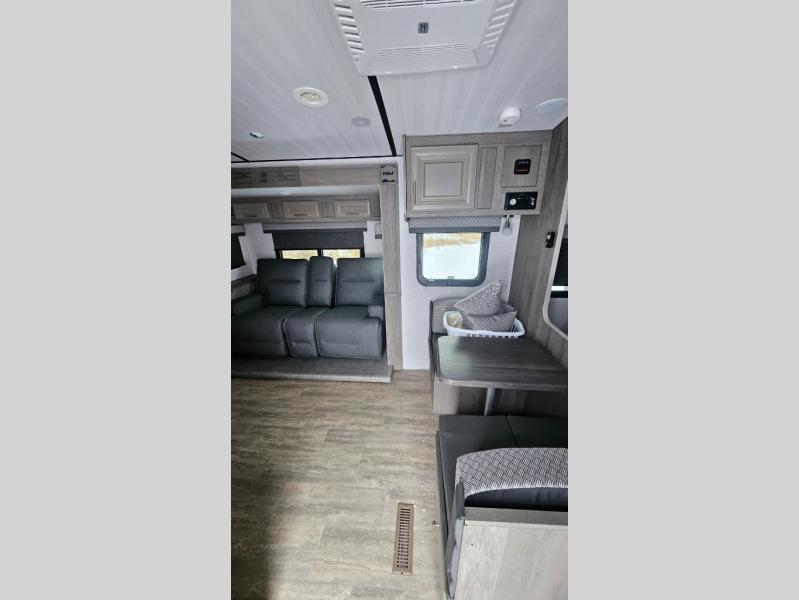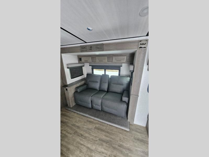 Get some sun and soak up nature with this Northwood Arctic Fox North Fork travel trailer! You'll have fun spending time with the family as you play a game together on the booth dinette or watch a movie on the 32" LED TV. The kitchen skylight with a shade will bring in some natural light while you prepare dinner on the three-burner range, and if you close the privacy curtain, you can relax separately up front on the RV queen bed. You will also have some options with this model, like the cafe table with a magazine rack in place of the booth dinette, or the mini dinette and theater seating option in place of the jackknife sofa!