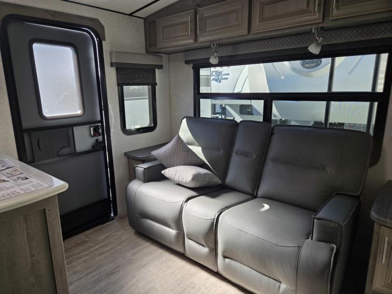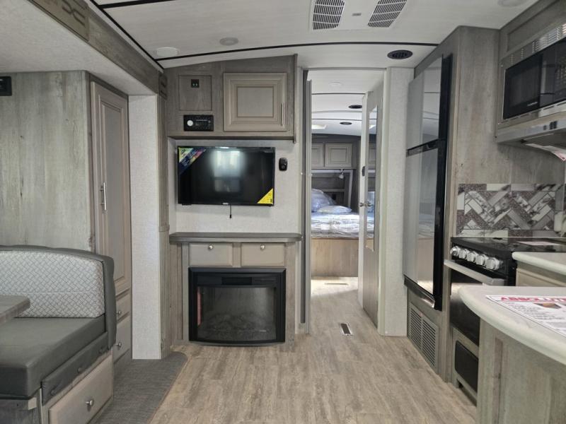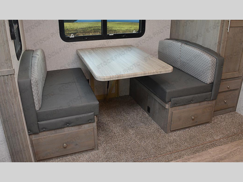 You won't have anything stopping you from having a good time when you have this Arctic Fox North Fork travel trailer! A front queen-size bed in the master suite is a comfortable place to lay down each night, and you will appreciate having discreet access into the bathroom from your bedroom so that you can clean up in the neo-angled shower each morning, and there is a private toilet so two people can use this room at once. After you are ready for the day, you can grab a bowl of cereal from the pantry or fry up some eggs on the three-burner range. There is also a booth dinette that converts to a 40" x 72" sleeping area for guests, plus swivel rockers with end tables where you can enjoy your coffee at each morning. You can even switch out the swivel rockers for optional theater seating for even more comfort!